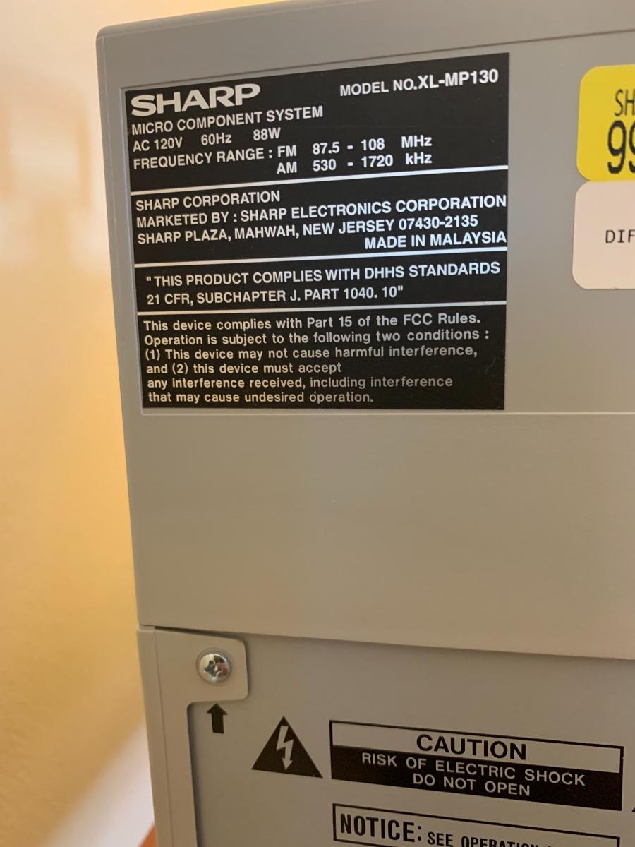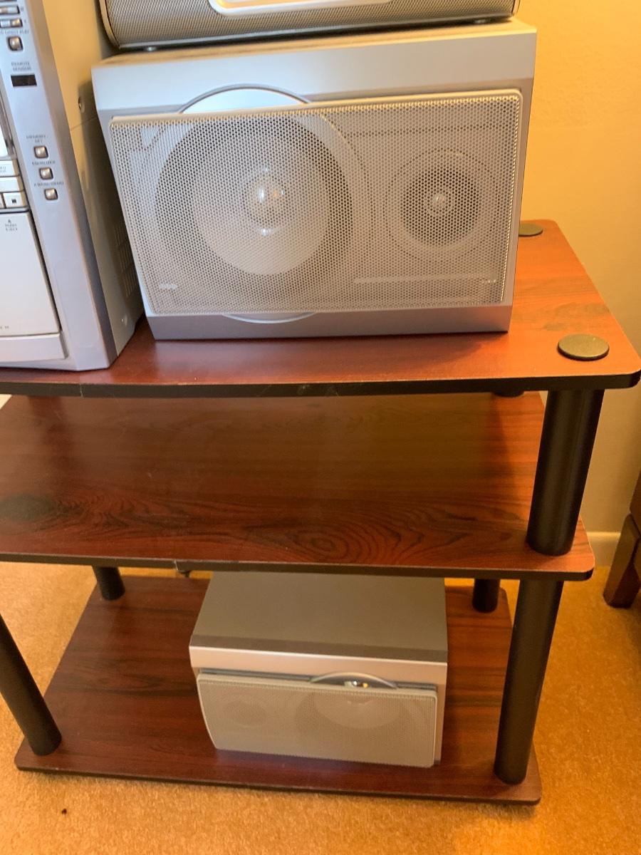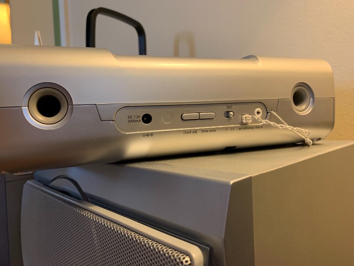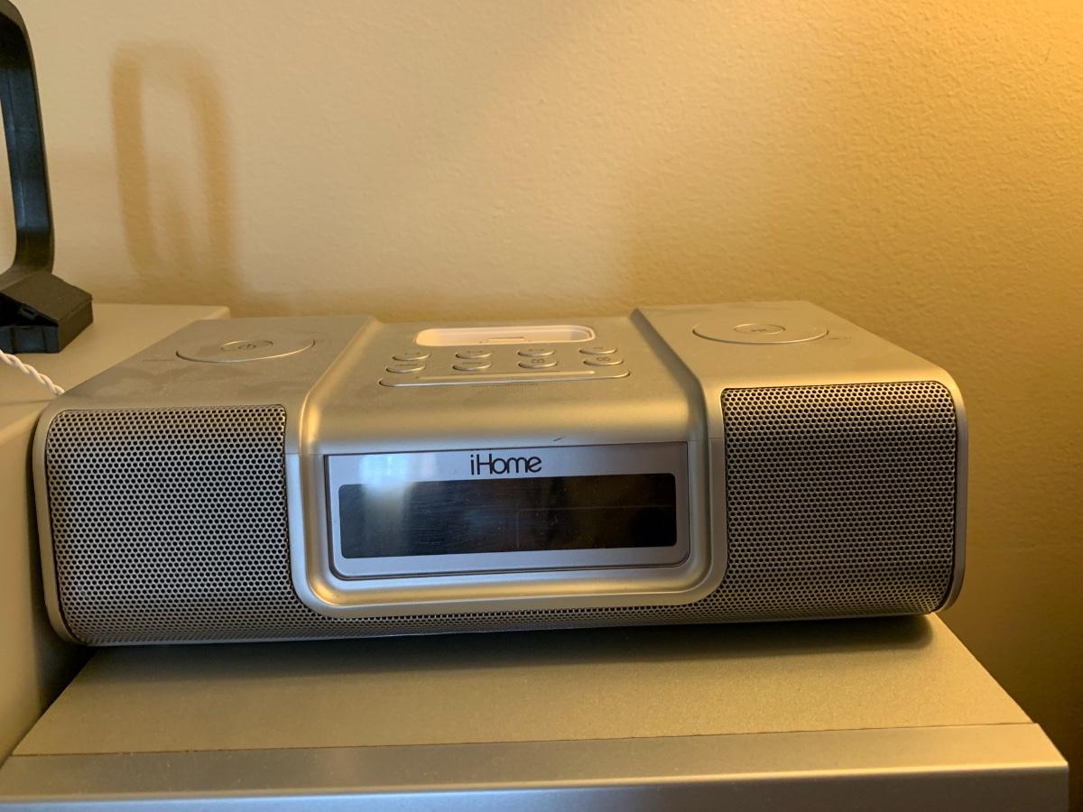 Mini system plays 5 cd's, tape and radio. Has antenna. Good sound. Comes with IHome IPod speaker dock.