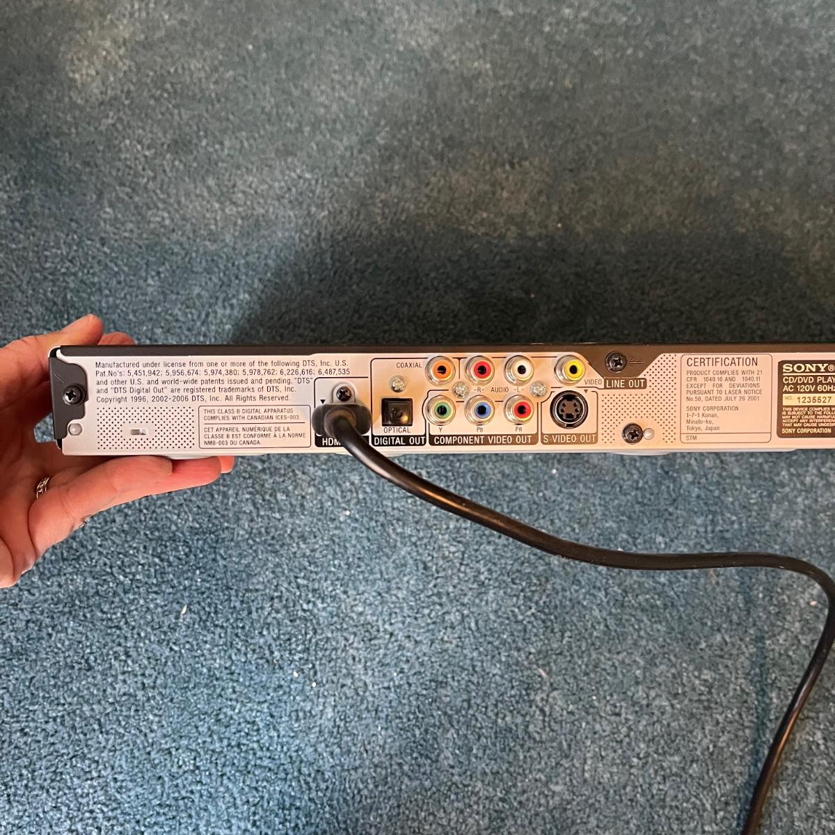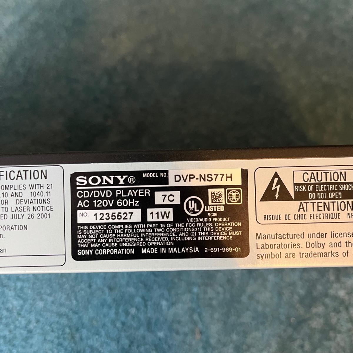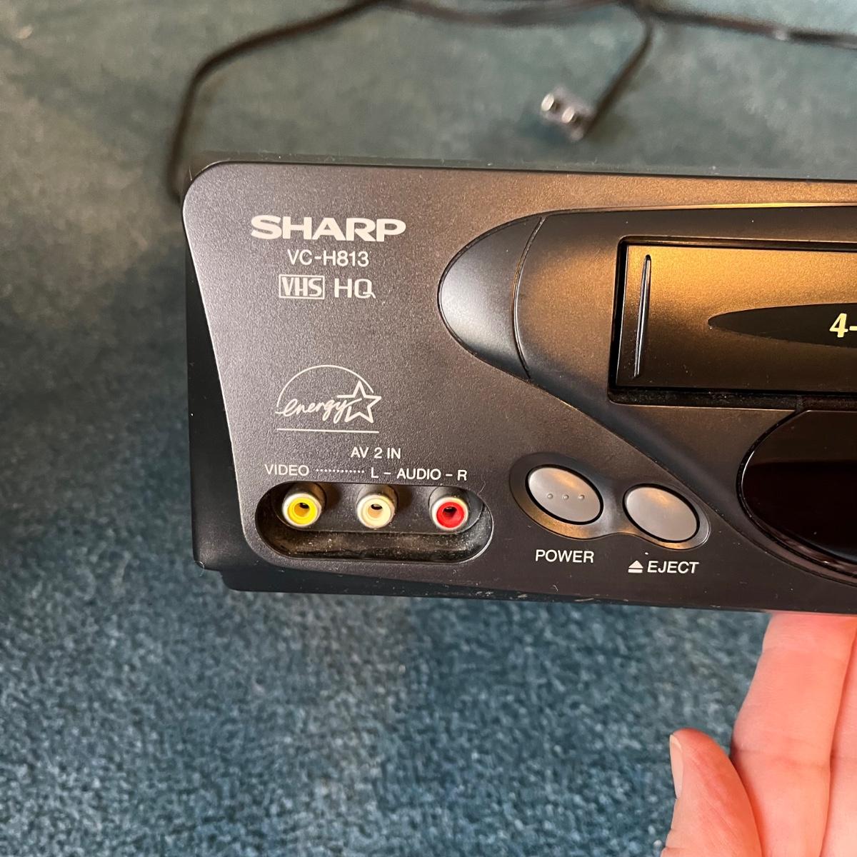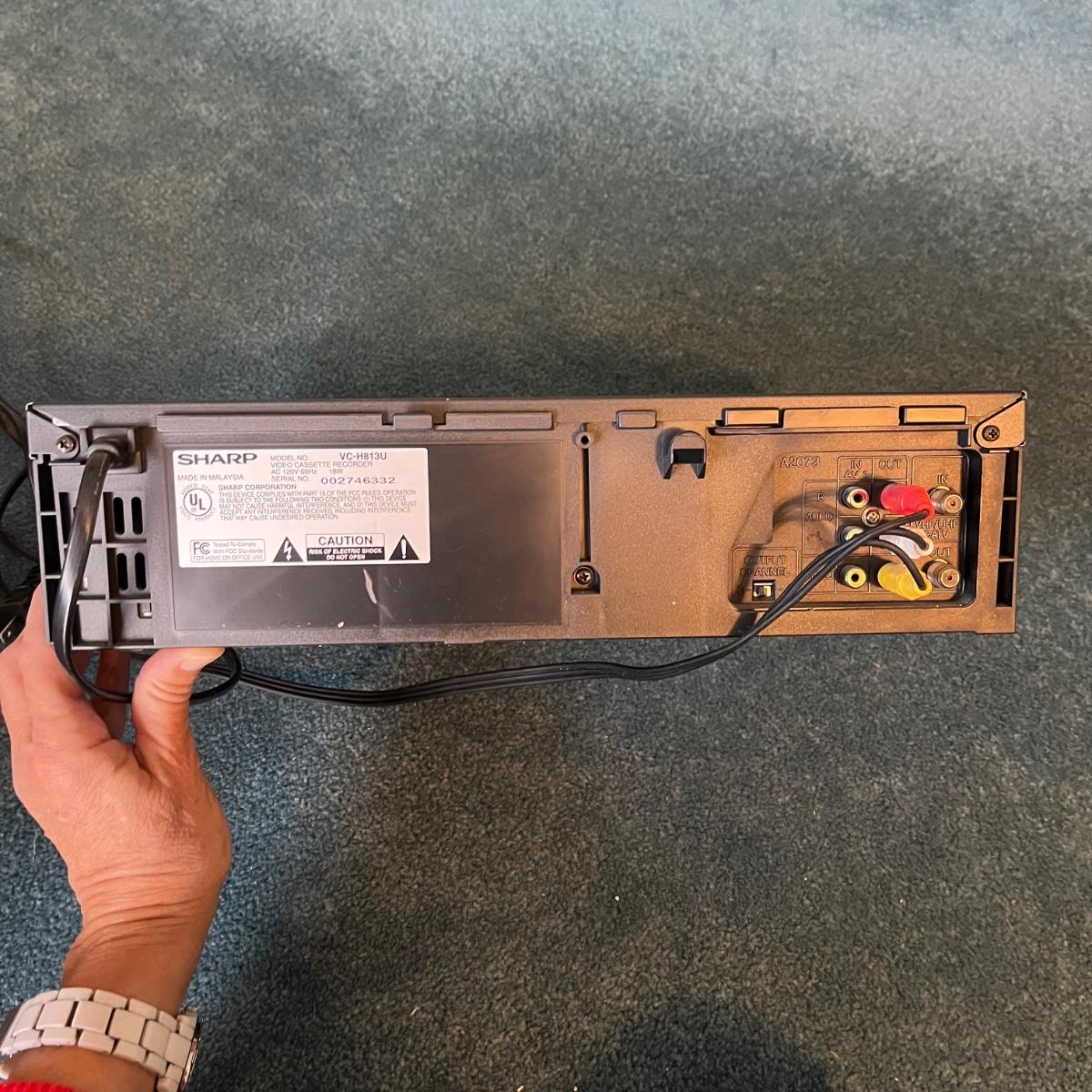 One Sony DVD player with remote and one Sharp VCR player with remote. Both powered up when plugged in. Includes all cords shown.