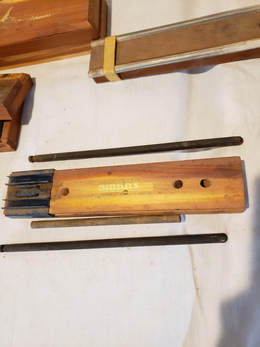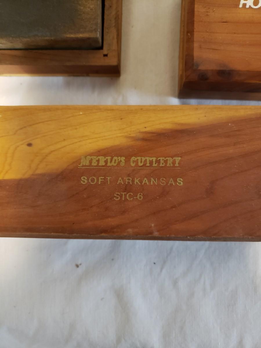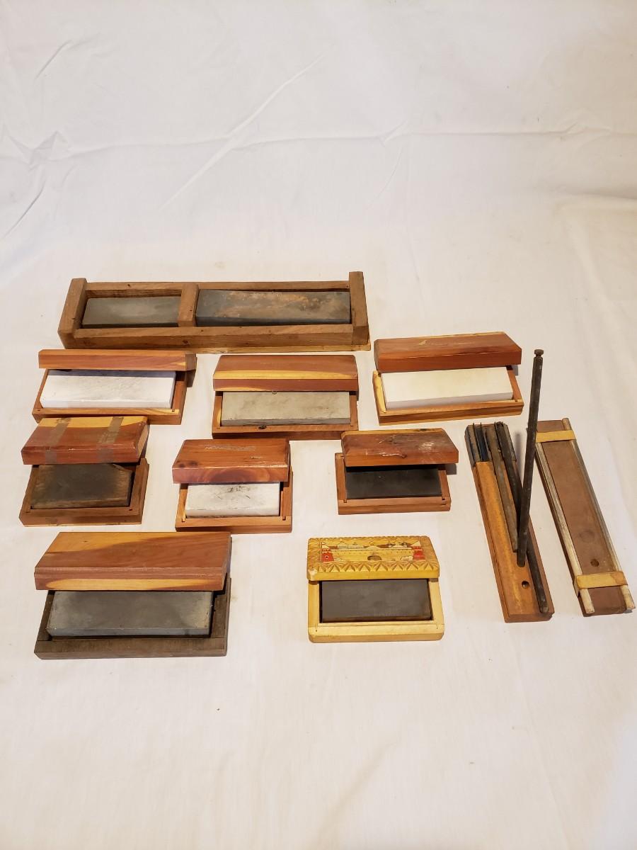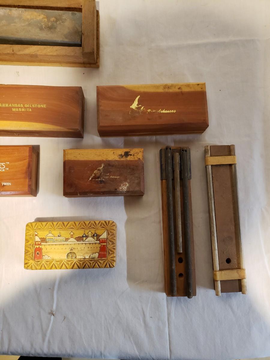 Eleven sharpening stones in boxes or in wooden containers. The largest box with a lid is 7"x3" and the largest open box containing two stones is 15"x4". Many of the boxes have the name brand printed on the lid, see pictures for brand names. Shipping available.