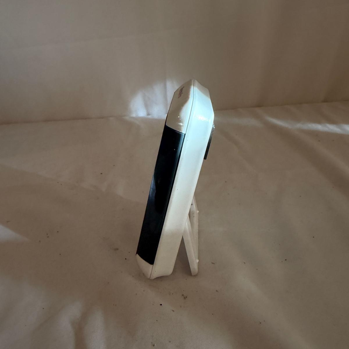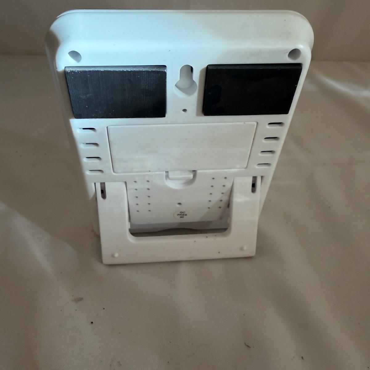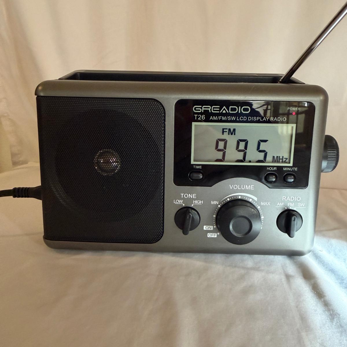 Lot includes a Sharper Image clock/thermometer/calendar, a Greadio AM/FM/SW portable radio and a ThermPro thermometer. Clock measures 12” x 3” x 7”H.