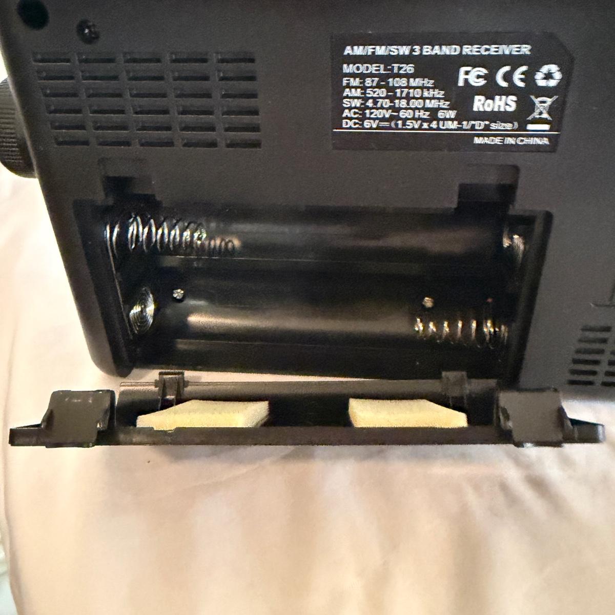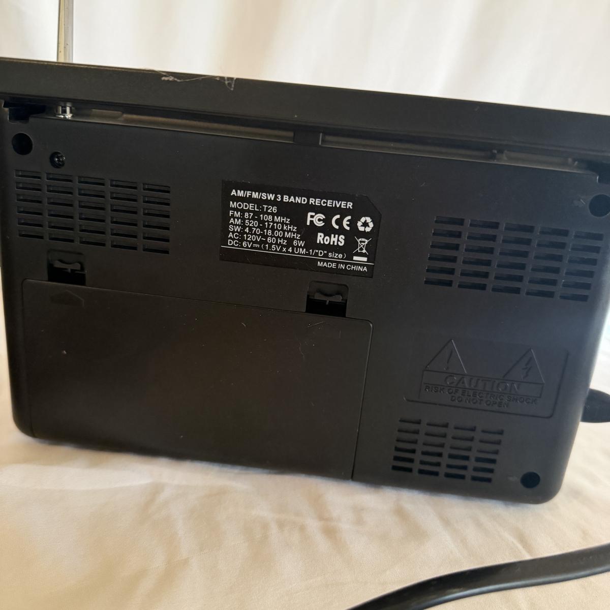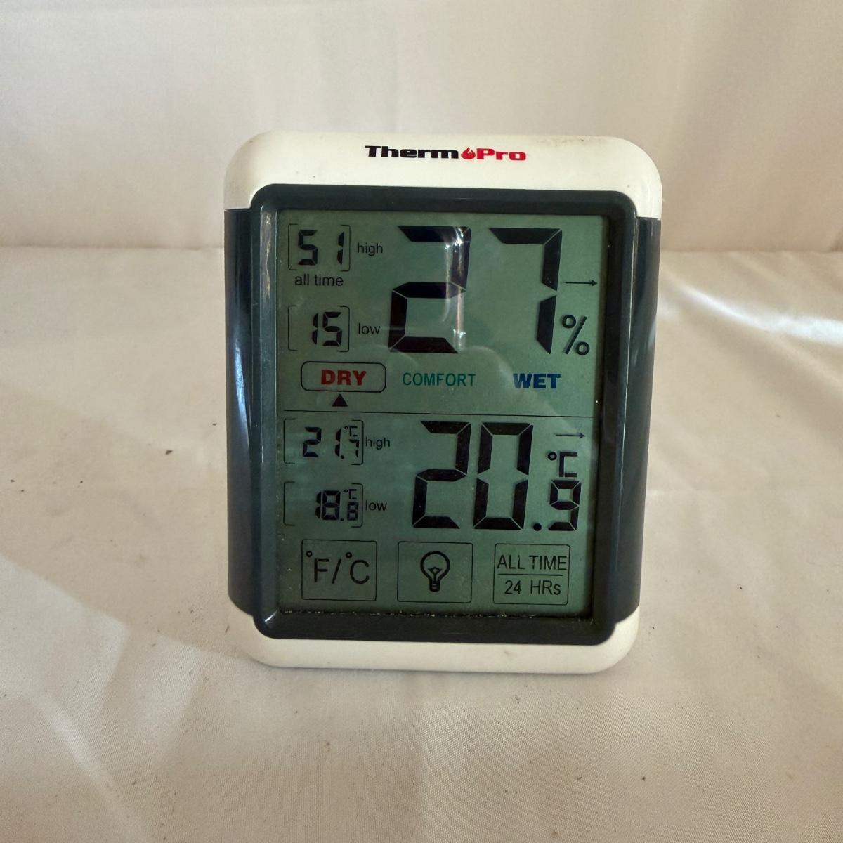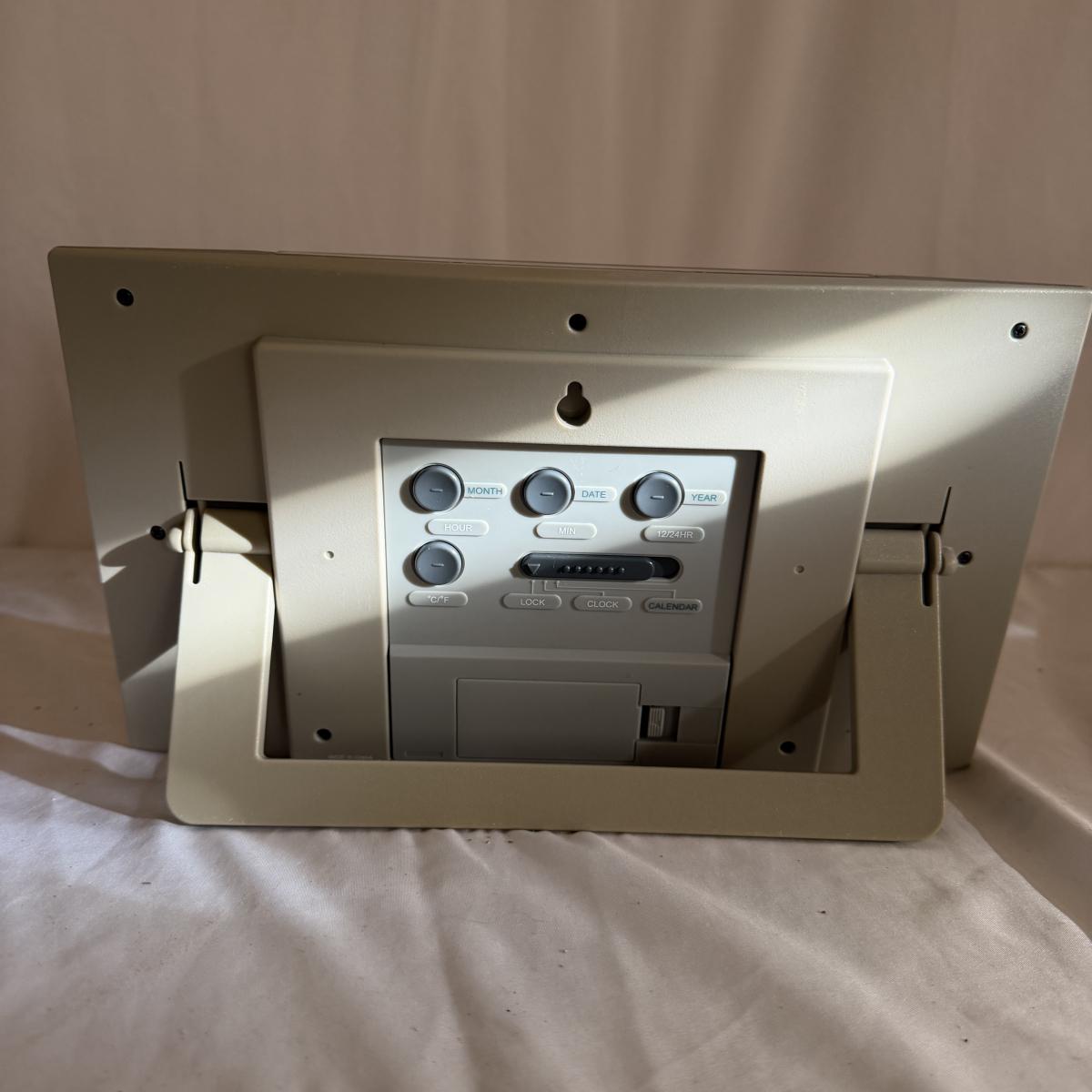 Lot includes a Sharper Image clock/thermometer/calendar, a Greadio AM/FM/SW portable radio and a ThermPro thermometer. Clock measures 12” x 3” x 7”H.