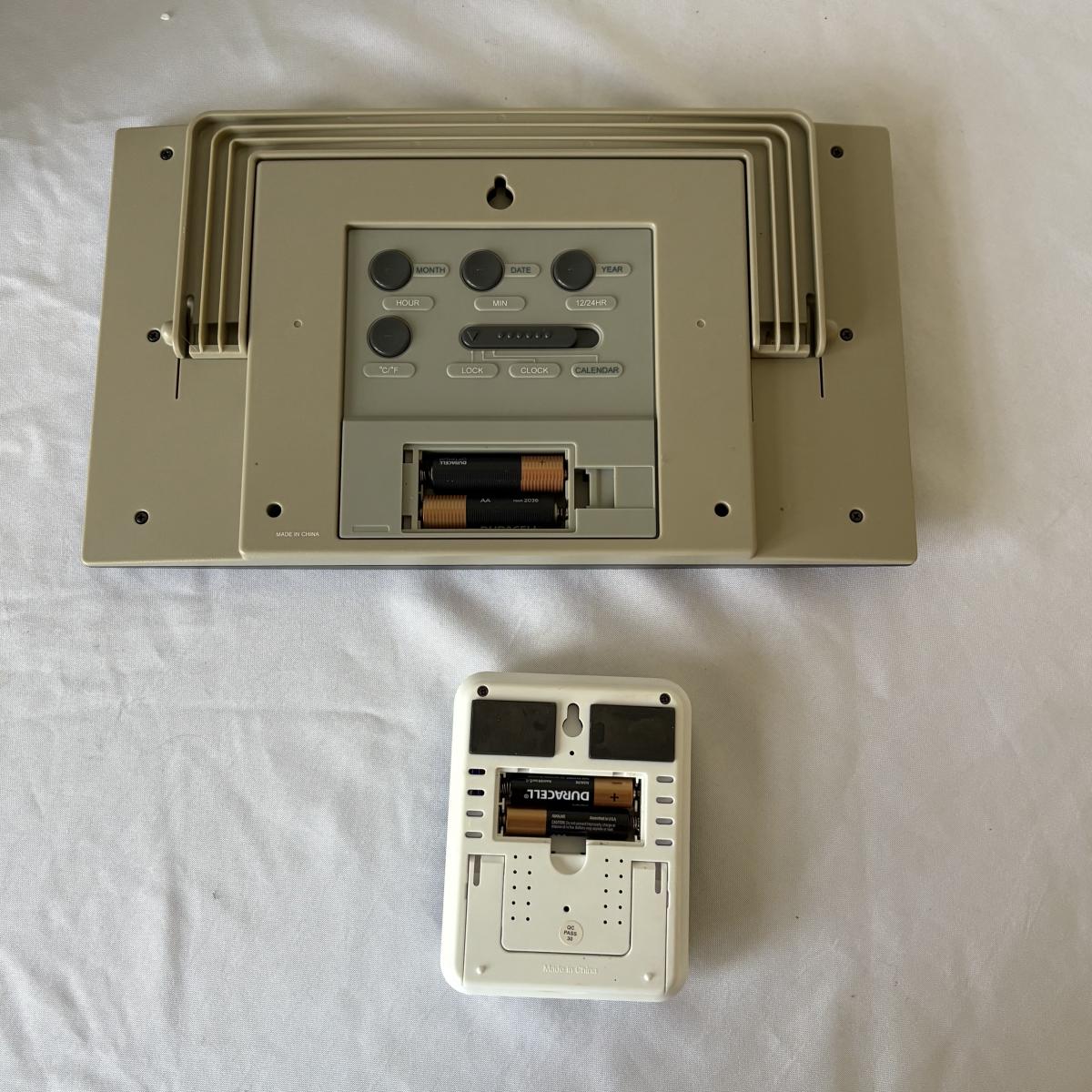 Lot includes a Sharper Image clock/thermometer/calendar, a Greadio AM/FM/SW portable radio and a ThermPro thermometer. Clock measures 12” x 3” x 7”H. All items powered on.