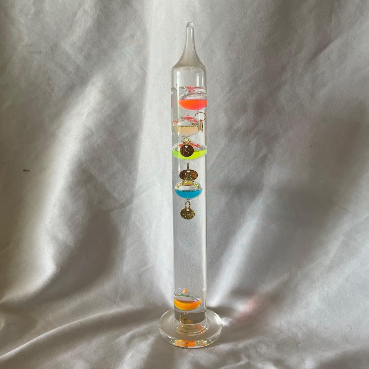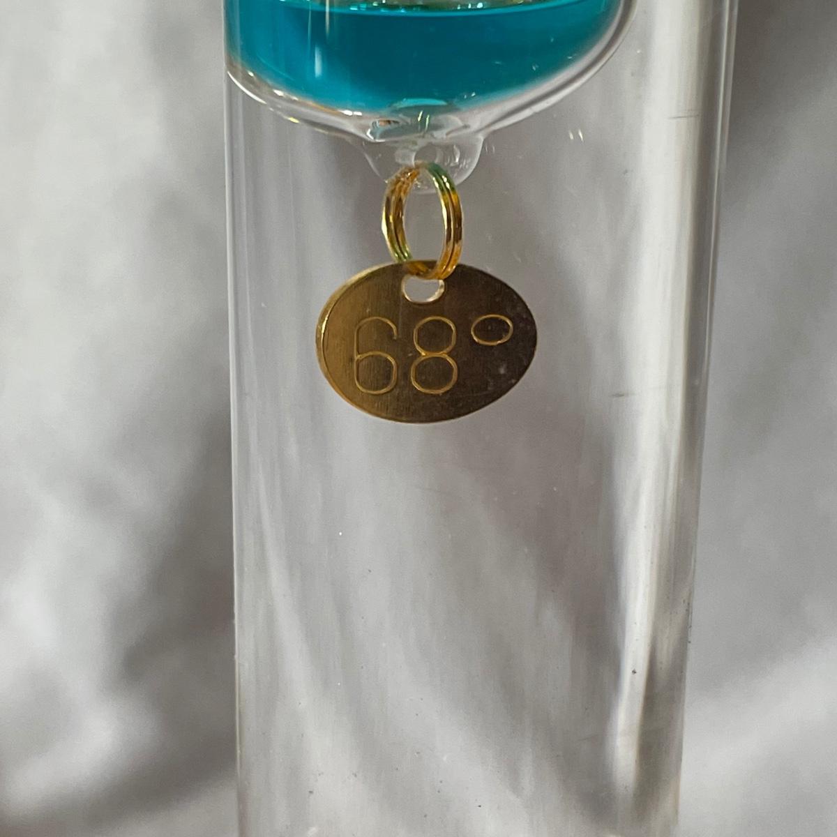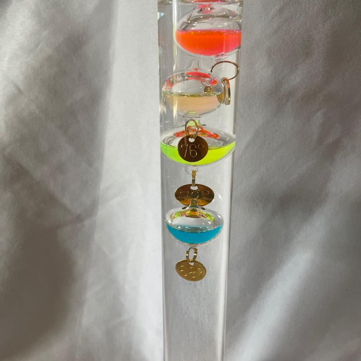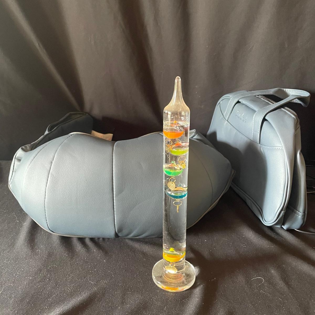 This Bruntman neck & shoulder massage comes with its carry case and is model number BRSNBM1. It worked when tested and is in excellent condition. The Galileo Thermometer is glass with floating, weighted orbs that move in the liquid as the temperature changes, it measures 3”d x 11”.