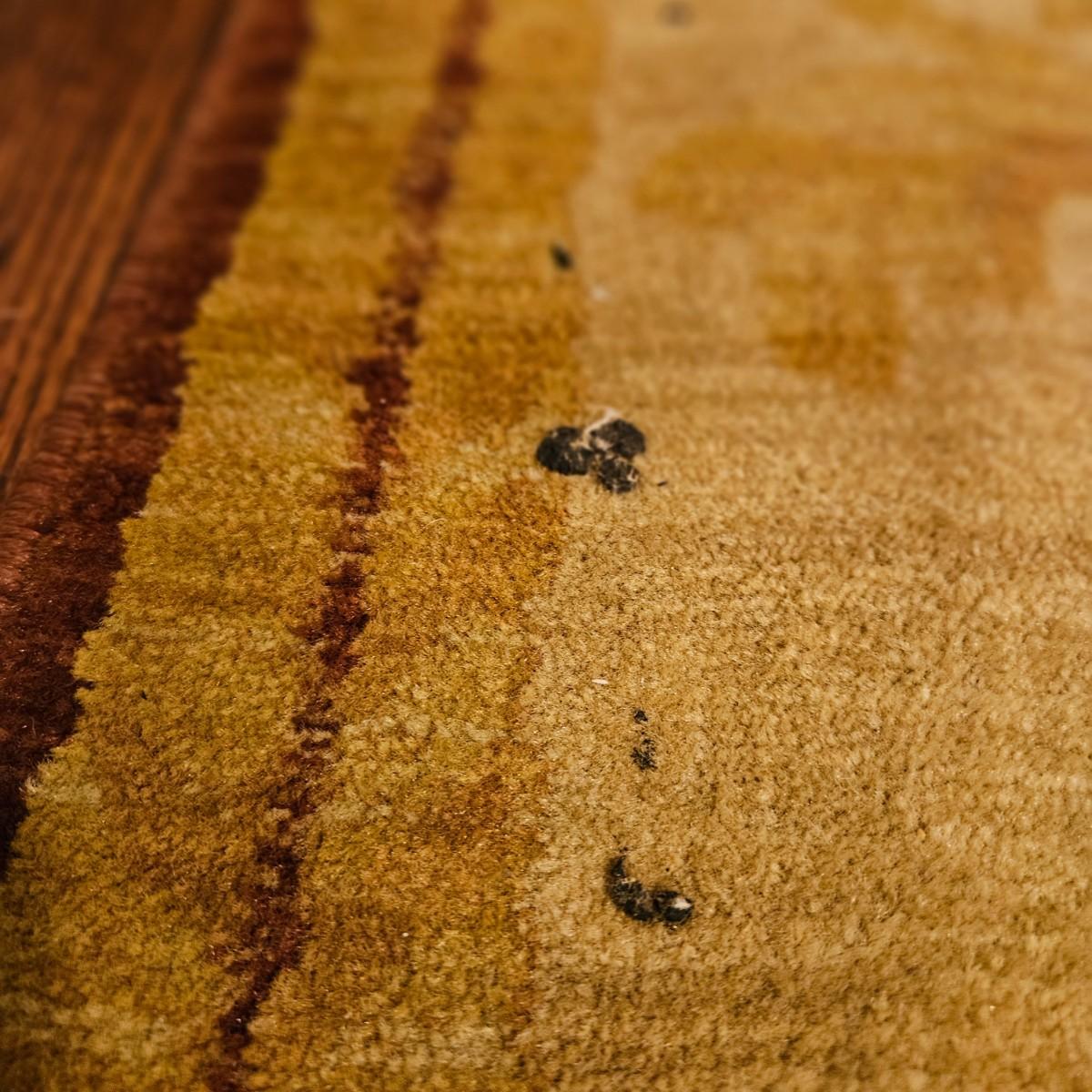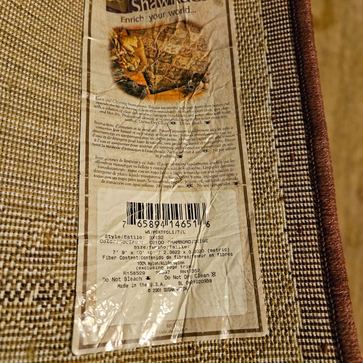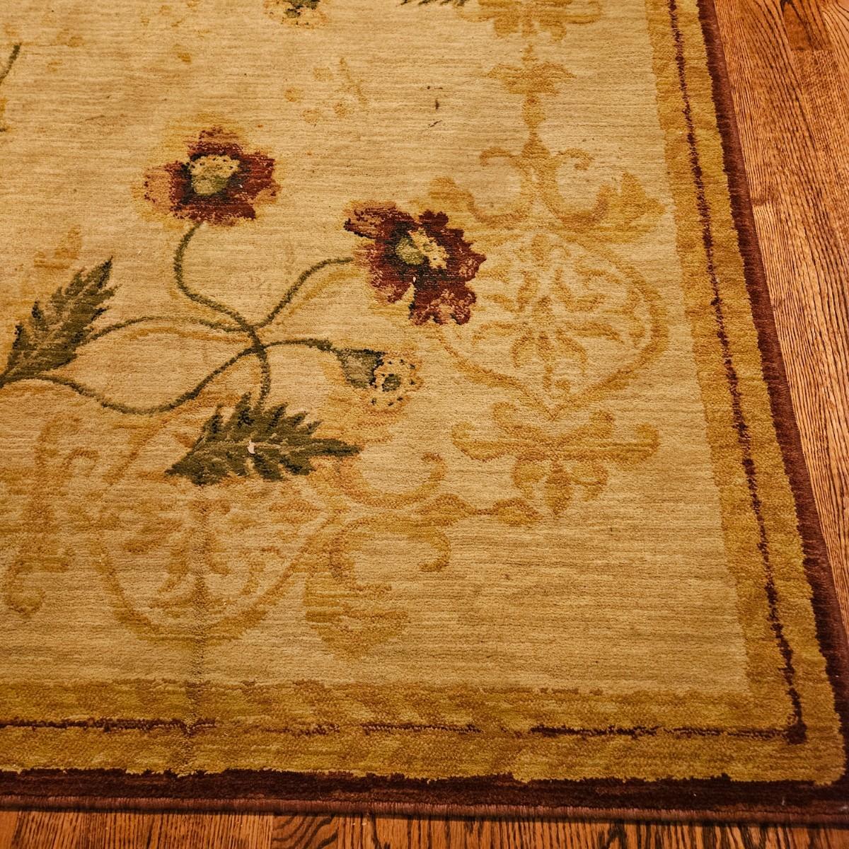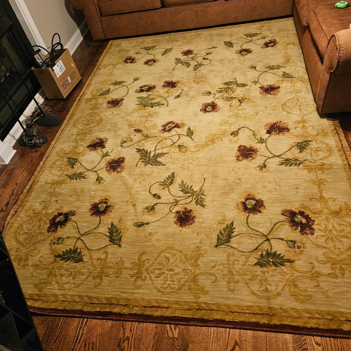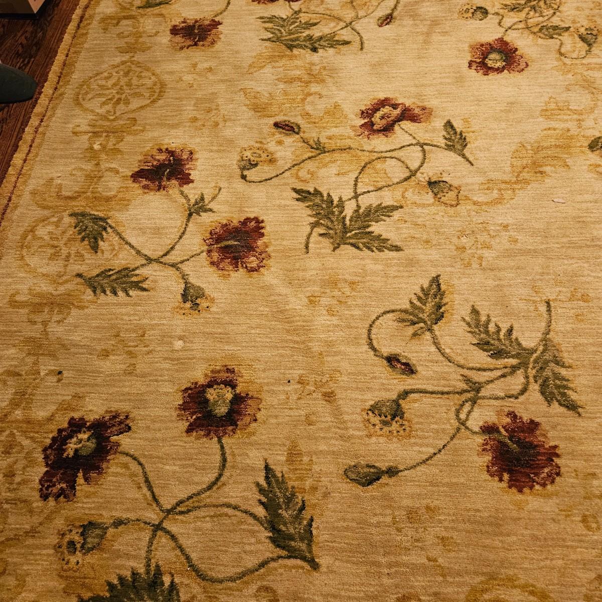 A large area rug manufactured by Shaw Rugs. It features a cream background with golden accents and a poppy floral design. It measures approximately 10'11" x 7'7". There is some minor blemishes, see attached pictures for more information. Local pickup only. Winning bidder must bring assistance to help move and load this item due to its weight and/or size.