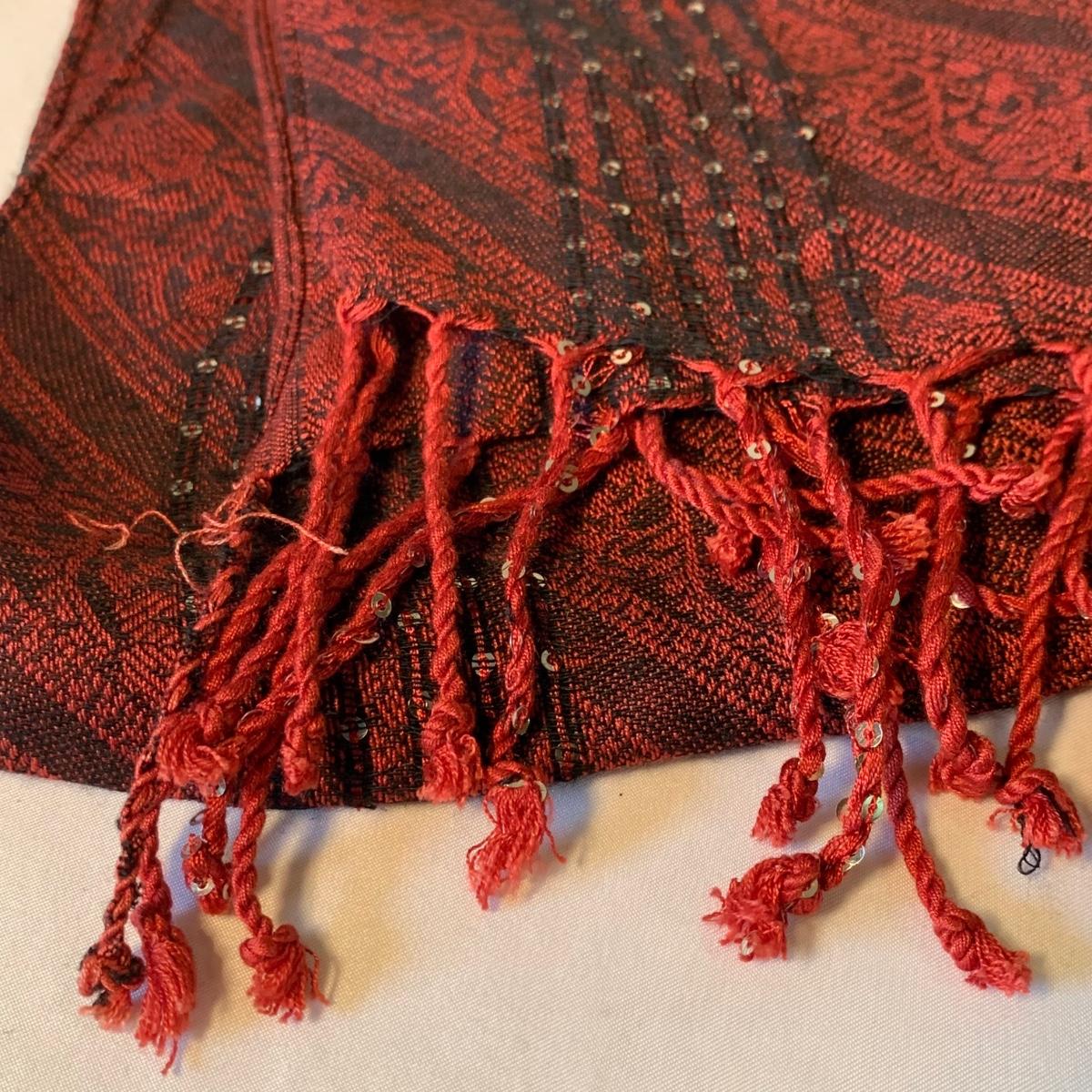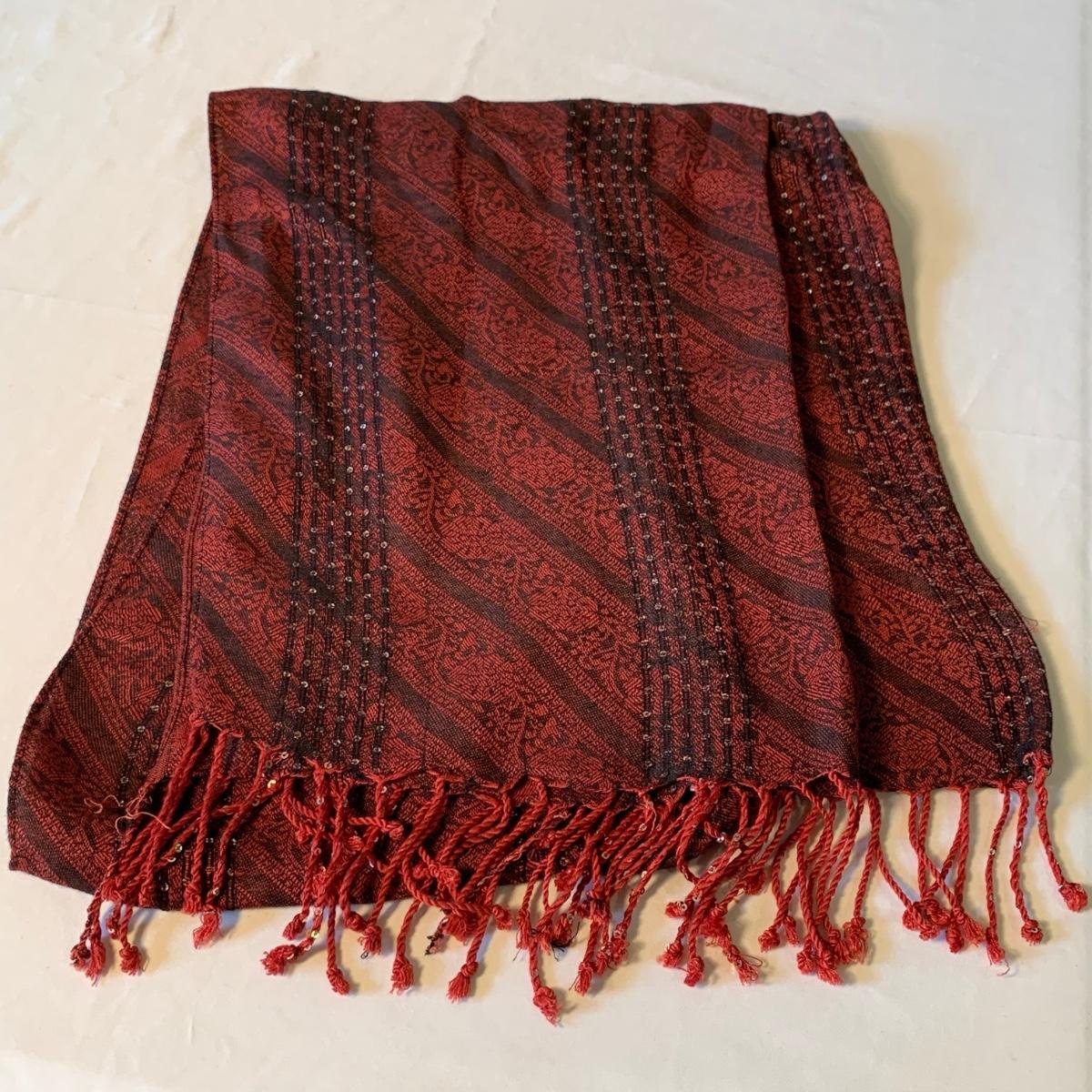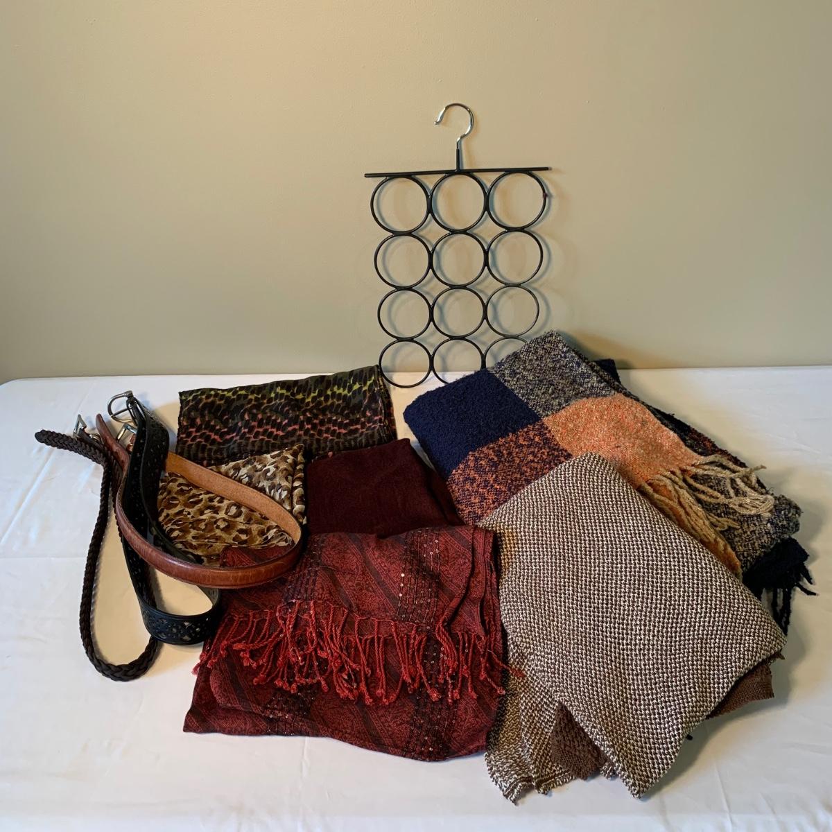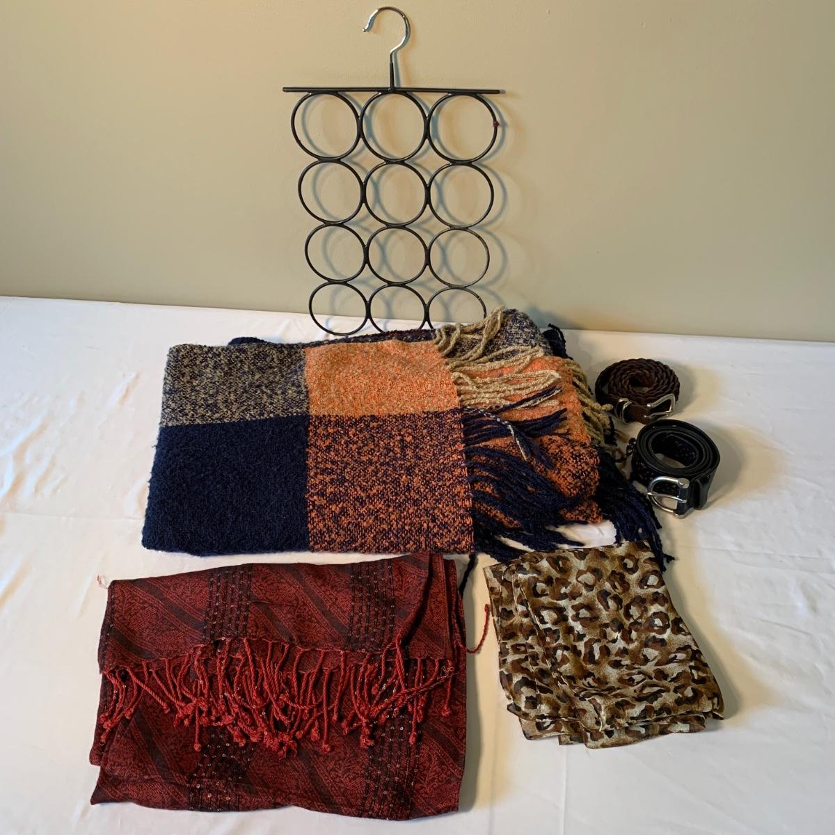 Two lovely woven shawls, four scarves, three leather belts, and a scarf hanger. The blue/orange shawl is very big and cozy, and super soft. The maroon and red scarves feel like a soft pashmina. The red one has tons of tiny sequins. The leopard print scarf is sheer and has a soft silky feel. The olive green, pink, and yellow is an infinity scarf. The scarf organizer holds 12 scarves. The three leather belts are 41” to 40” long.