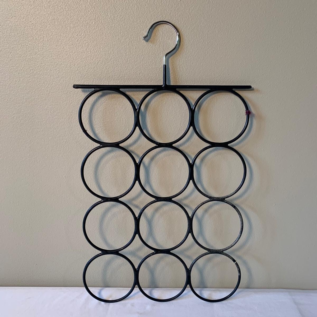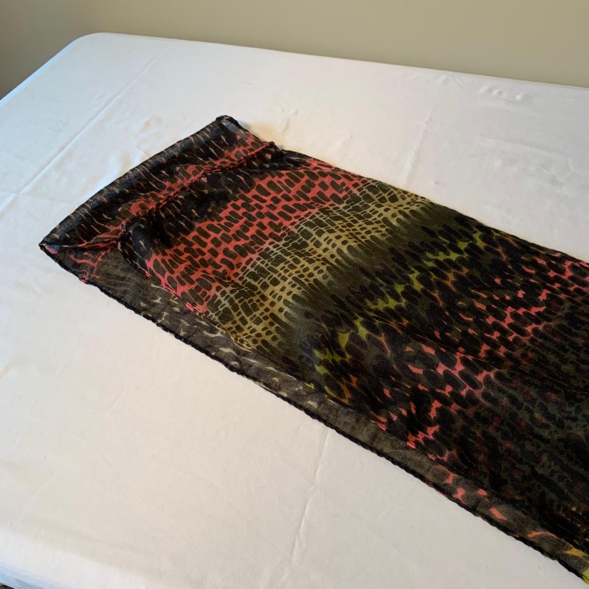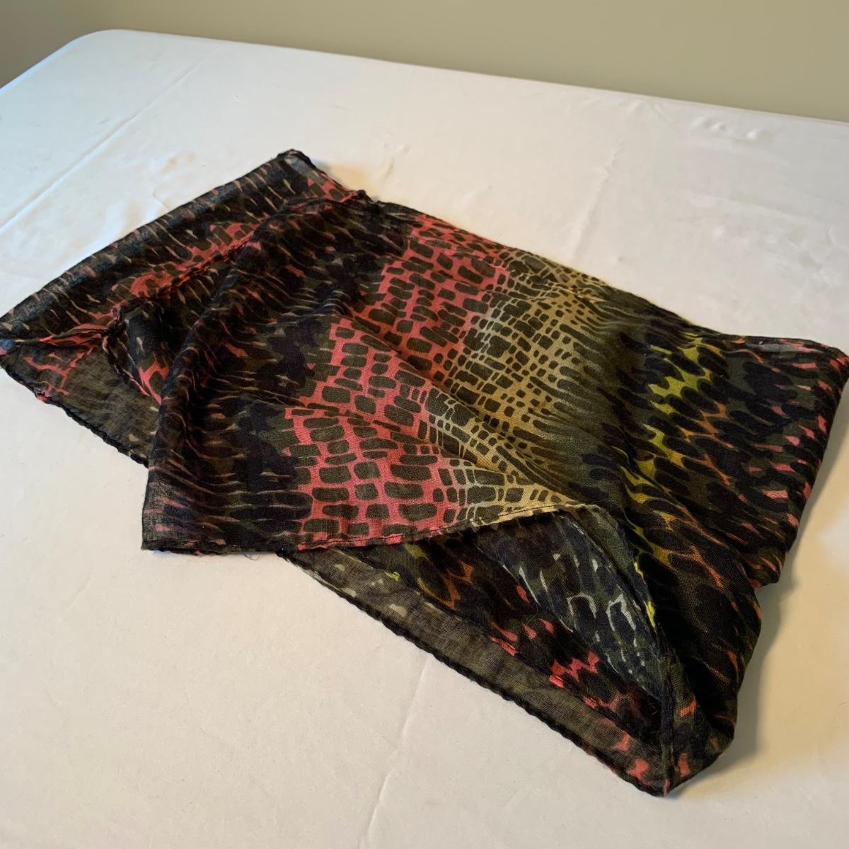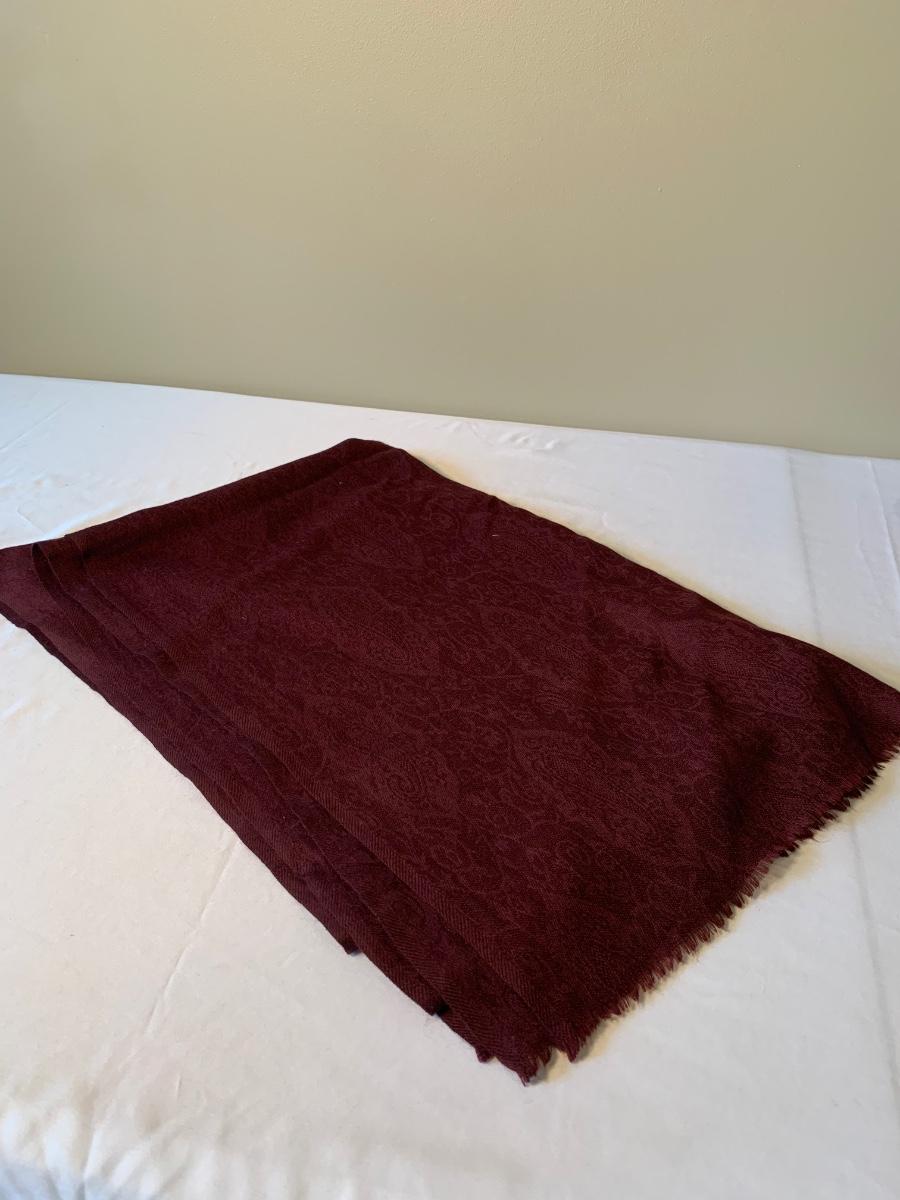 Two lovely woven shawls, four scarves, three leather belts, and a scarf hanger. The blue/orange shawl is very big and cozy, and super soft. The maroon and red scarves feel like a soft pashmina. The red one has tons of tiny sequins. The leopard print scarf is sheer and has a soft silky feel. The olive green, pink, and yellow is an infinity scarf. The scarf organizer holds 12 scarves. The three leather belts are 41” to 40” long.