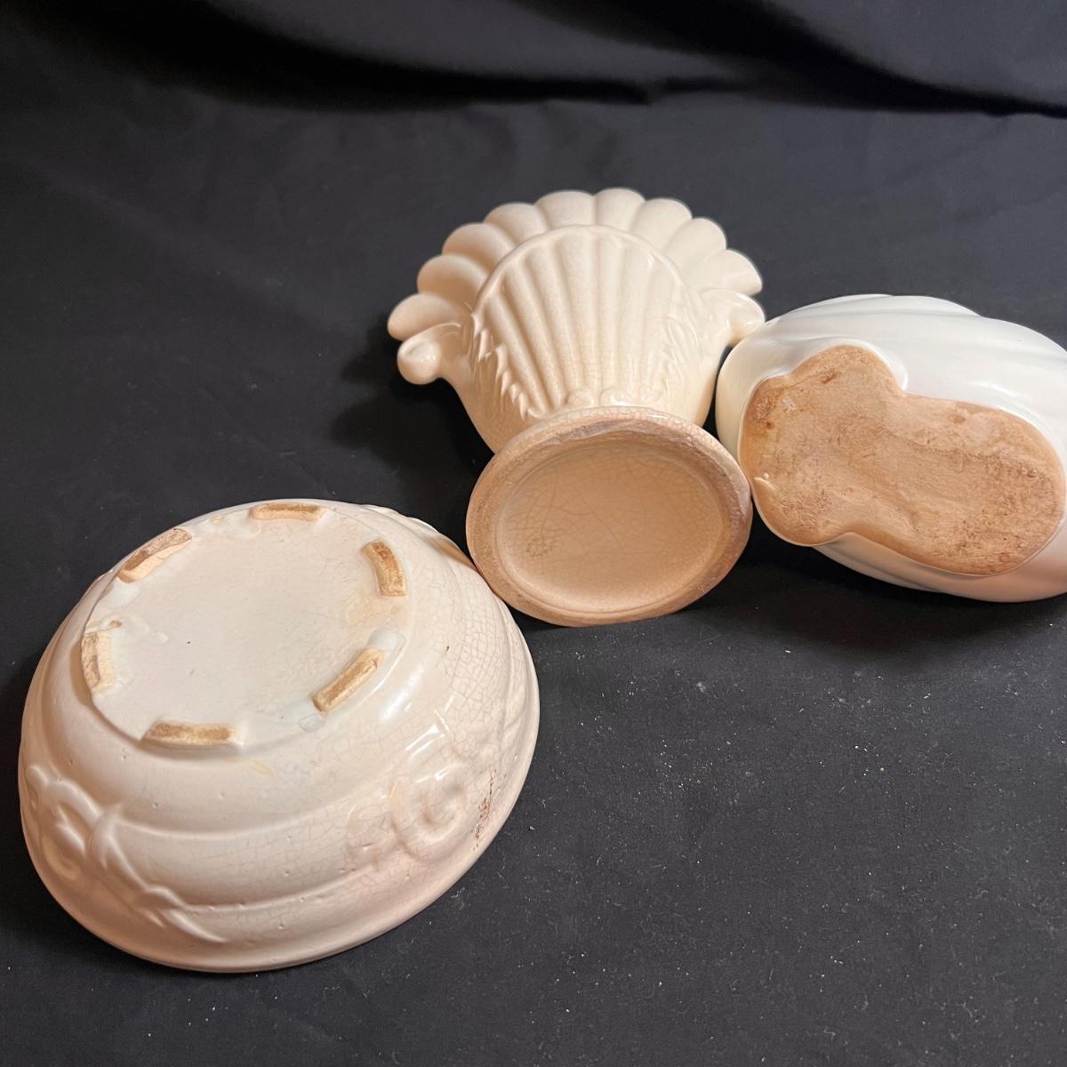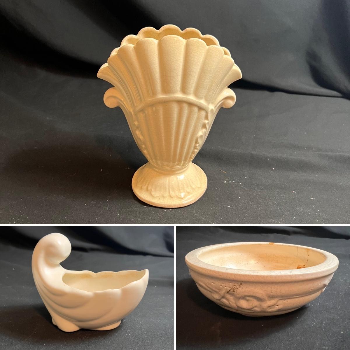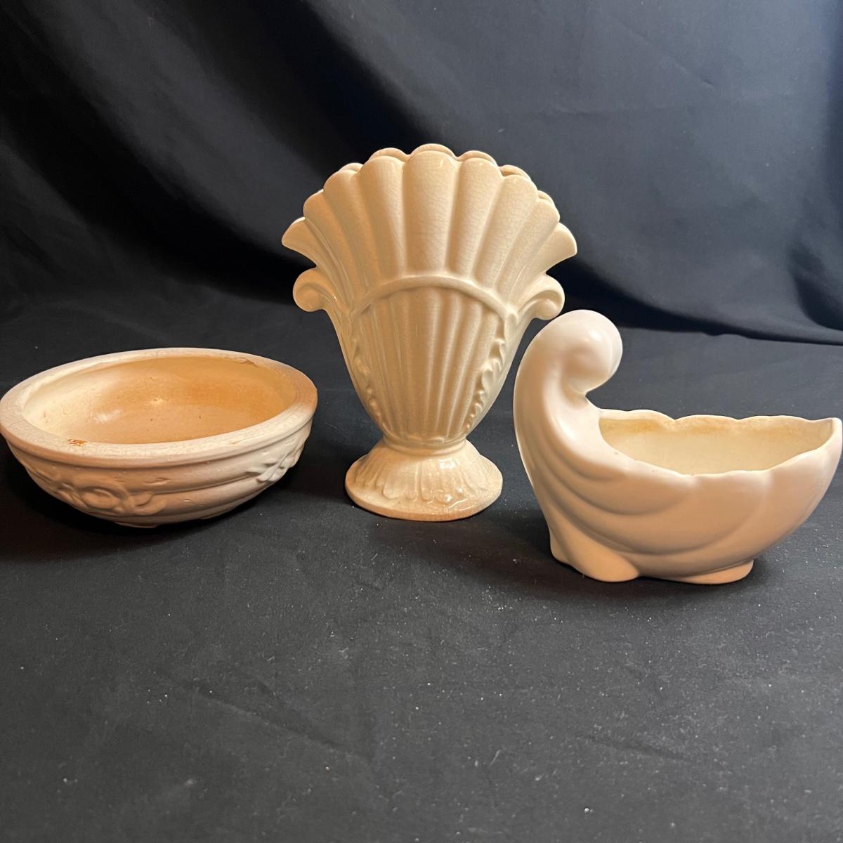Three creamed colored pottery pieces includes an art deco style fan shaped vase that is possibly made by Shawnee pottery, but no markings found on any items. The bowl and small dish have some stains and crazing, see pics.