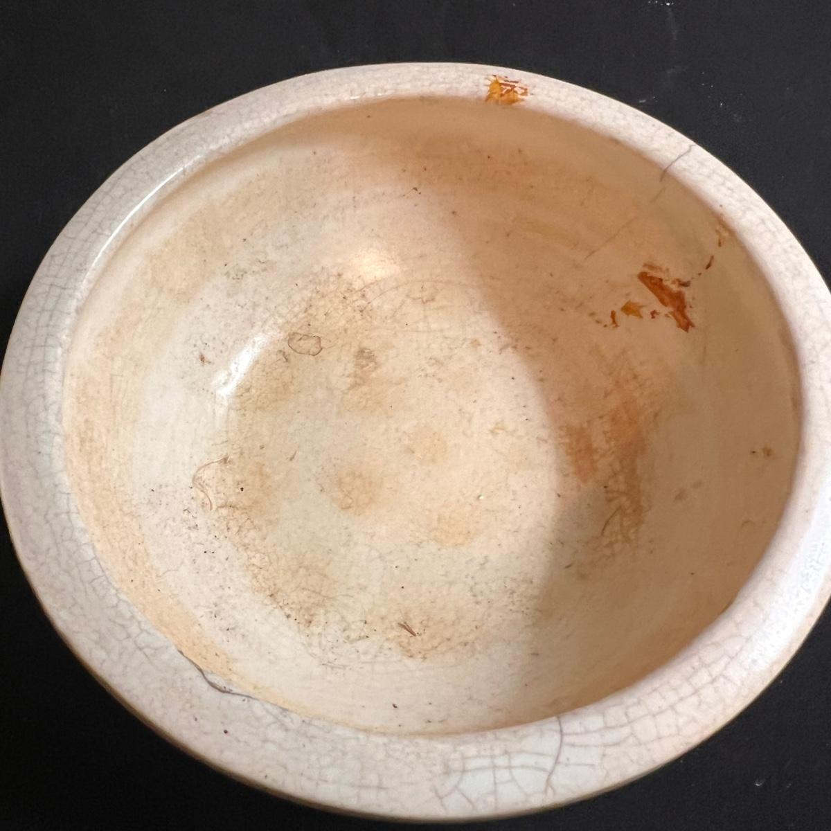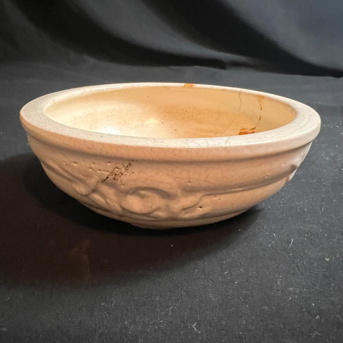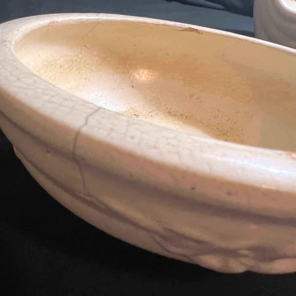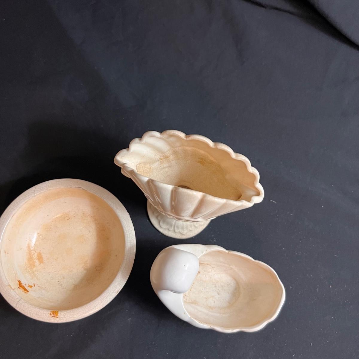 Three creamed colored pottery pieces includes an art deco style fan shaped vase that is possibly made by Shawnee pottery, but no markings found on any items. The bowl and small dish have some stains and crazing, see pics.