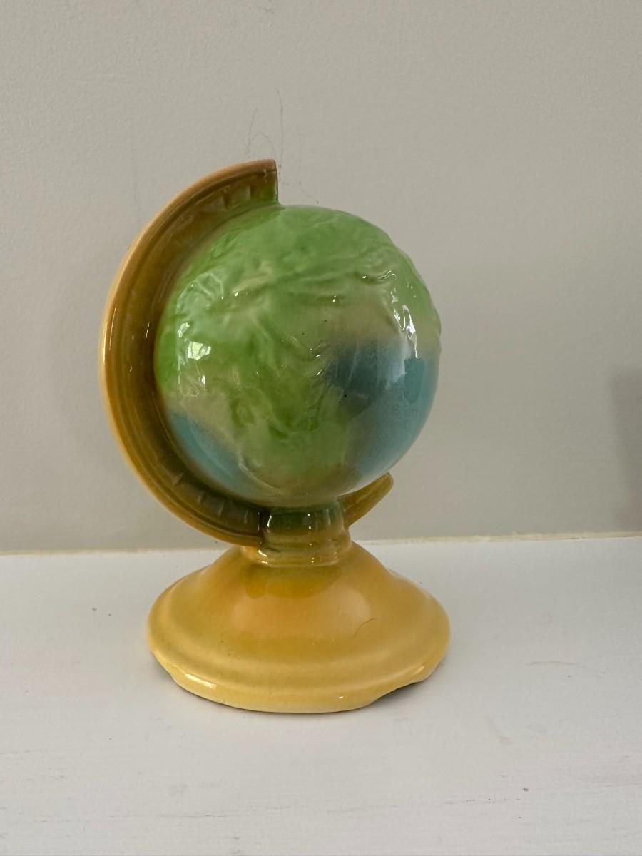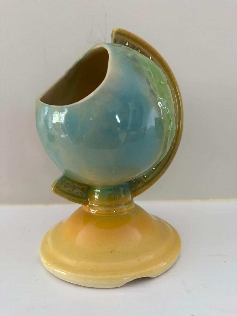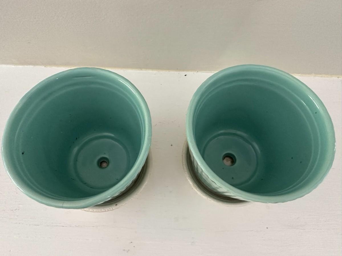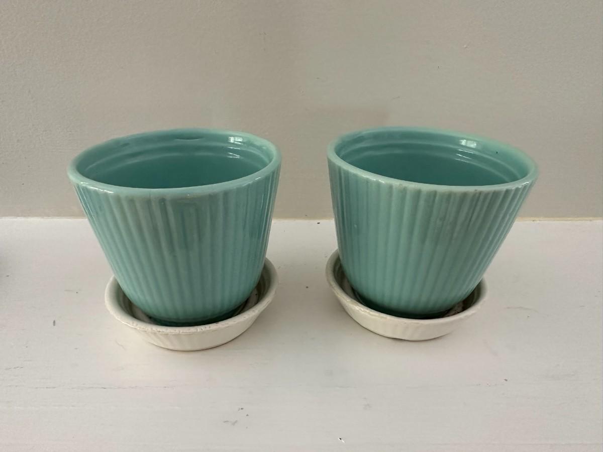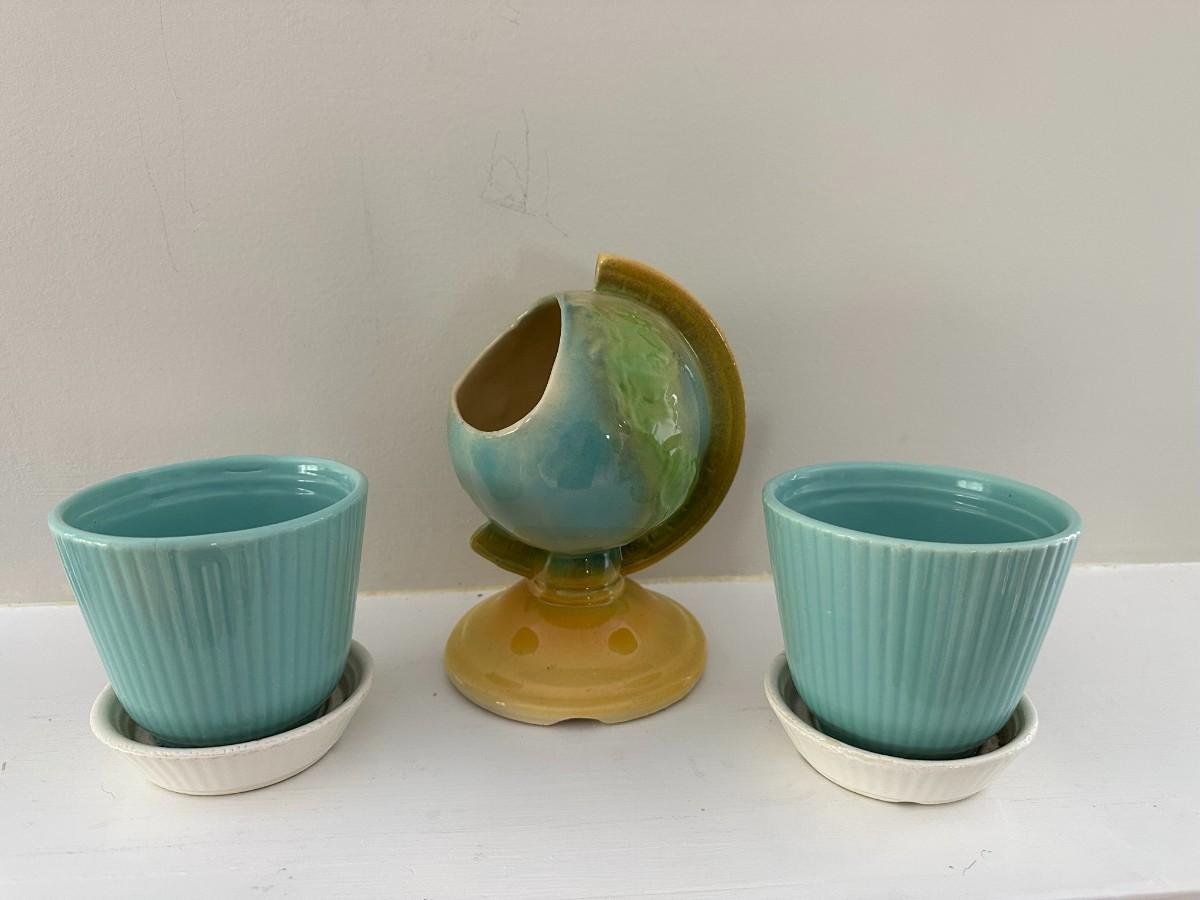 2 small blue pots with attached white trays measure 4"w x 4"h. Adorable Globe vase/planter measures 7"h x 5.5"w