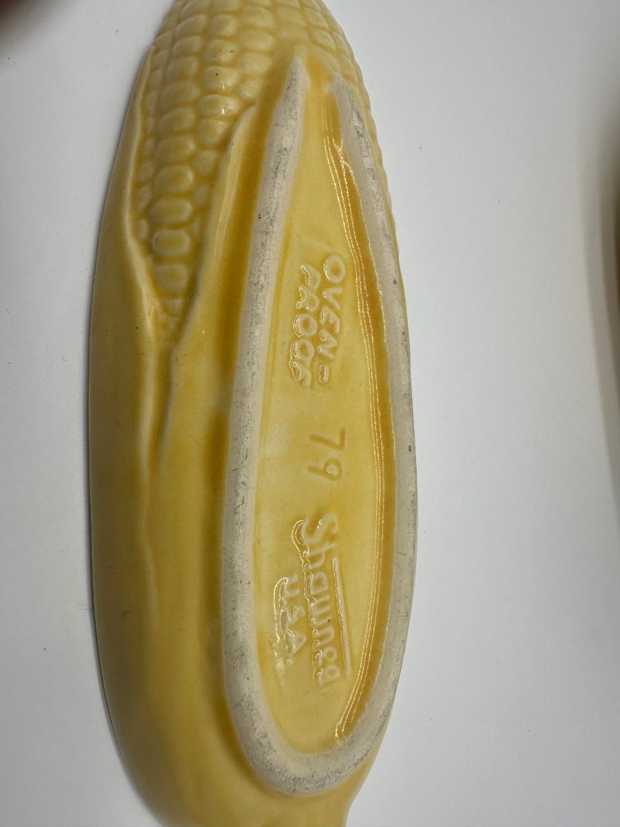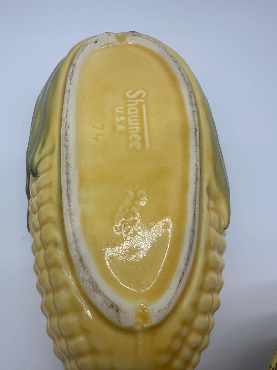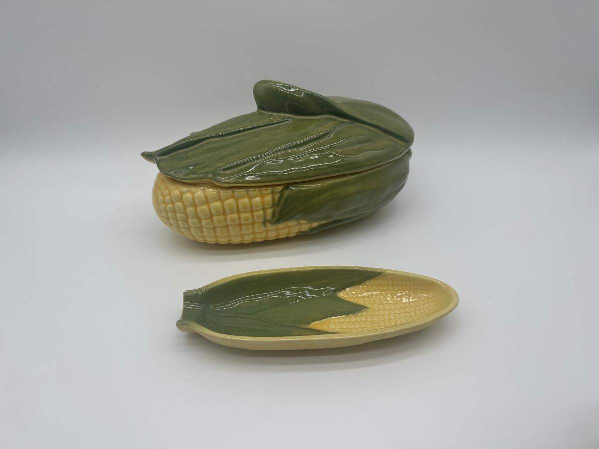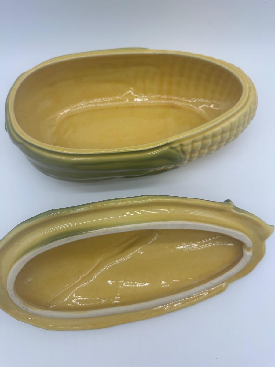 Vintage Shawnee Pottery “Corn King” covered casserole dish, marked Shawnee U.S.A. 74, with matching corn-shaped serving tray marked 79. Classic yellow corn and green husk glaze.