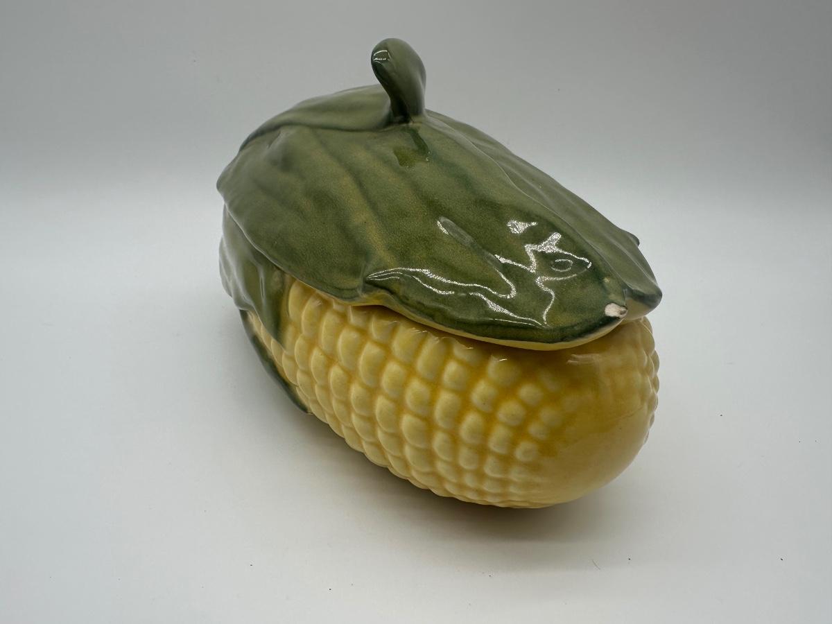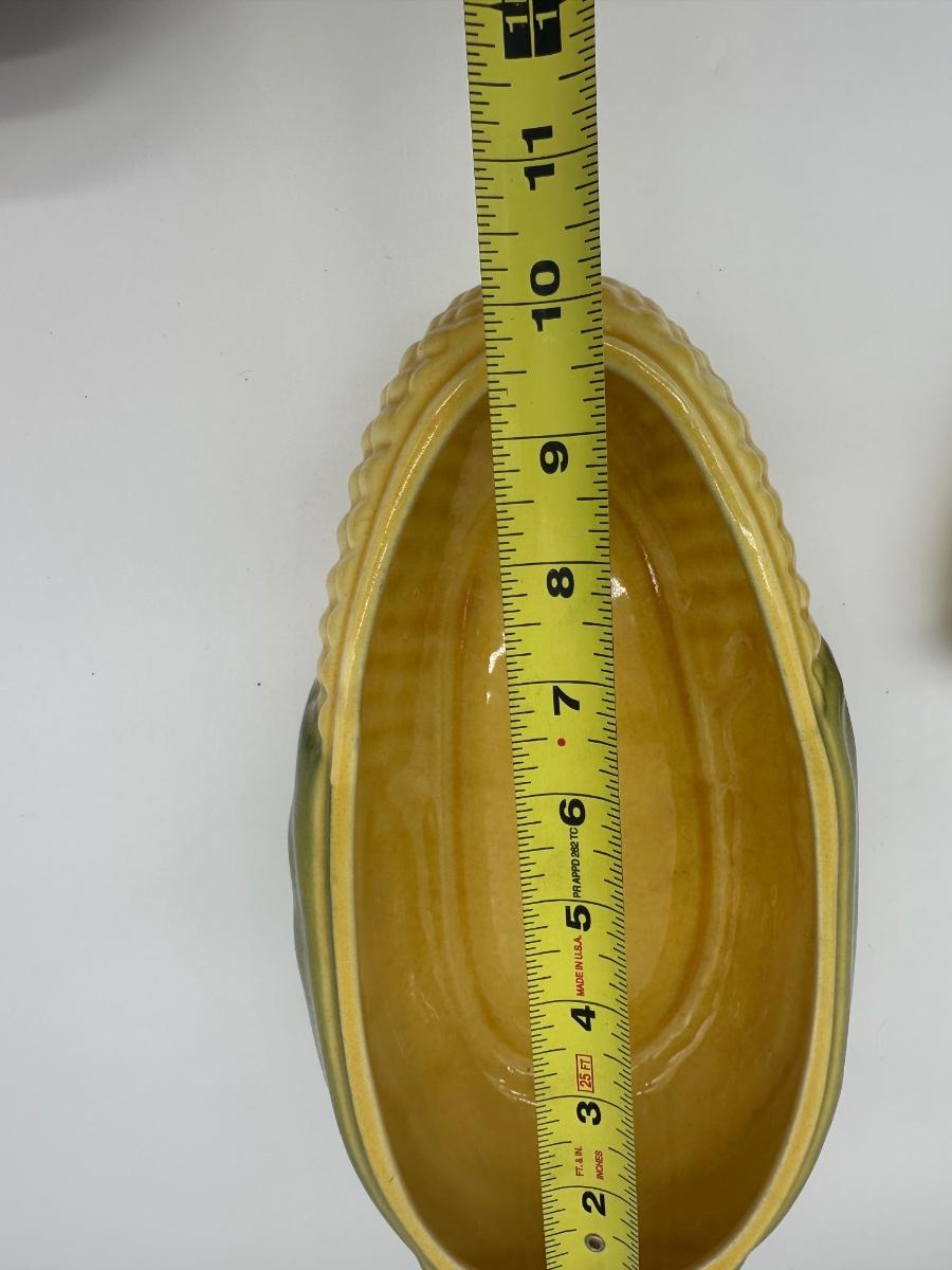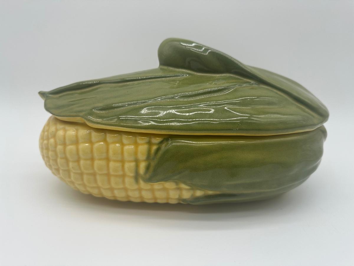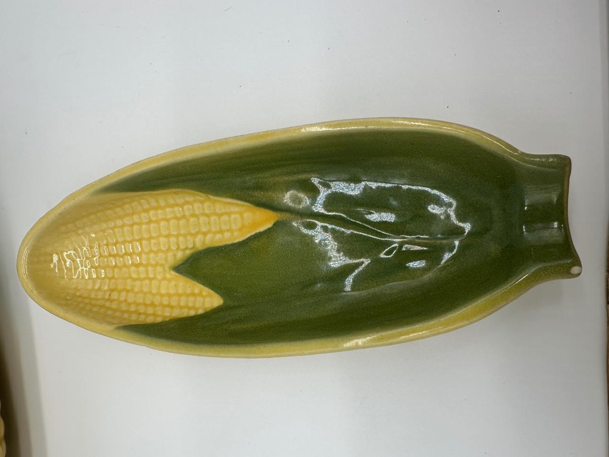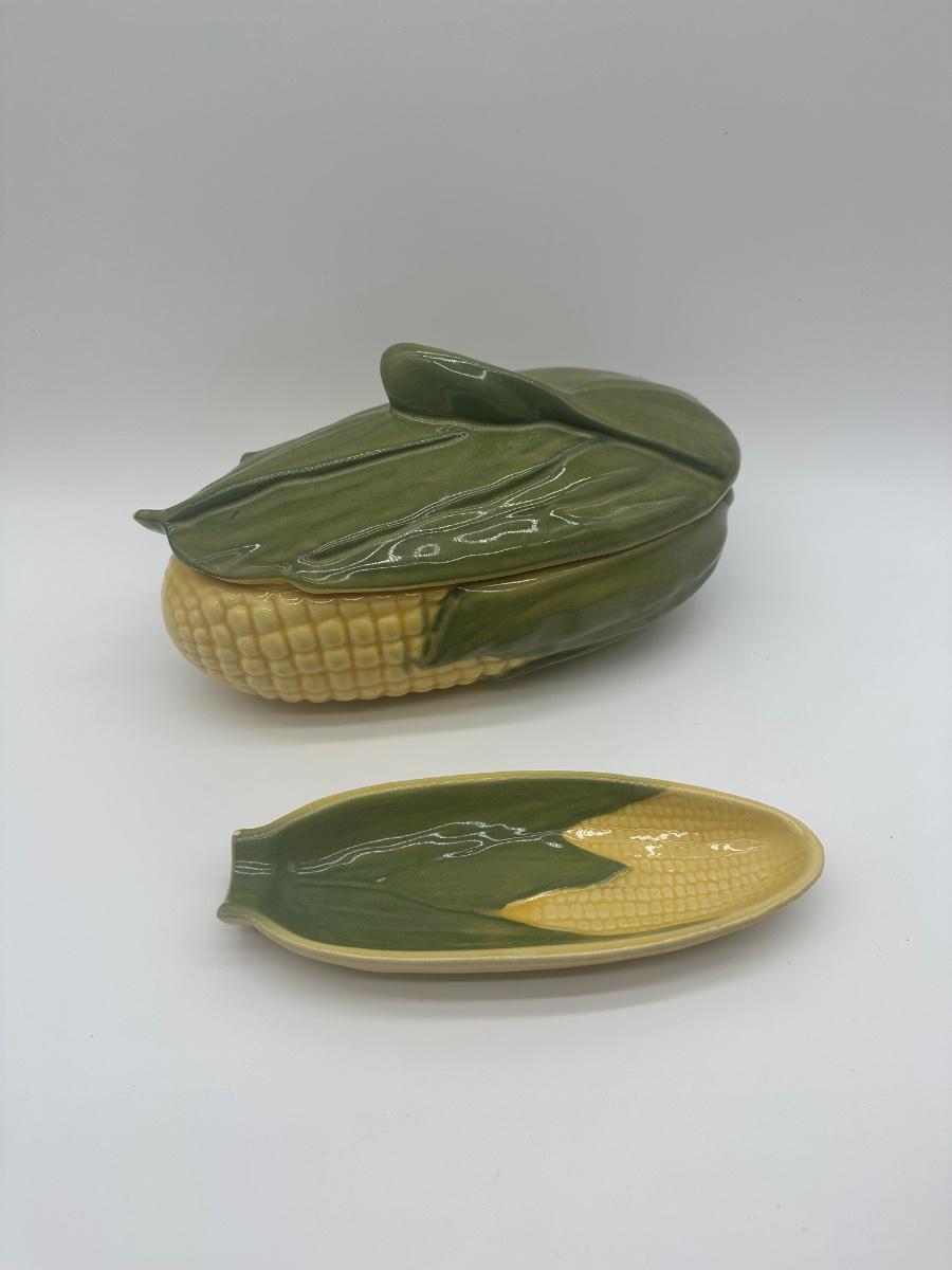 Vintage Shawnee Pottery “Corn King” covered casserole dish, marked Shawnee U.S.A. 74, with matching corn-shaped serving tray marked 79. Classic yellow corn and green husk glaze.