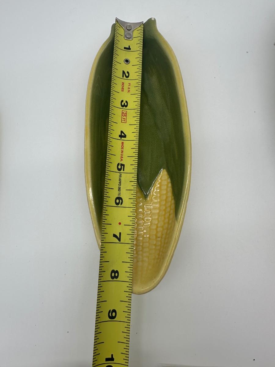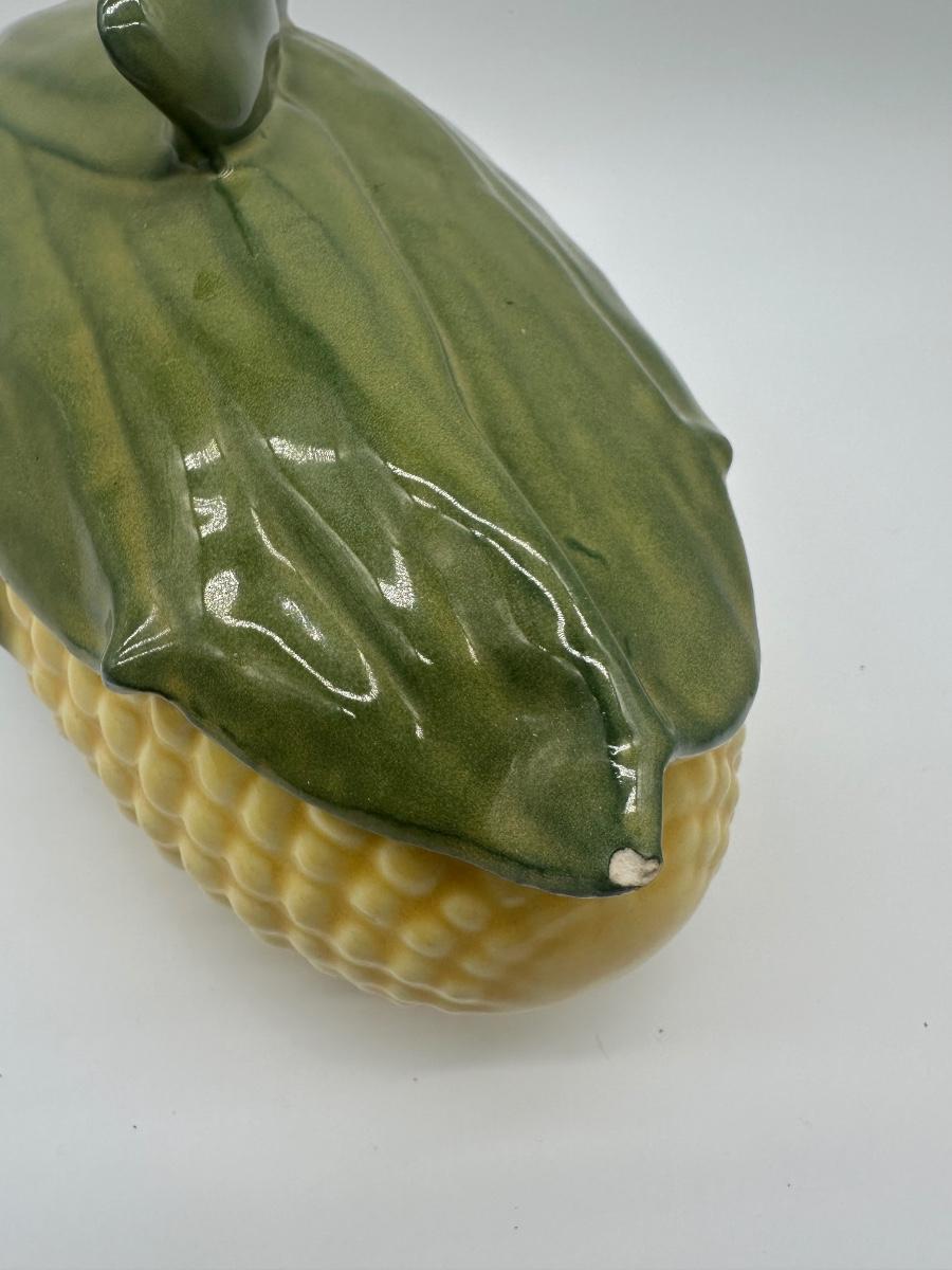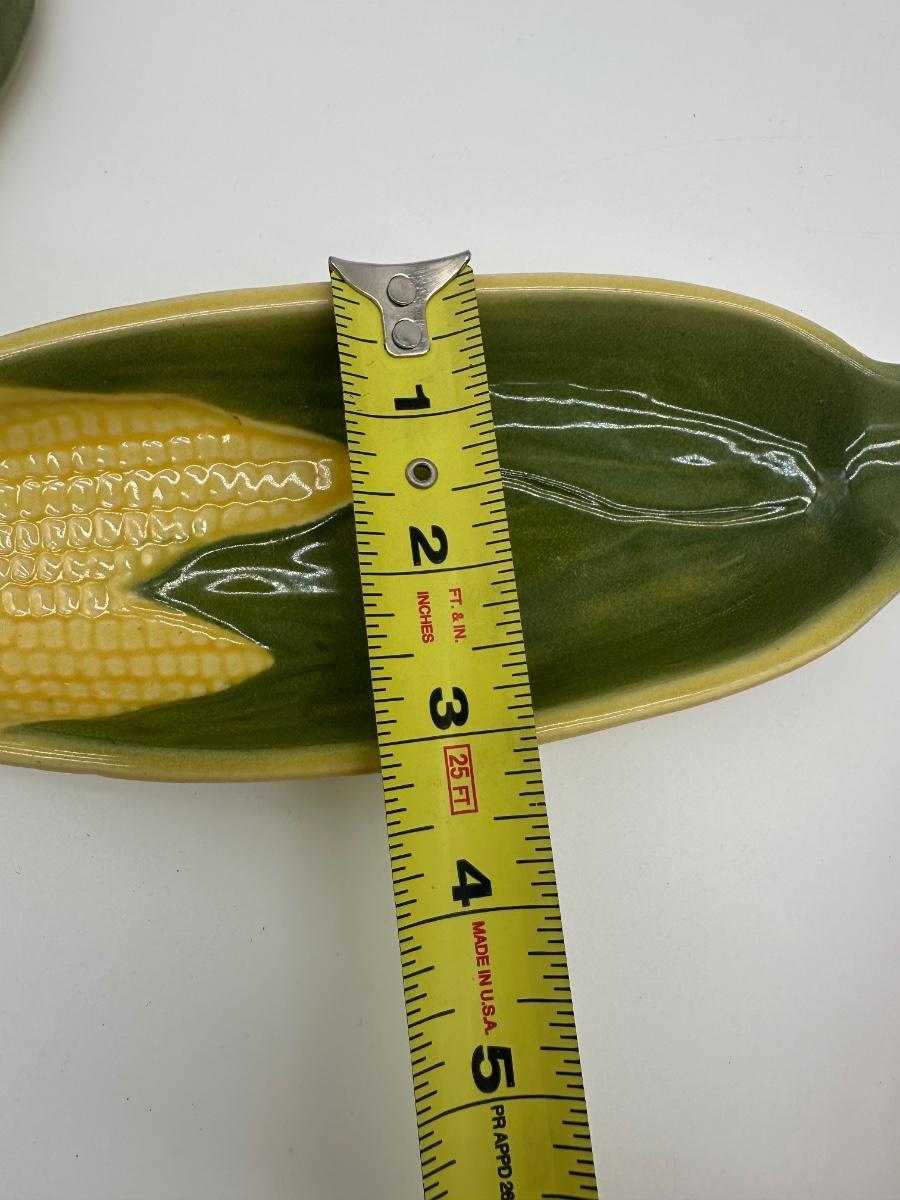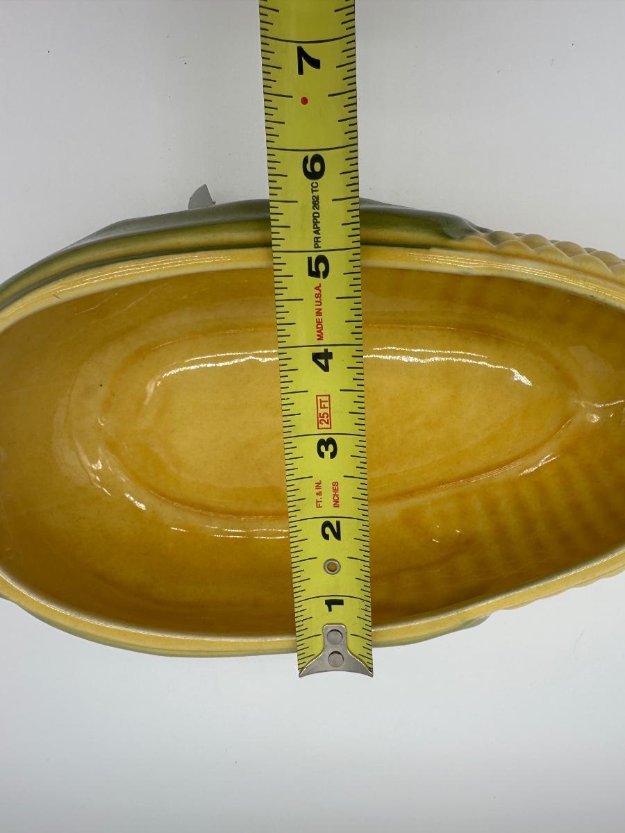 Vintage Shawnee Pottery “Corn King” covered casserole dish, marked Shawnee U.S.A. 74, with matching corn-shaped serving tray marked 79. Classic yellow corn and green husk glaze.