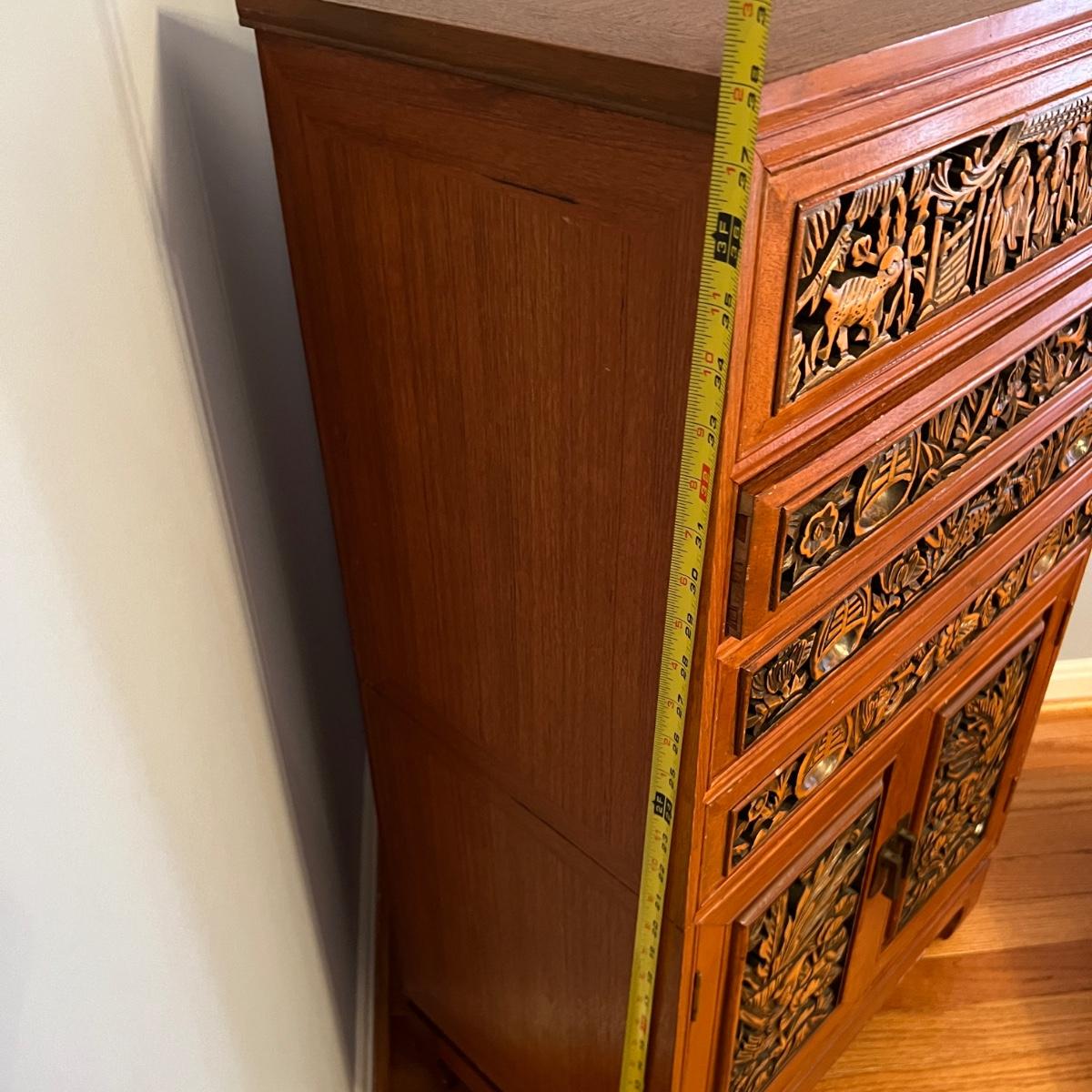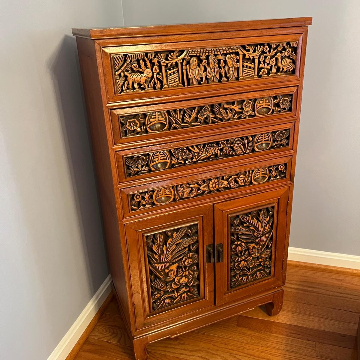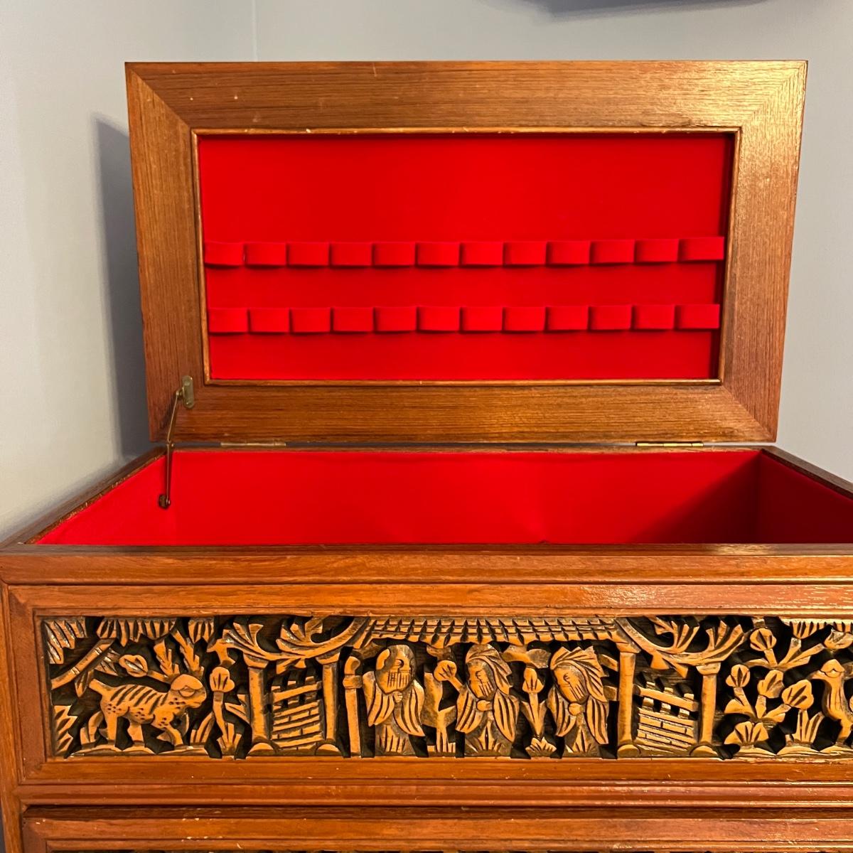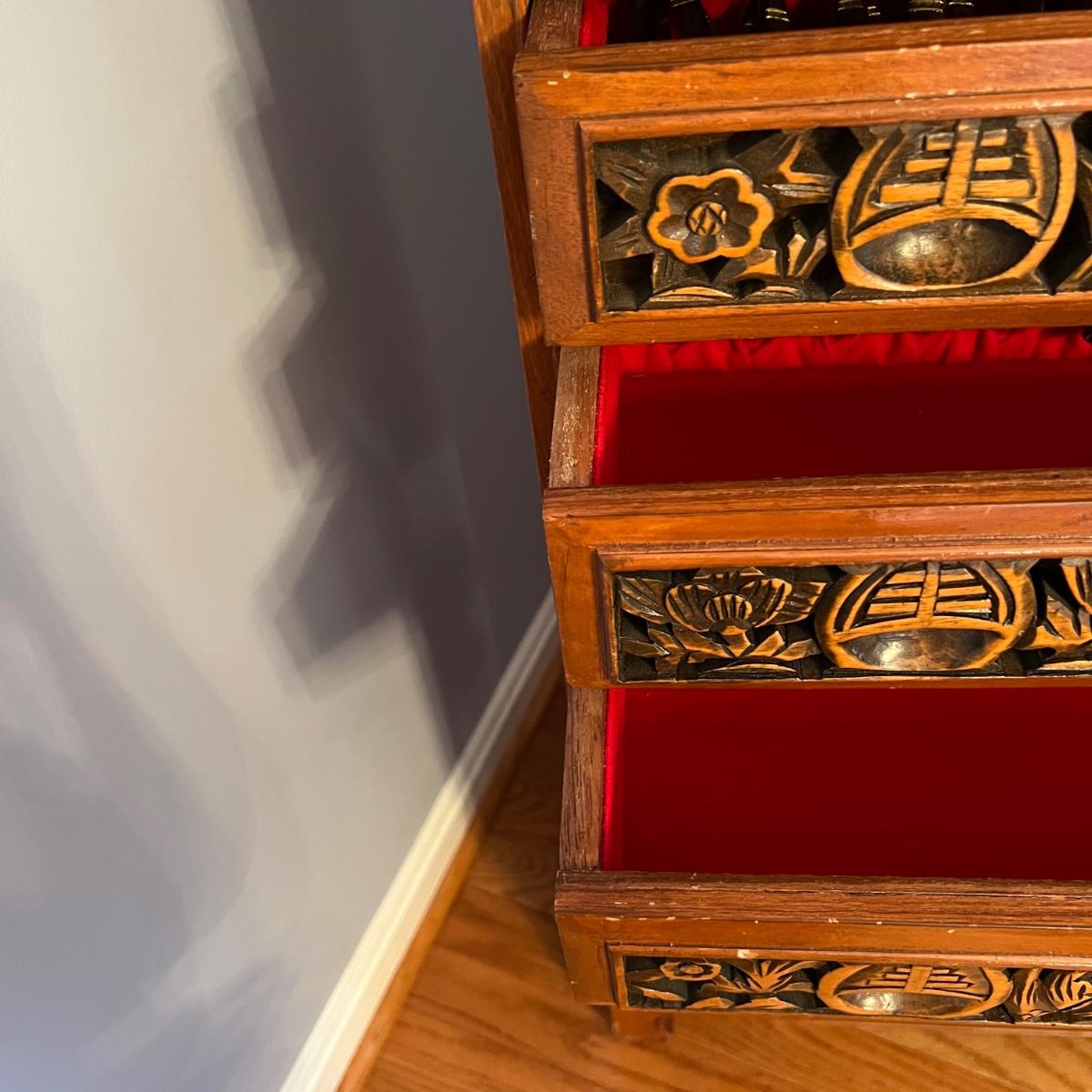 Asian Carved Wood Flatware Chest 4 Drawer + Cabinet