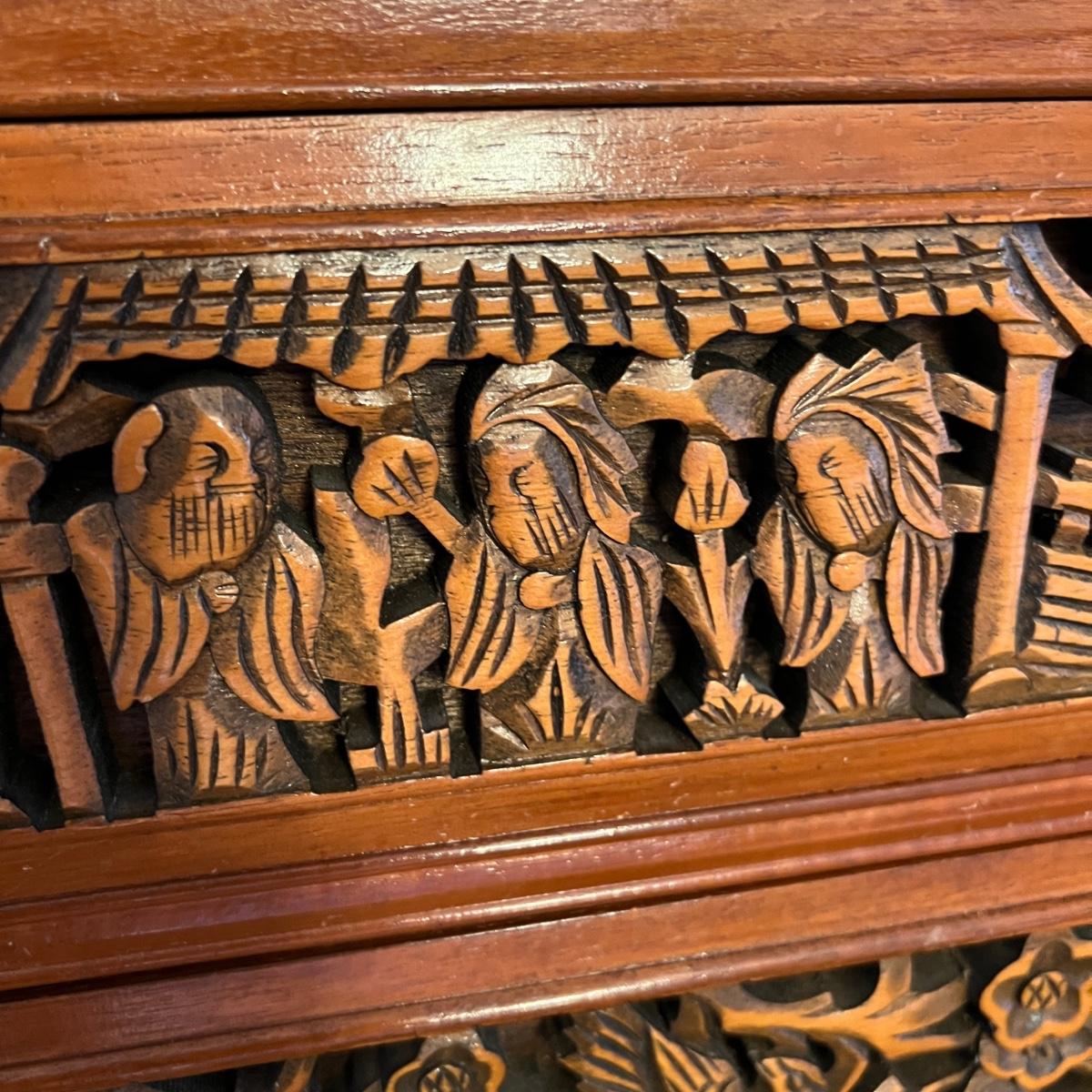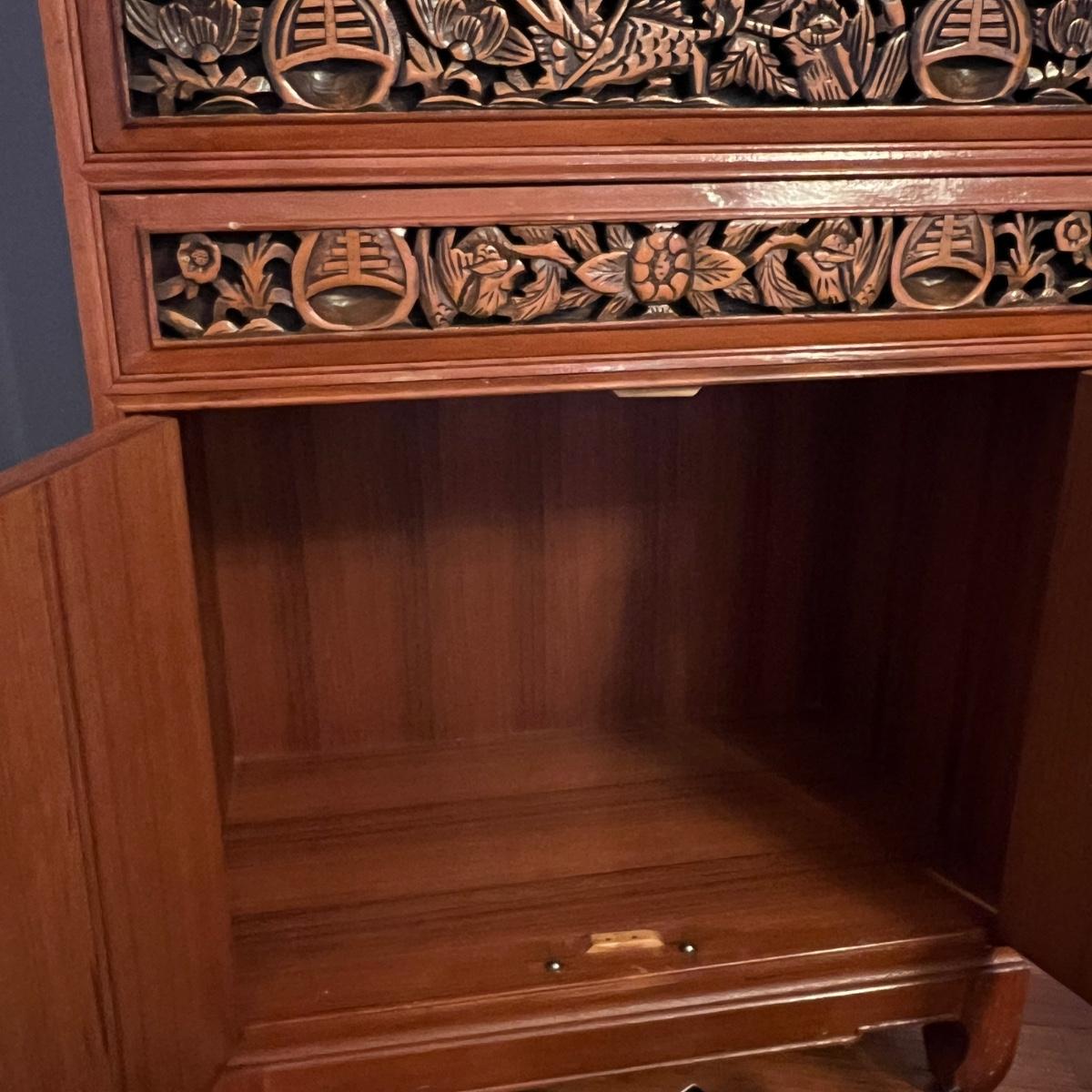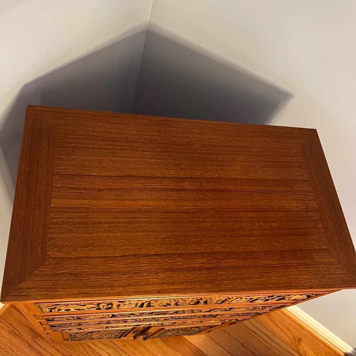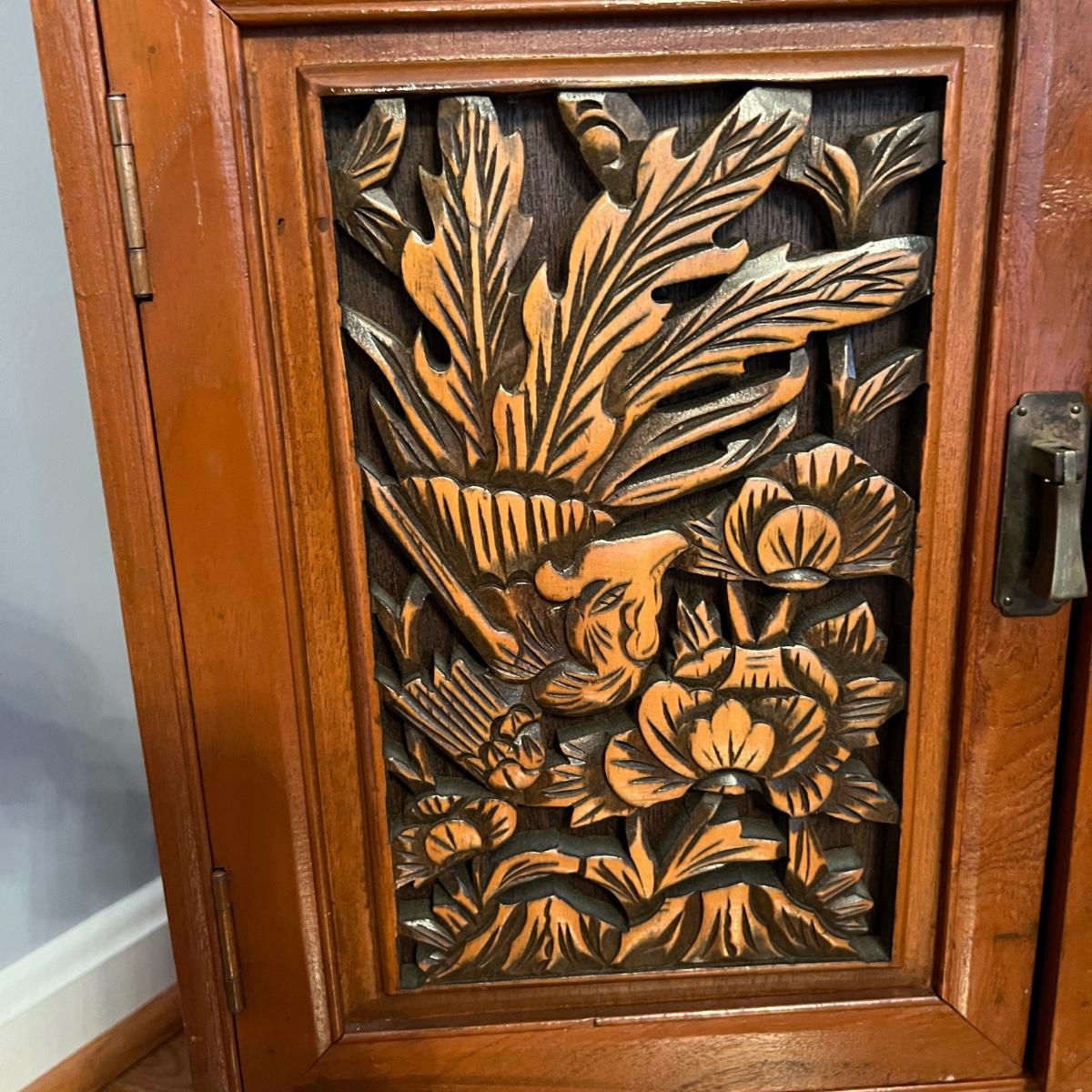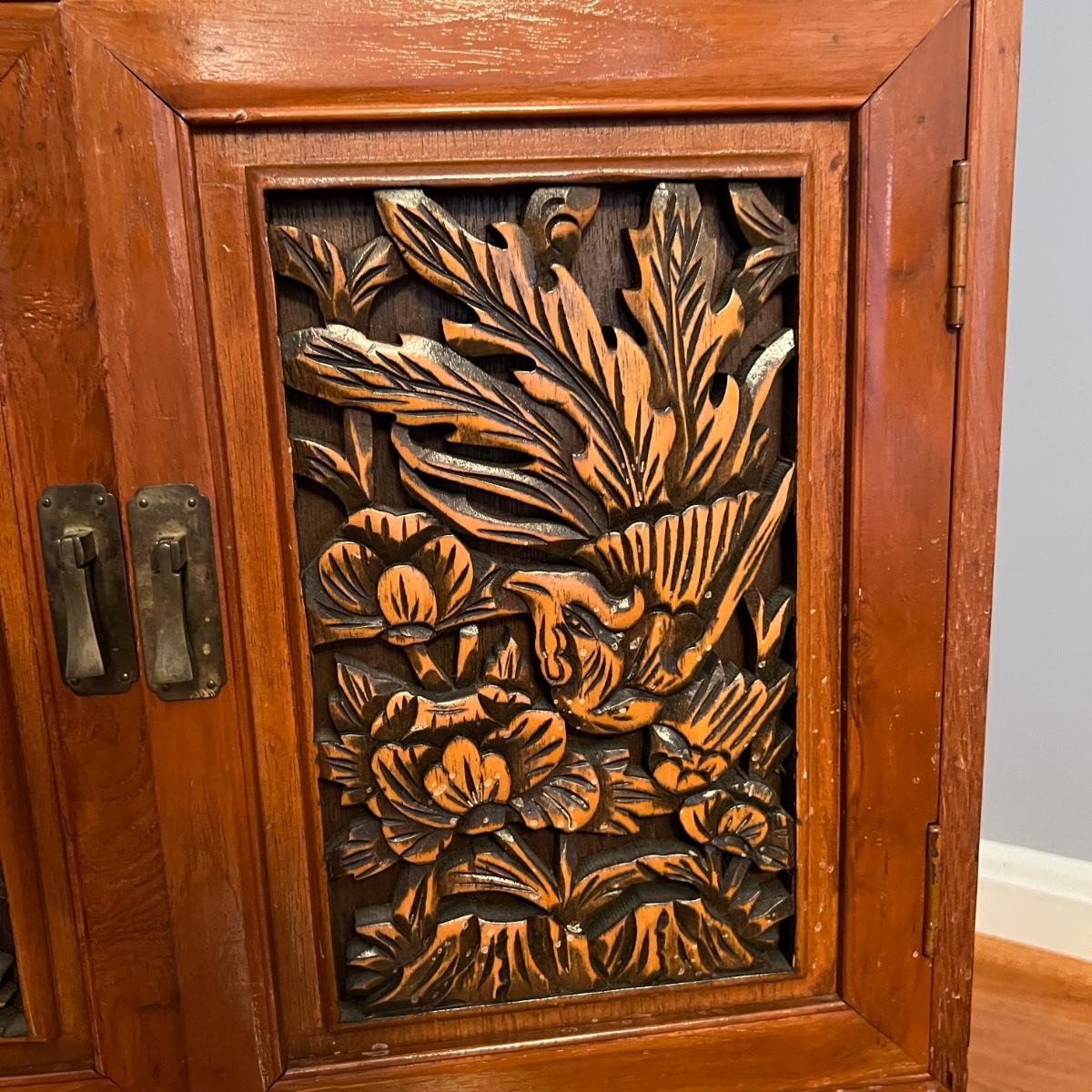Asian Carved Wood Flatware Chest 4 Drawer + Cabinet
