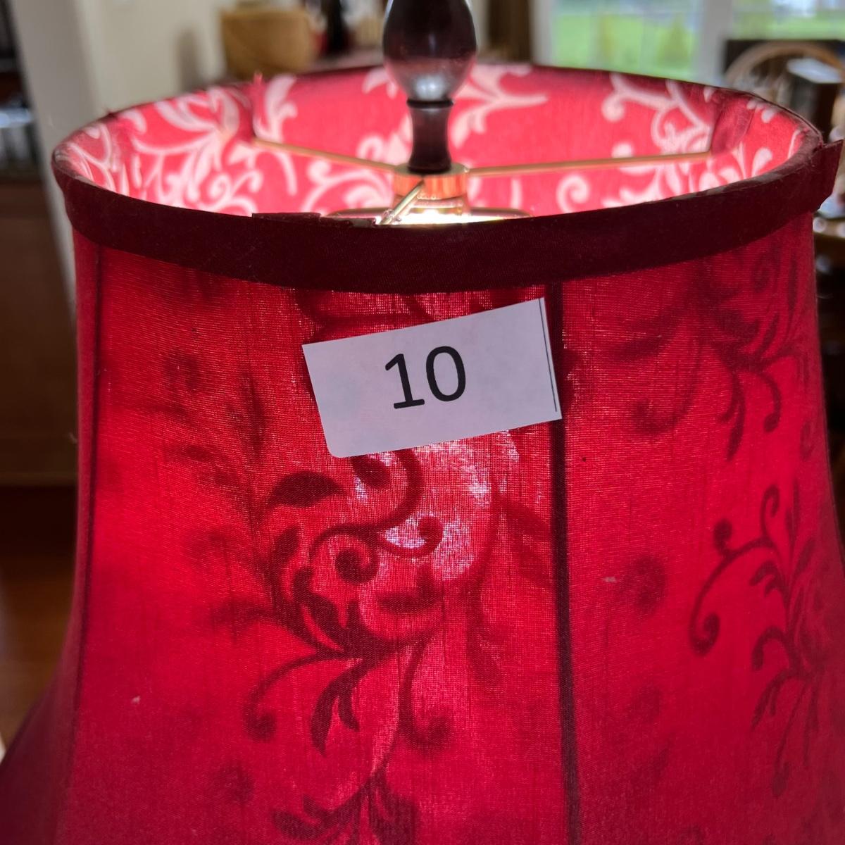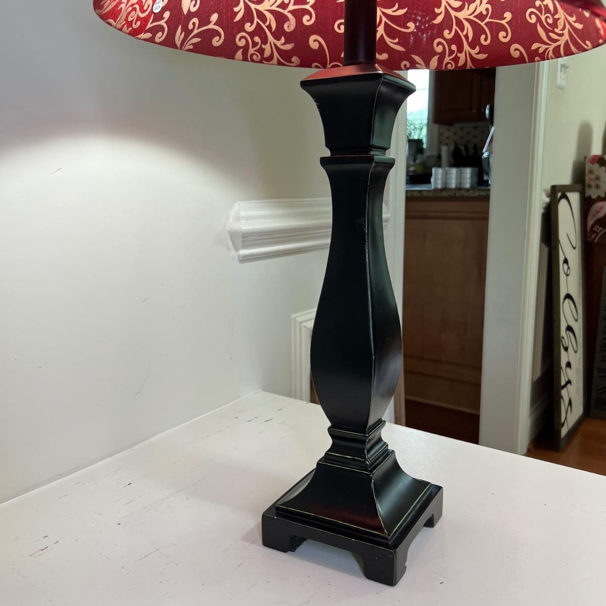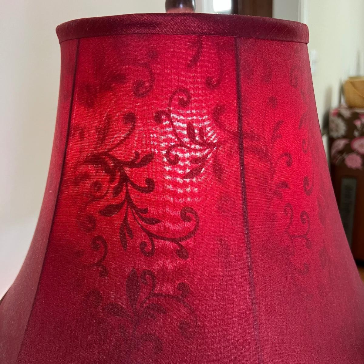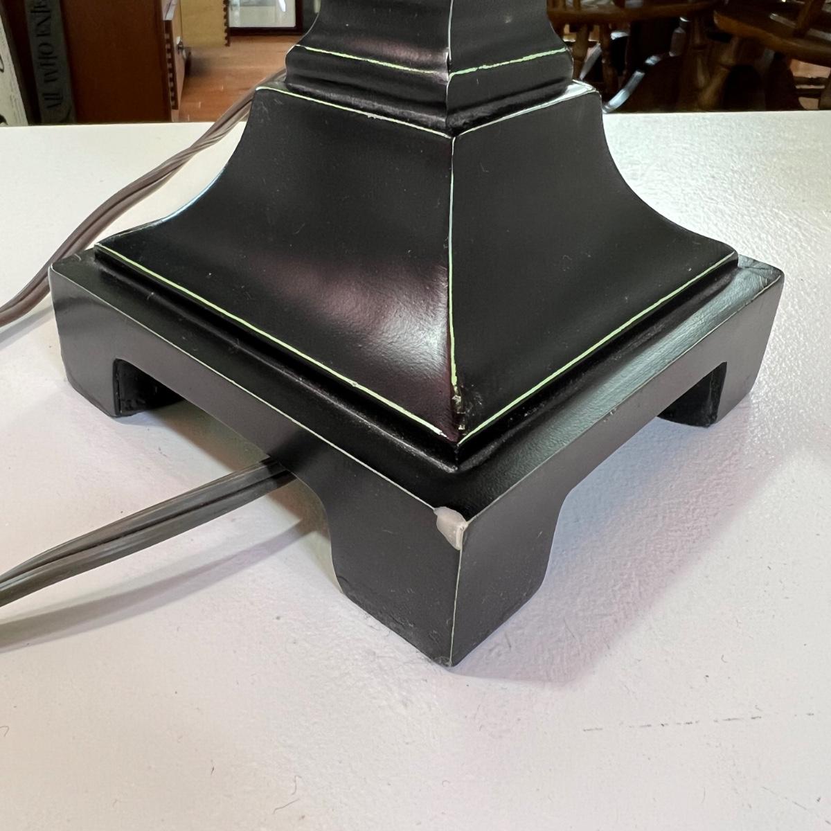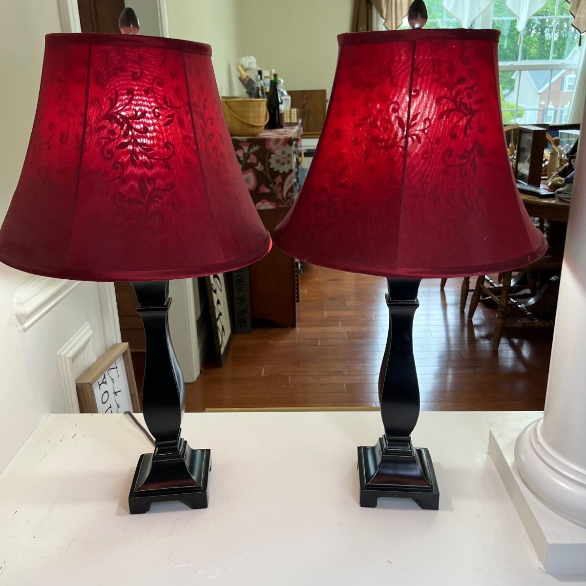 2 lamp set, one has a small chip at the base as shown in pictures. Otherwise great condition. Shades show slight design when lit up, but look solid when turned off 28" tall.