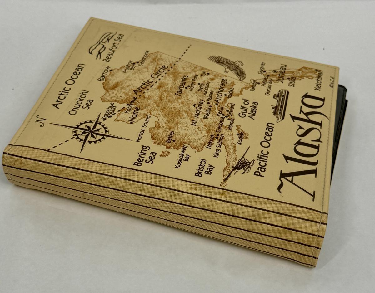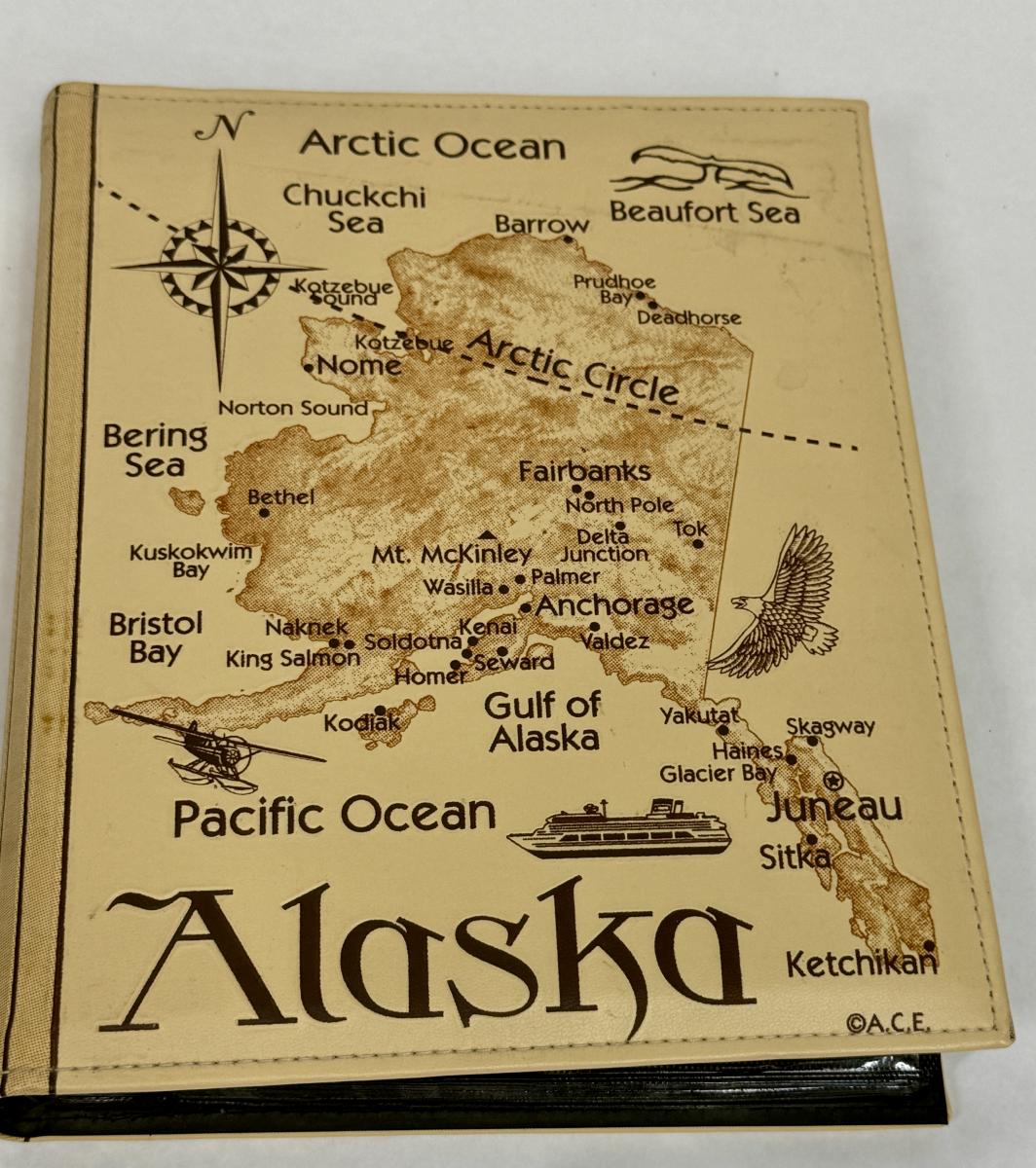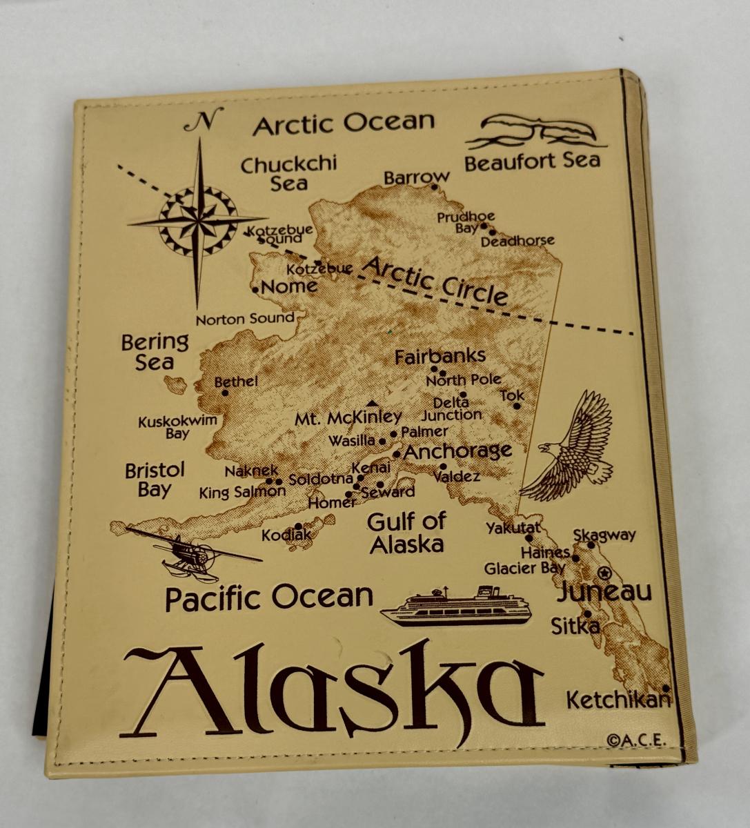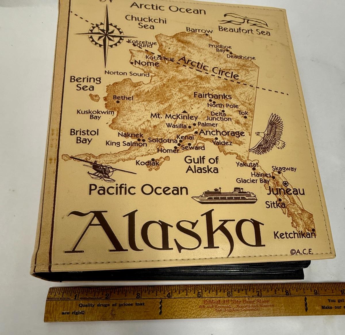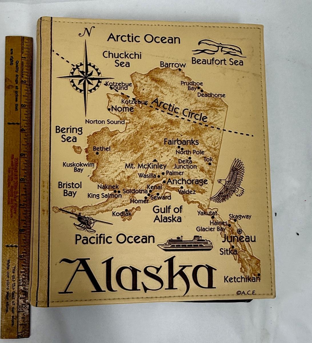 Synthetic Tan Leather cover with a map of Alaska with many points of interest identified. Approx. size 8.5' X 10". Holds 208 4' x 6" prints. Great for holding Alaska cruise or other Alaska vacation photos. Like new condition.