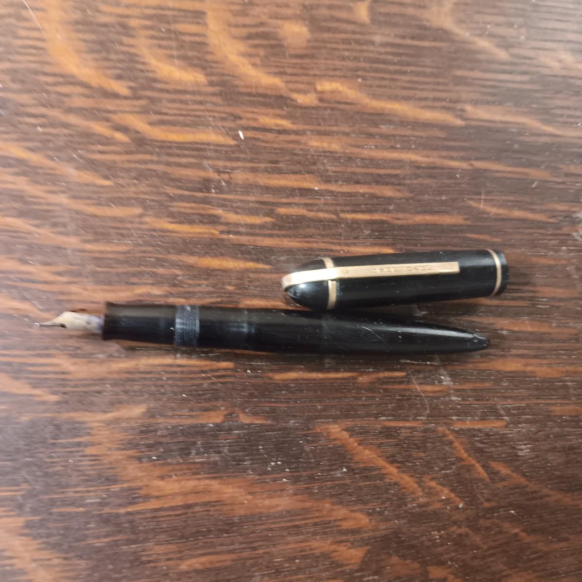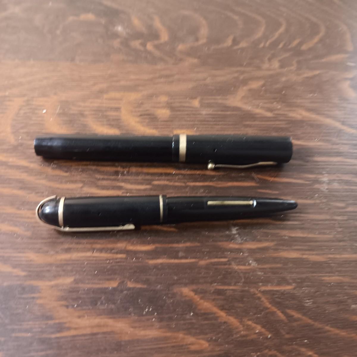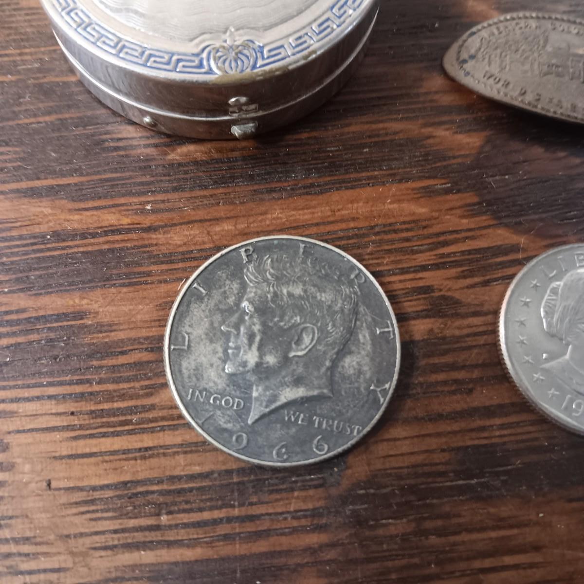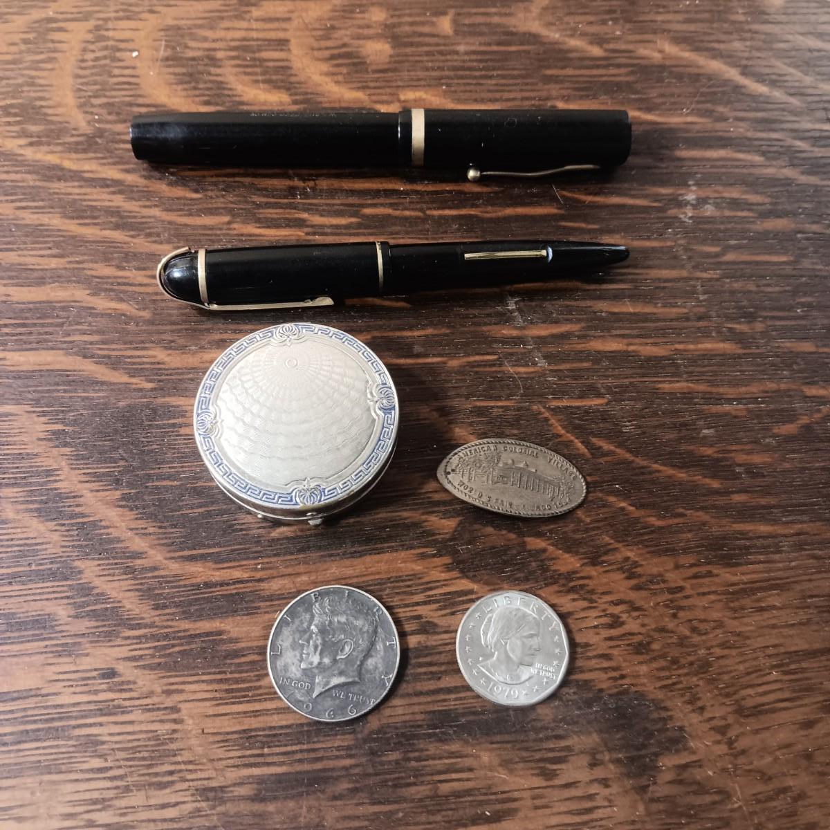 SHEAFFER'S FOUNTAIN PEN, EVERSHARP PENCIL, KARESS COMPACT, 2 COINS