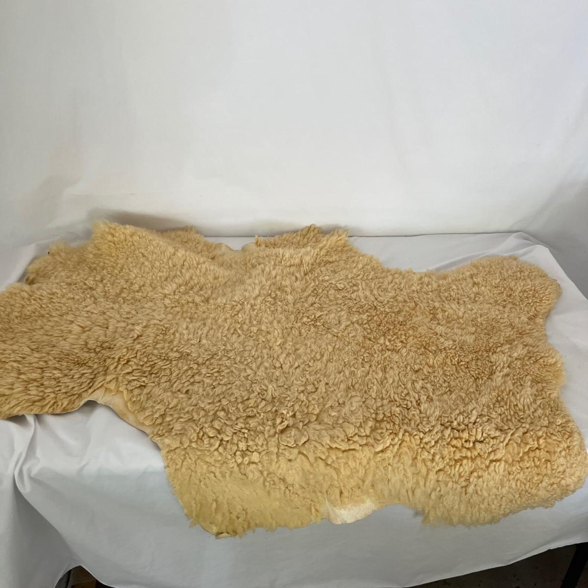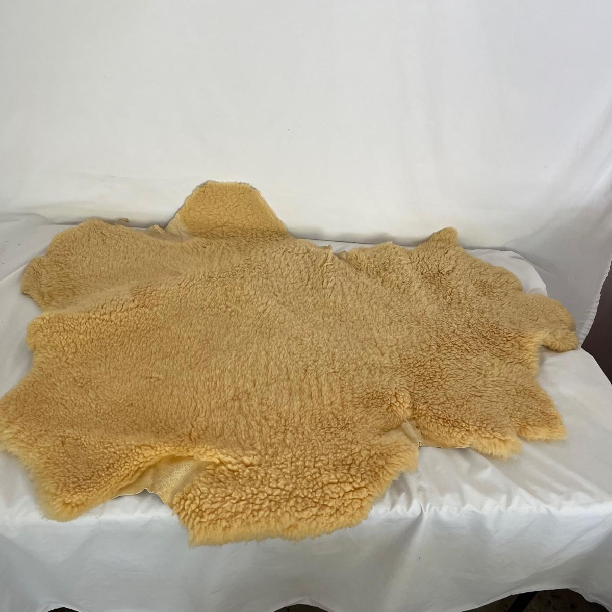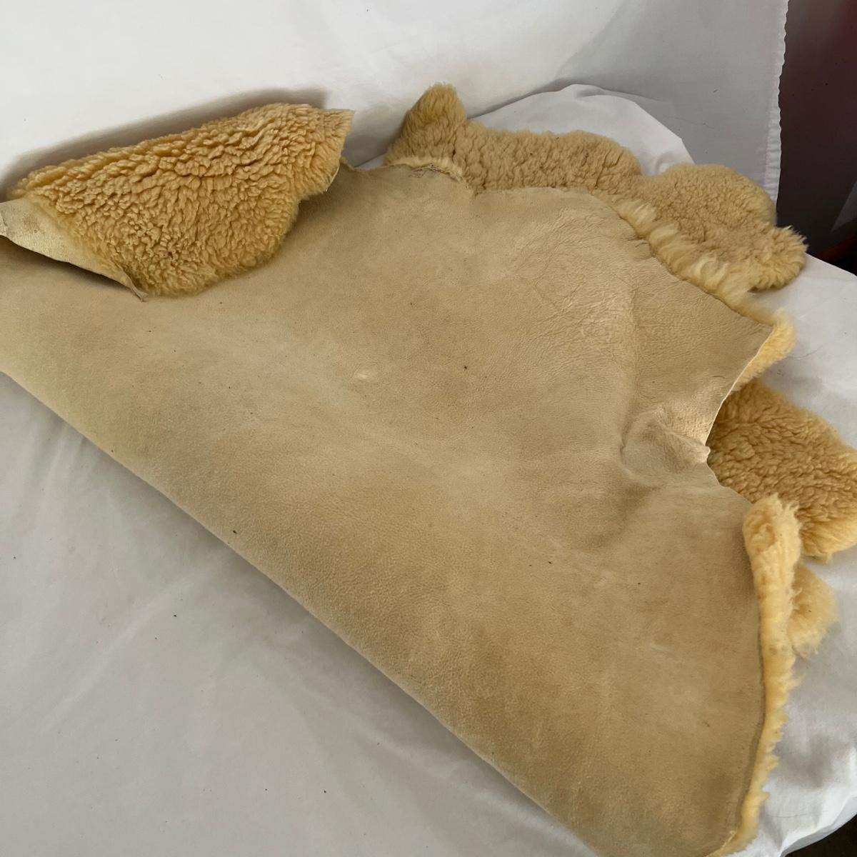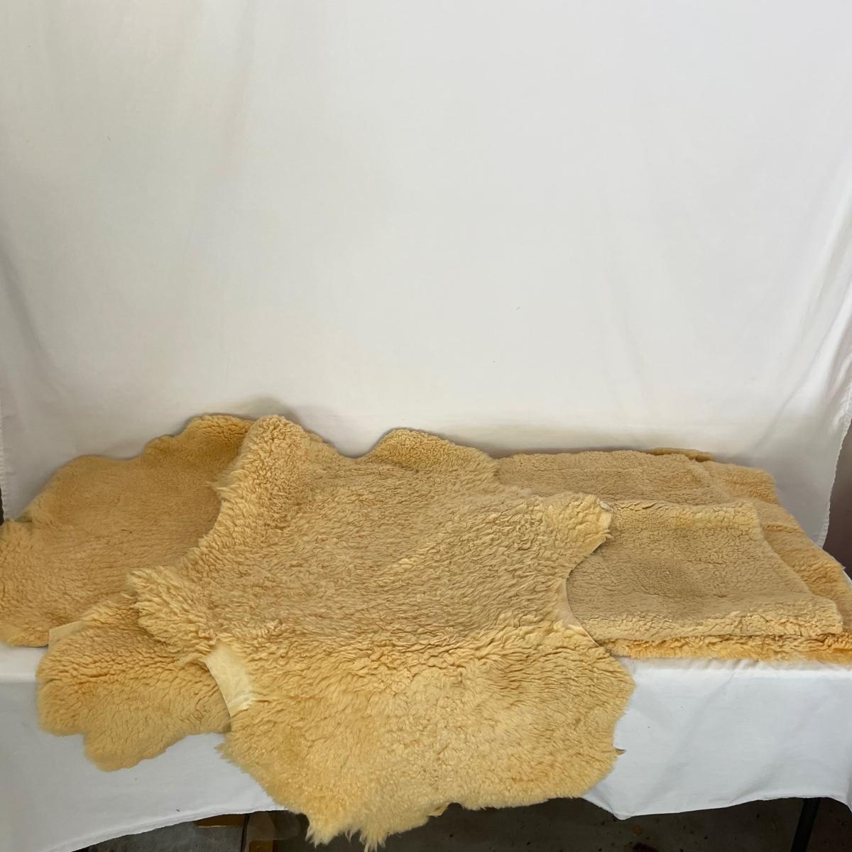 Lot includes two rectangular sheepskin rugs that measure 23” x 52”. Also includes two sheepskin pelts. No labels found to authenticate.