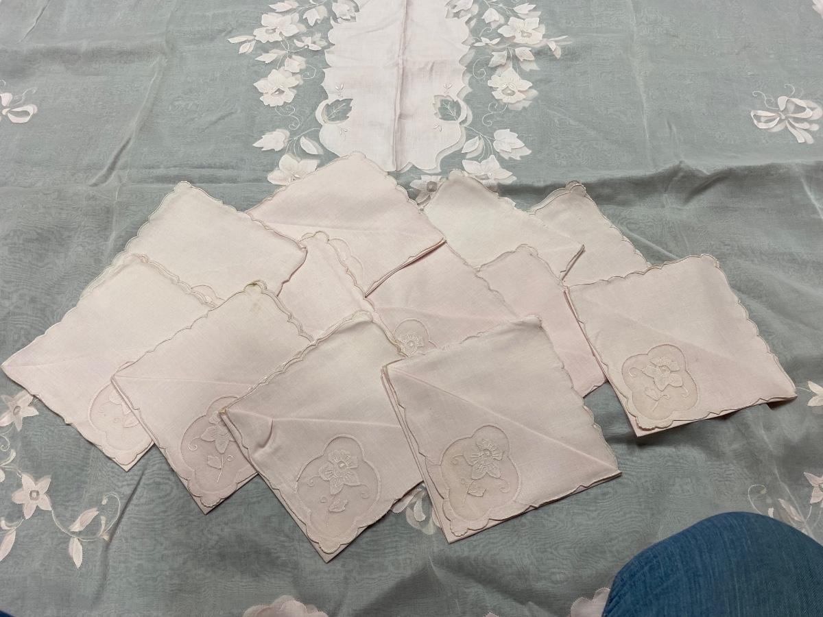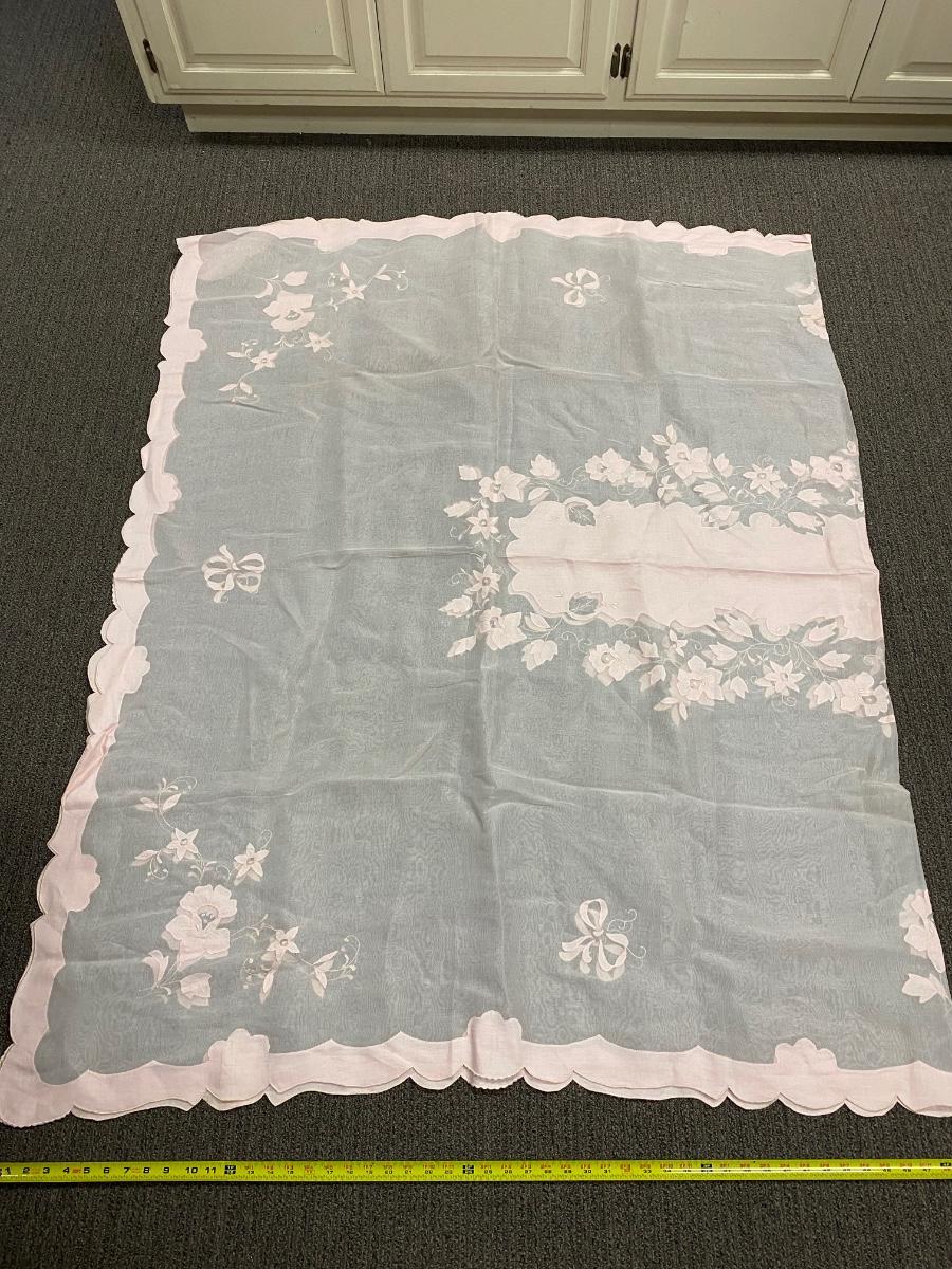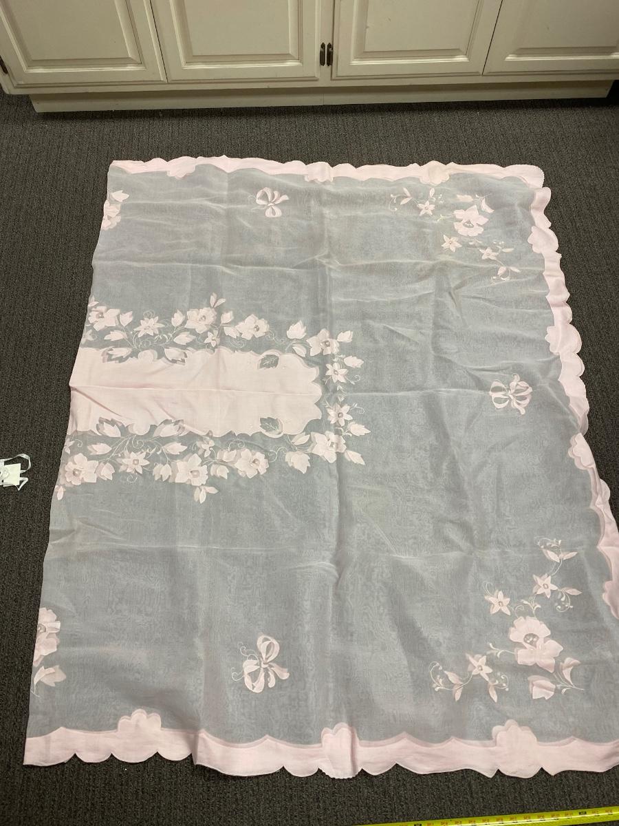 Sheer Pale Pink Tablecloth with Set of 12 Matching Napkins. Tablecloth is about 5'x8' size with a floral pattern. Some light discolor from use and age.