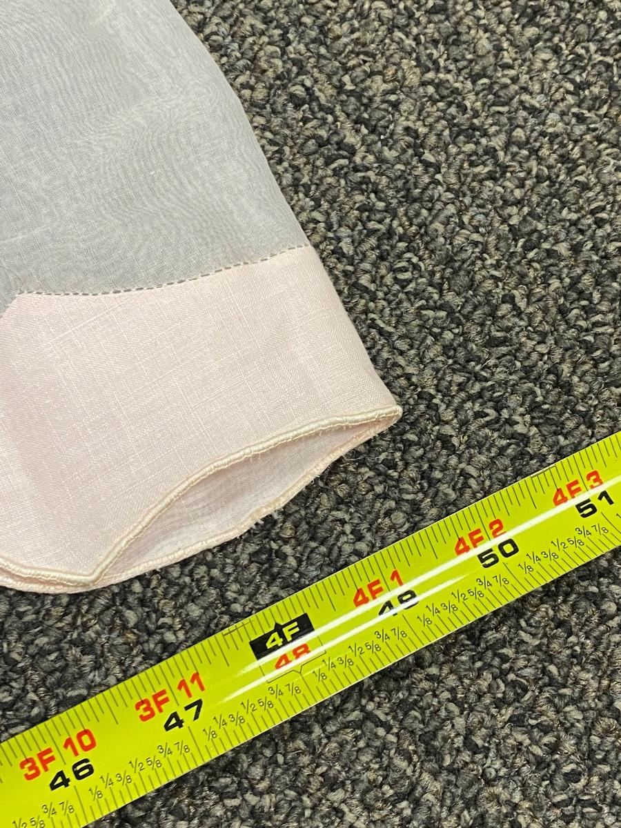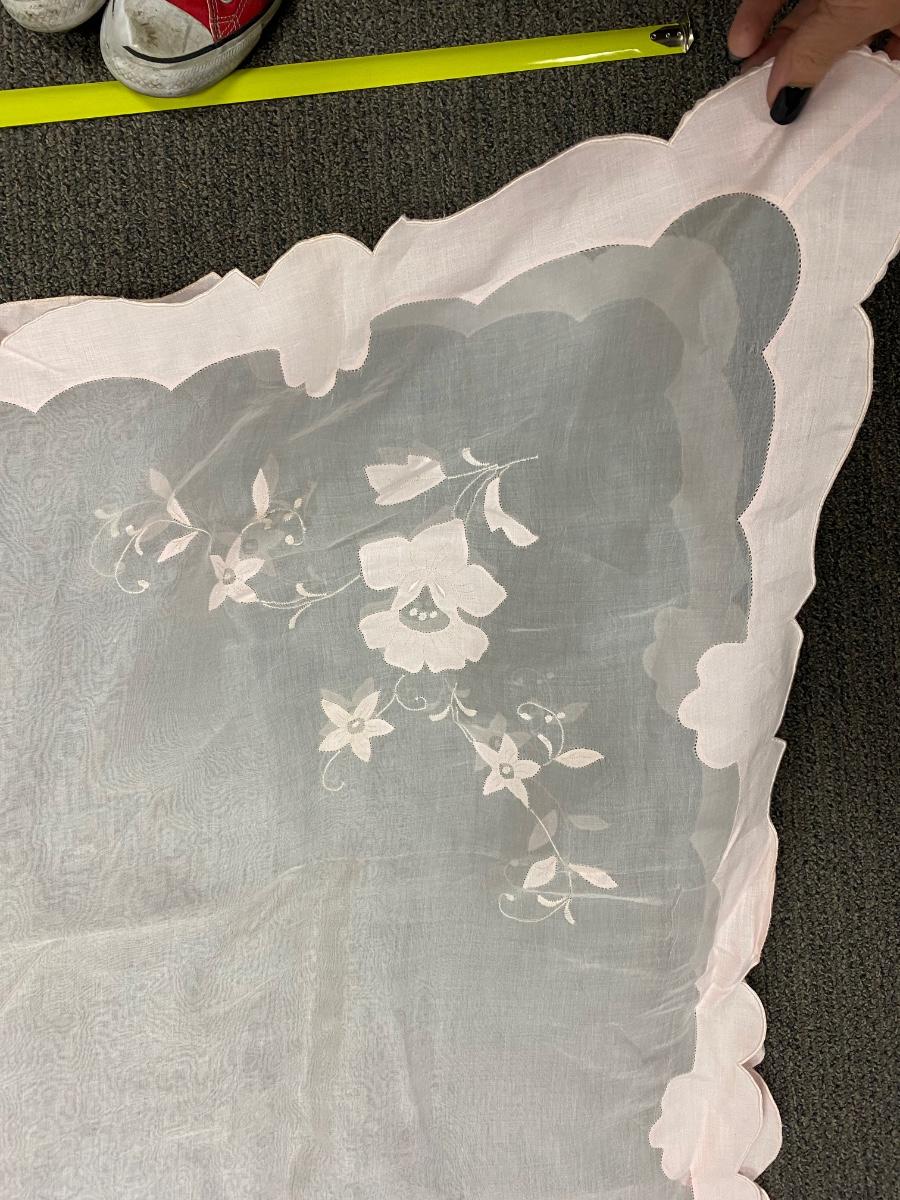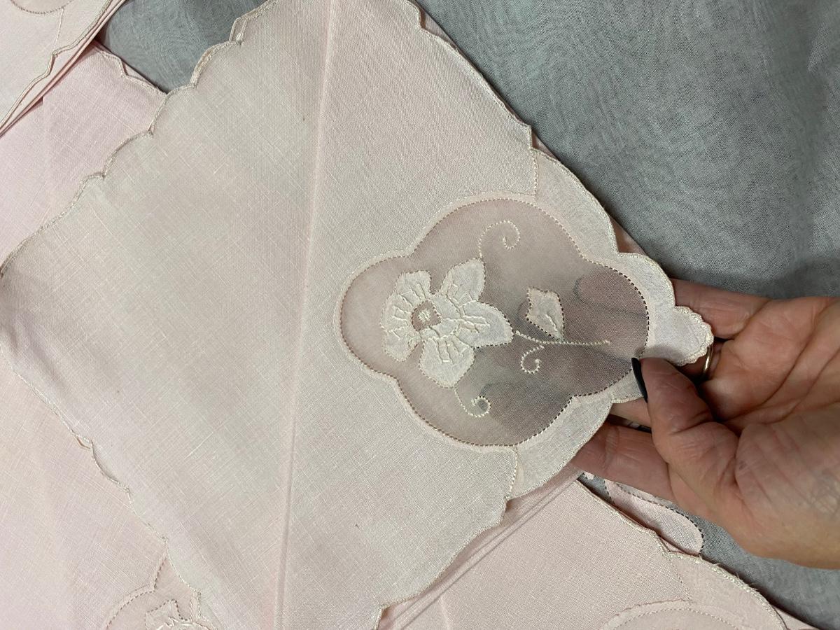 Sheer Pale Pink Tablecloth with Set of 12 Matching Napkins. Tablecloth is about 5'x8' size with a floral pattern. Some light discolor from use and age.