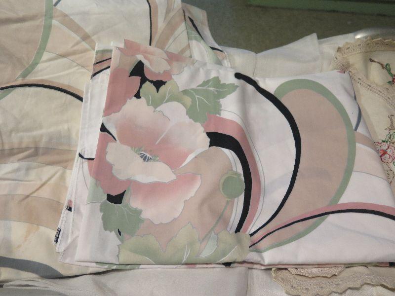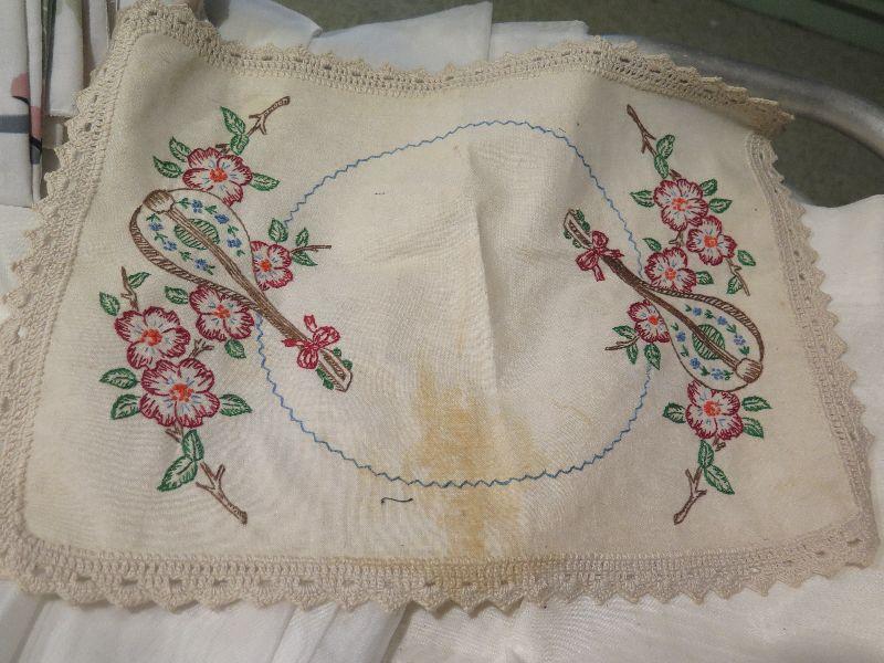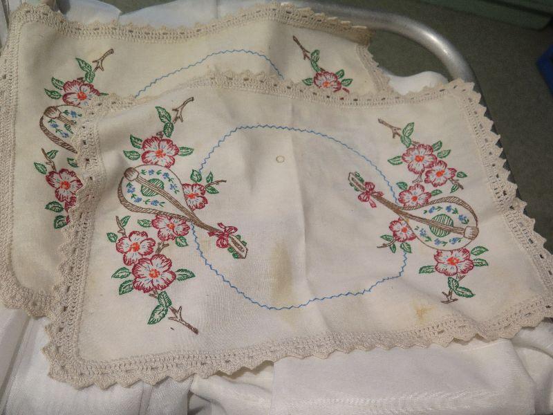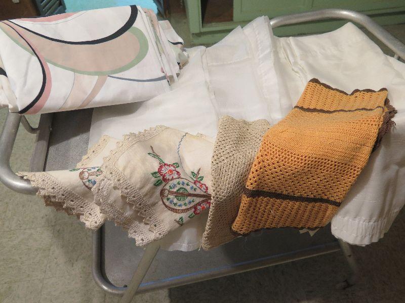 Set of sheets, twin size, hand crafted doilies, some stained, and sheer valances, 39x26. Located in basement. Please review all photos and read Terms and Conditions before placing a bid. Pick up is Wednesday, November 20 from 4-7pm and Saturday, November 23 from 9am-2pm in Mantua, New Jersey. All sales are final. All sales are as is, where is. Please bring all boxes, tools, and muscle needed to remove your items. Any photo props are not included. All measurements are approximate. Items come from dog-friendly home.
