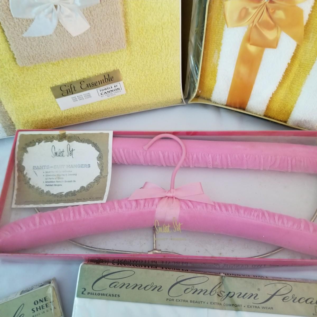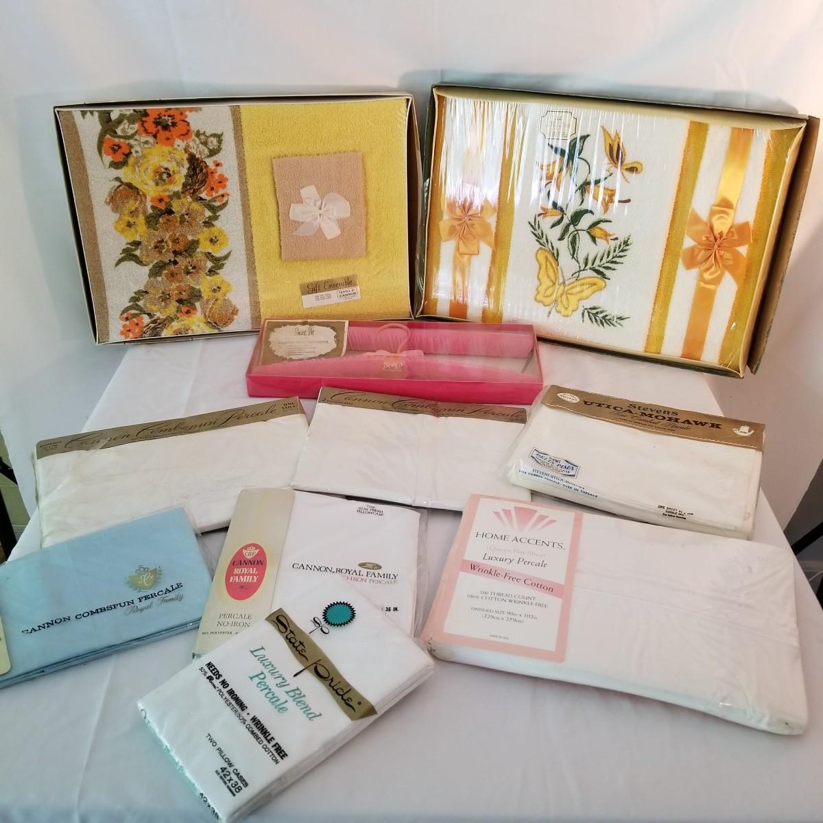 Assorted sheets, towels, and pillowcases. Cannon, Stevens, Home Accents, & more brands. Two NIB towel sets, one NIB set of padded pink suit hangers. See photos for detail and sizes. Shipping available.