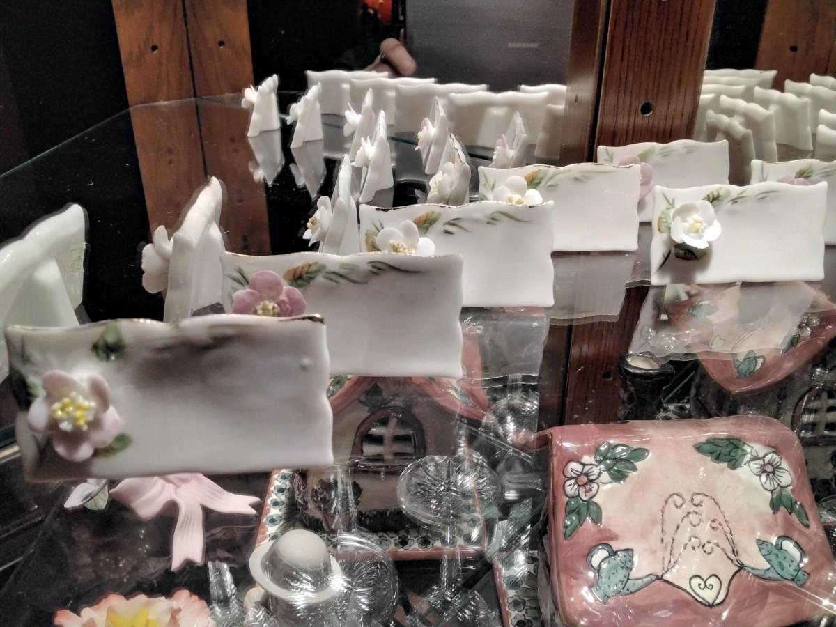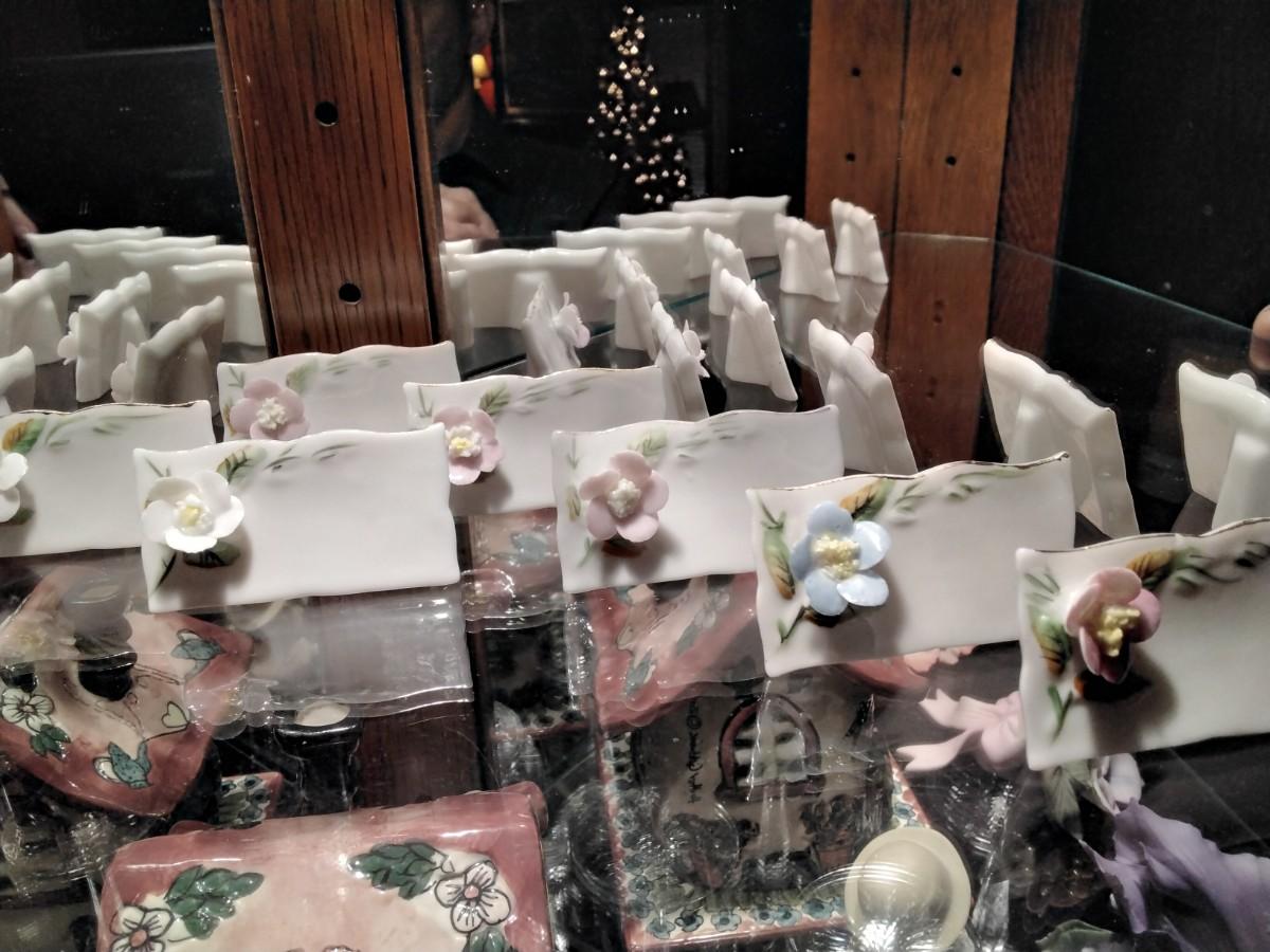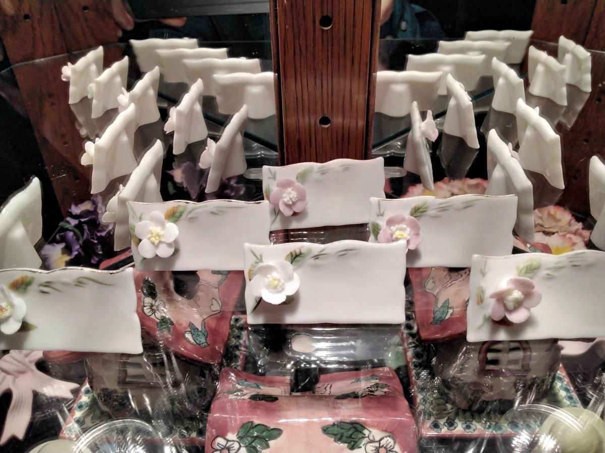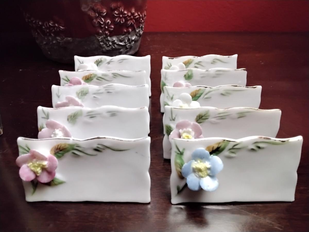 Gorgeous for that extra boost for that special dinner party. Vintage set of 10 in original boxes of Sheffield porcelain place cards - Mixed white, pink, and blue flowers. They are unused still in boxes. No chips or breaks.. Absolutely immaculate. Each is 2.5" x 1.5" tall
