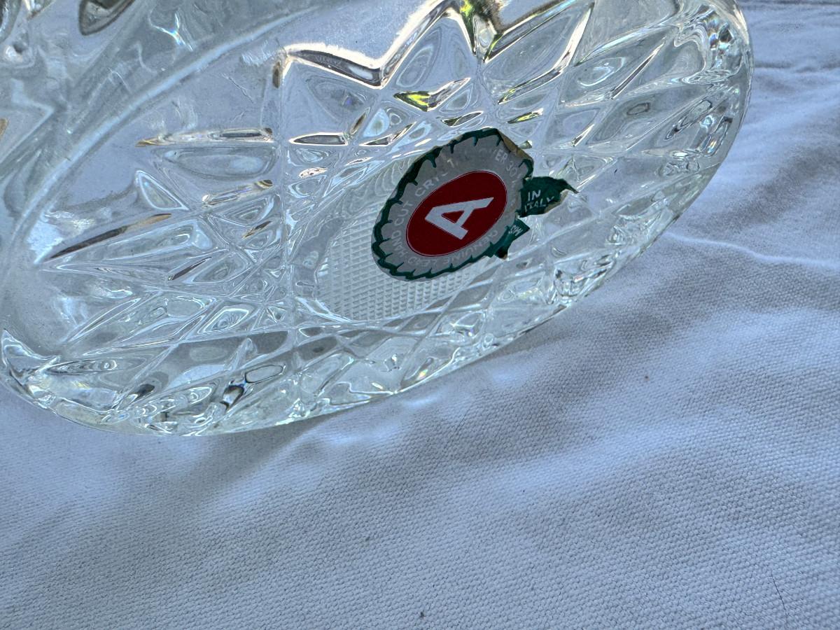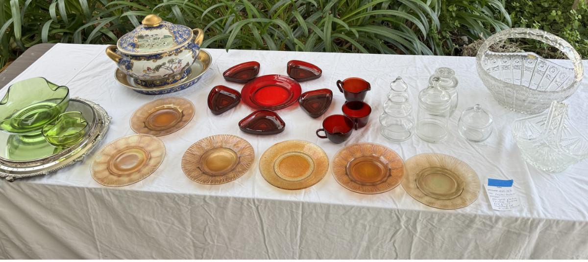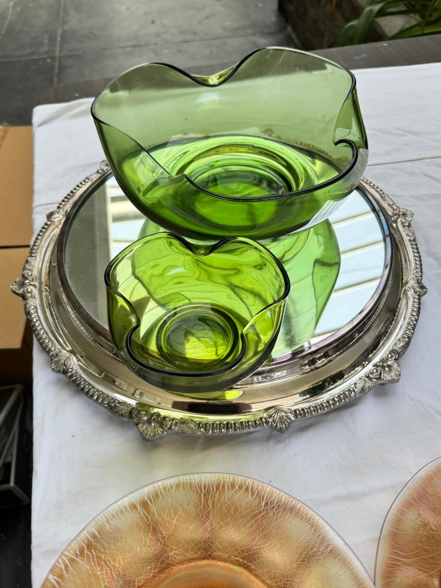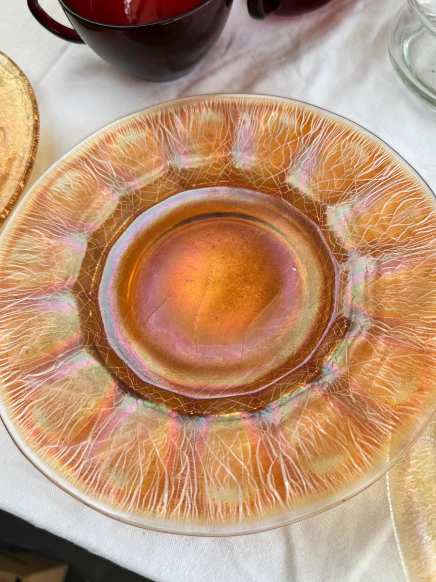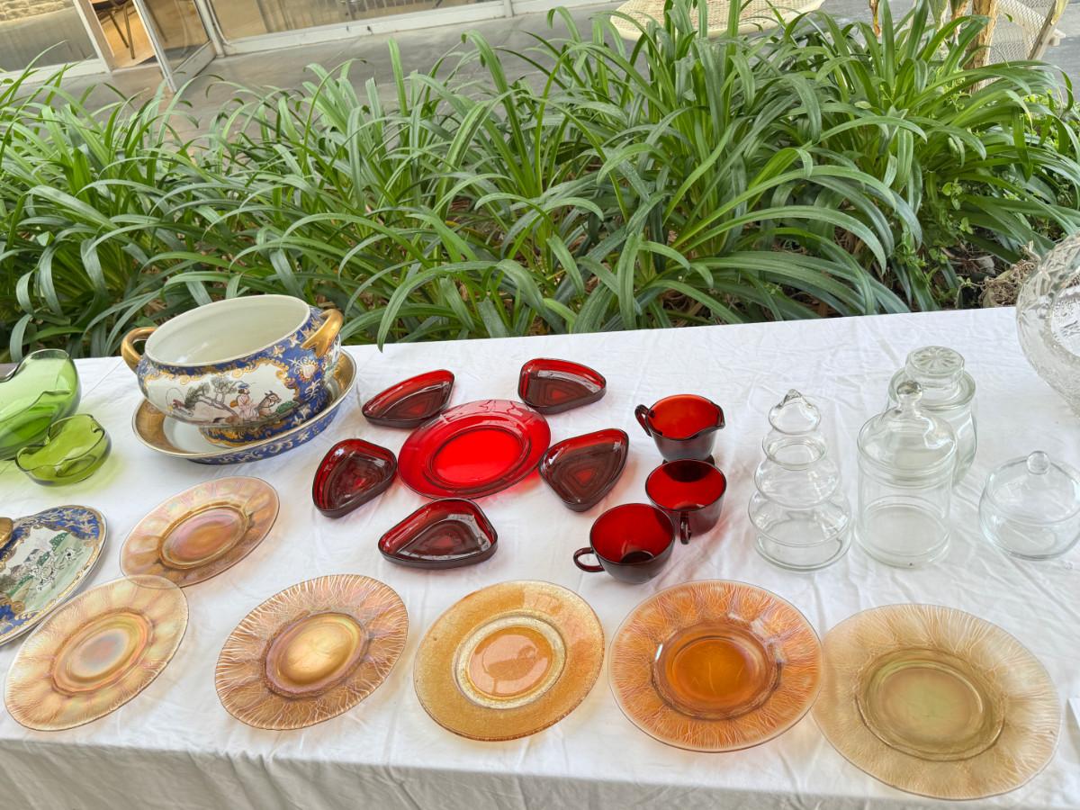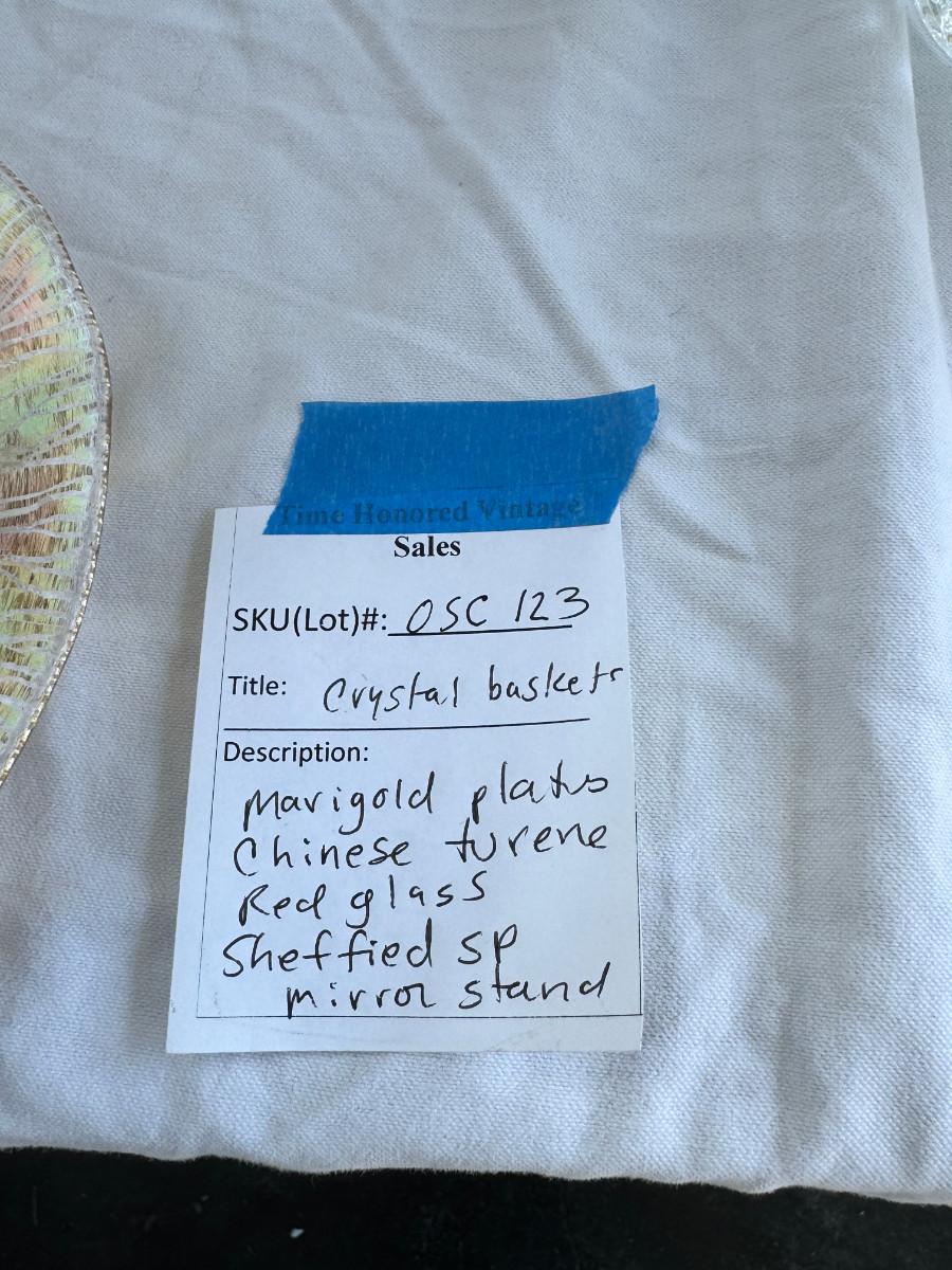 Ruby red plate and snack glass dishes, Marigold 6 "crackle" plates , Clear glass candy jars with lids. Large pink glass serving bowl. Cut Crystal Easter Basket, Mid century green glass fold bowls. No Shipping