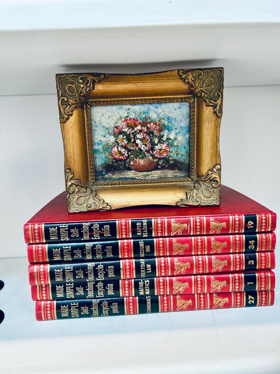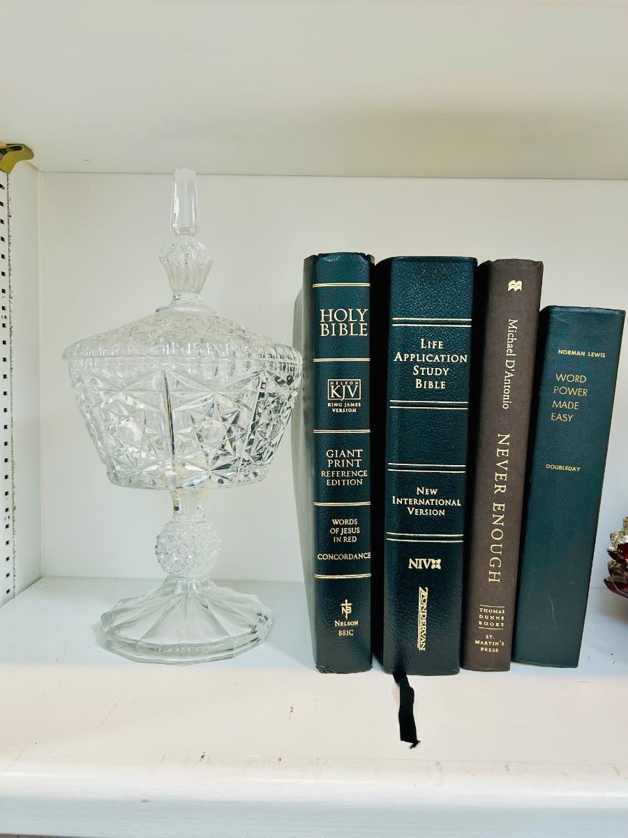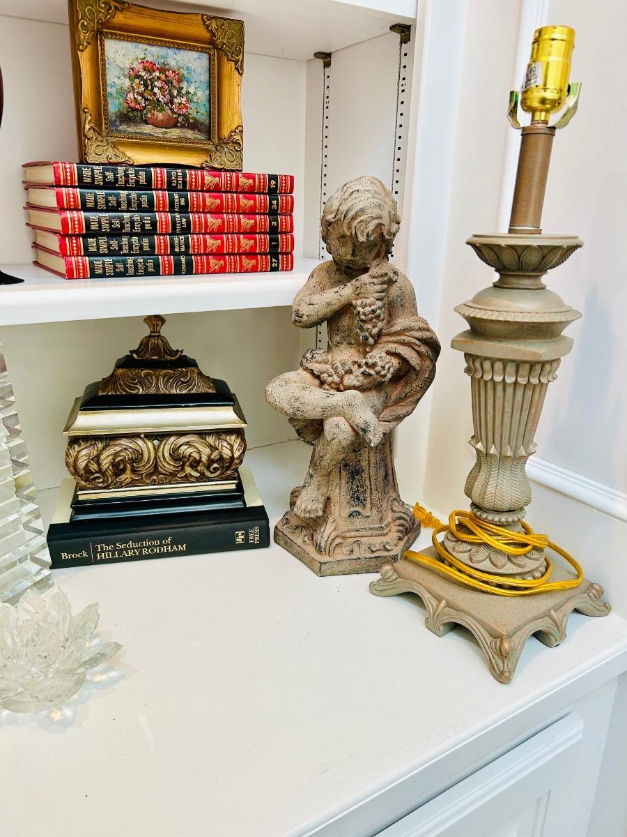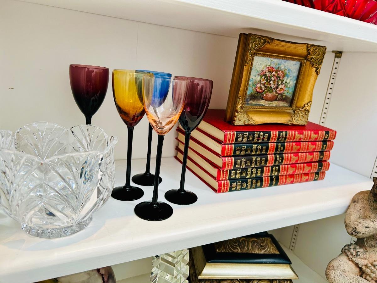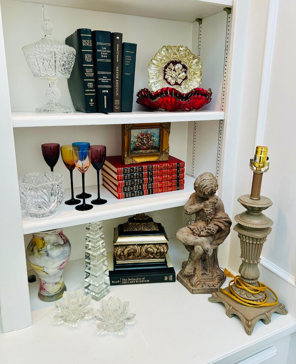 Shelf Contents - Original Art, Goofus Glass, books, Statue, stemware, lamp, Crystal