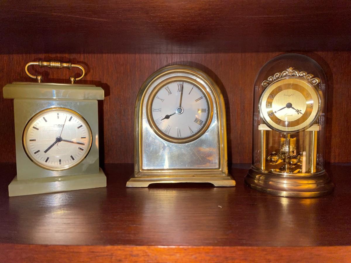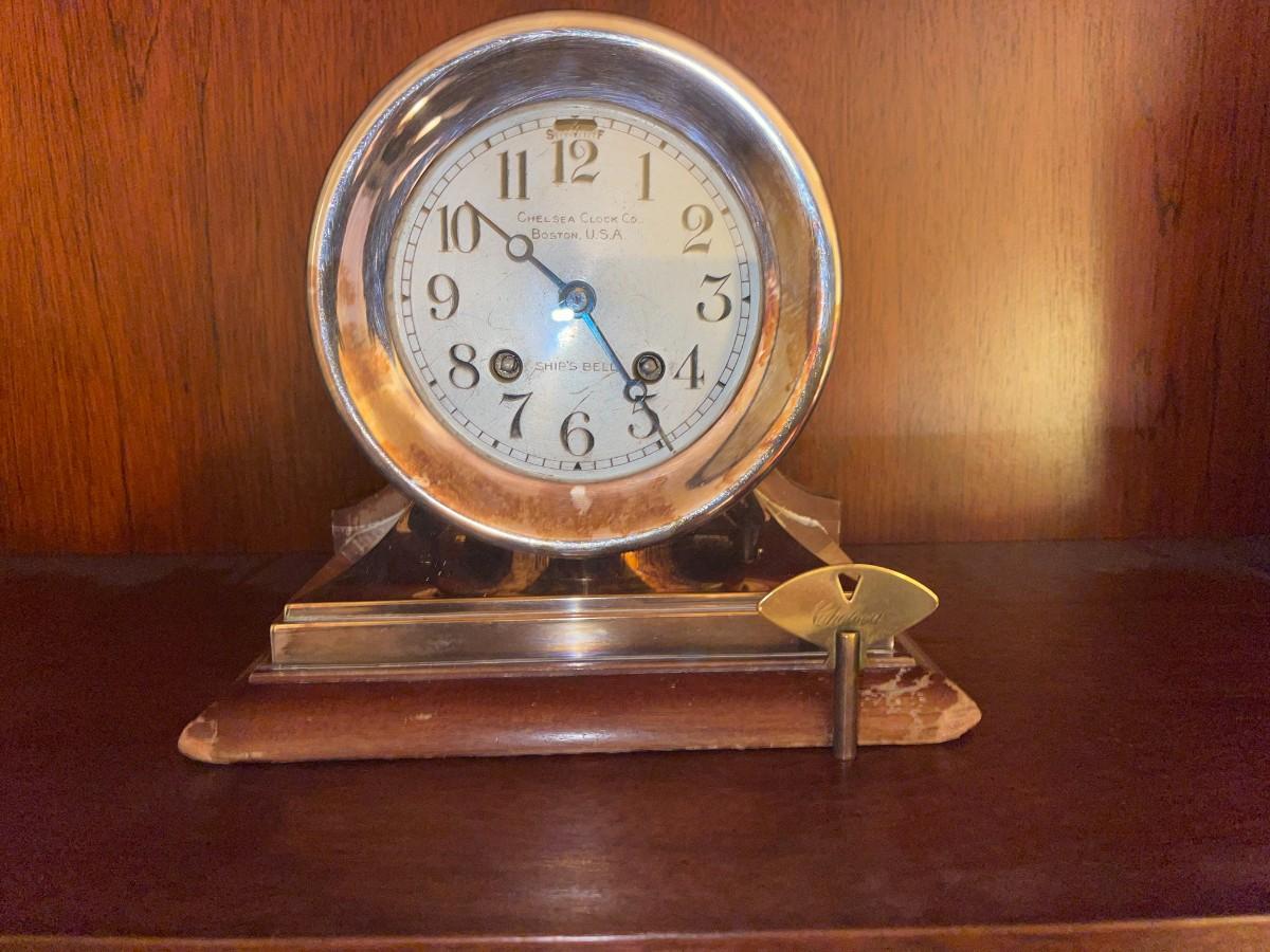 See pics Set of 3 small clocks and 1 medium sized clock from the Chelsea Clock Company with key, possibly silver plate?