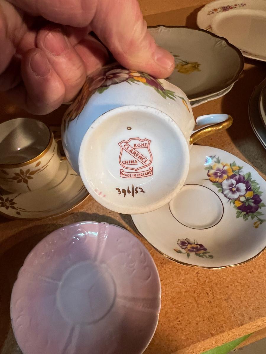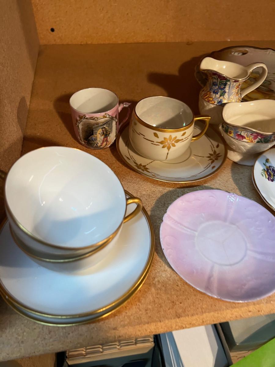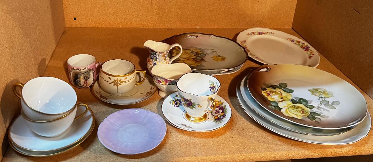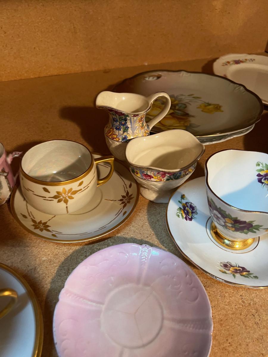 Shelf full of Mixed China; Tea cup, Cream & Sugar Plates etc.