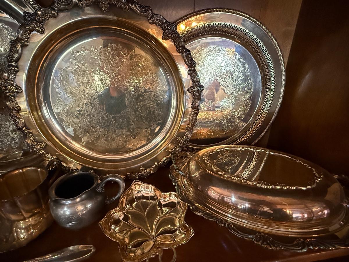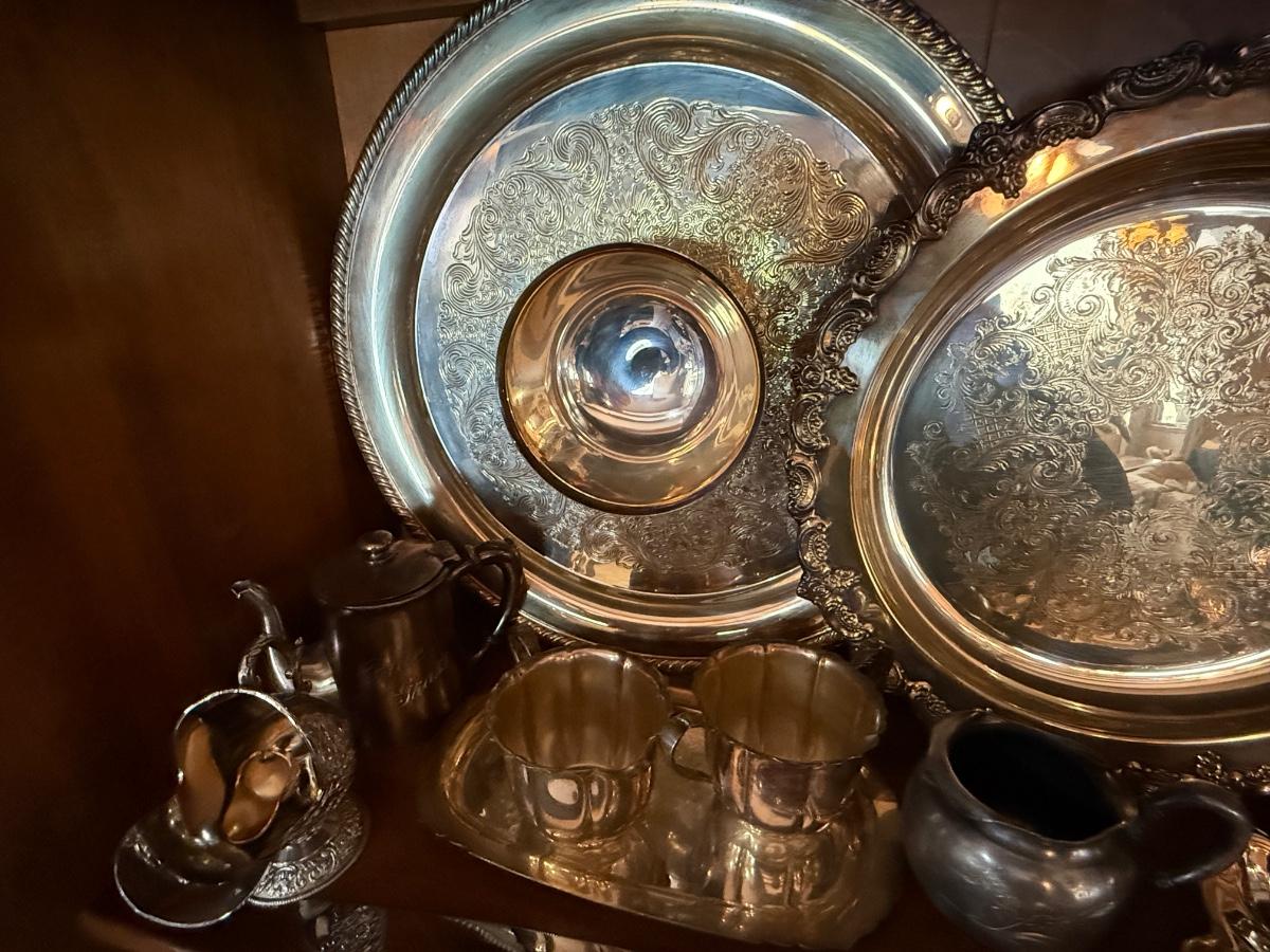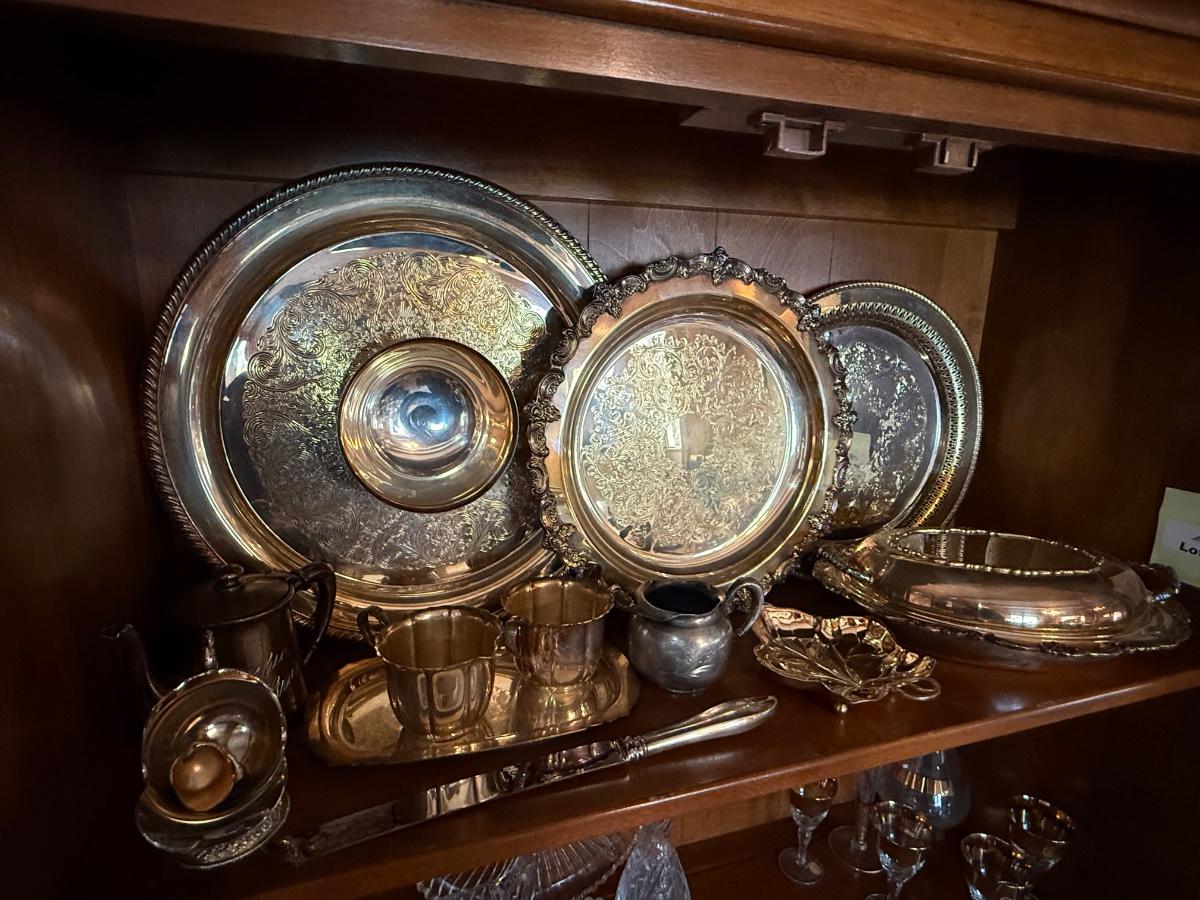 Shelf full of silver-plate pieces - platters, cups, etc.,