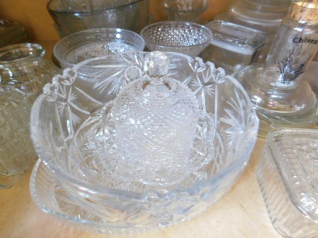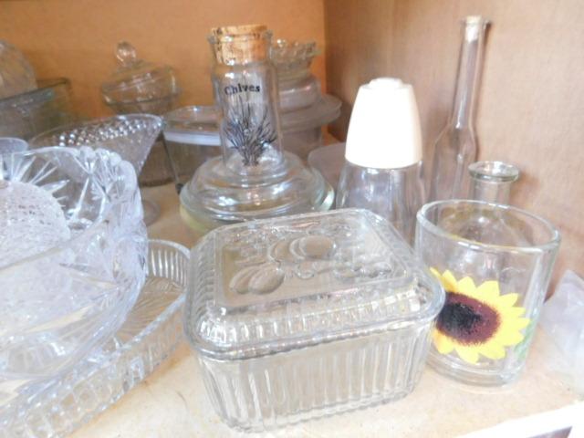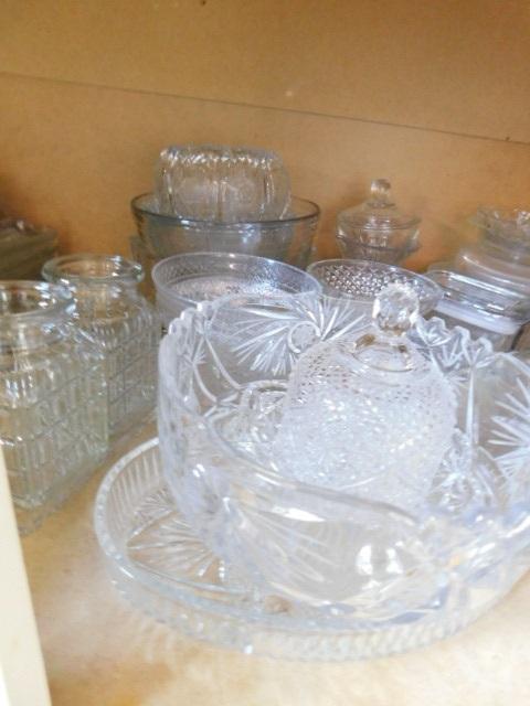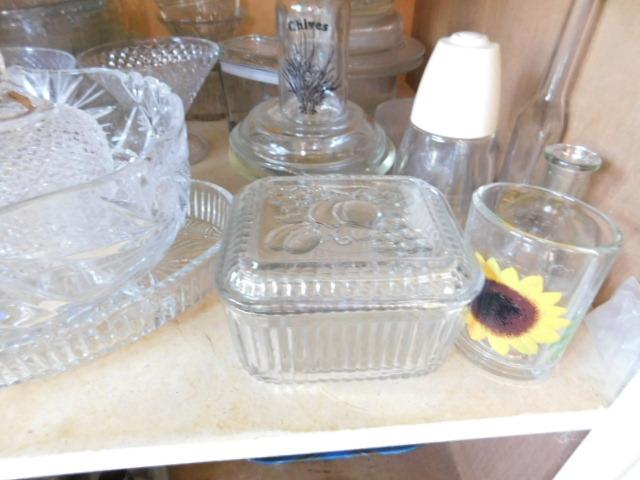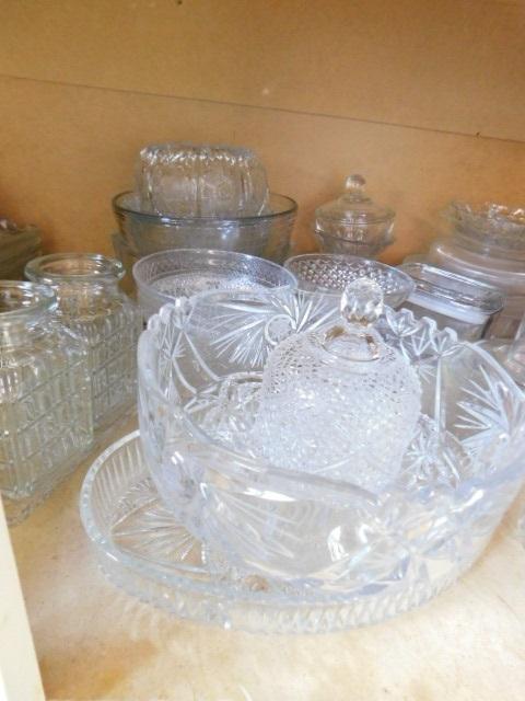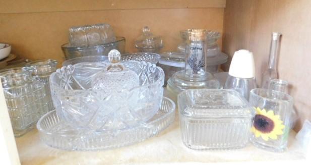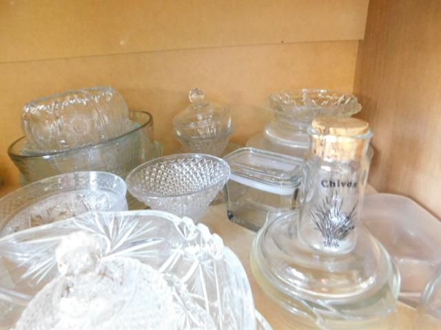 Shelf of Miscellaneous Glassware. Various plates, bowls, cruets, refrigerator dishes.