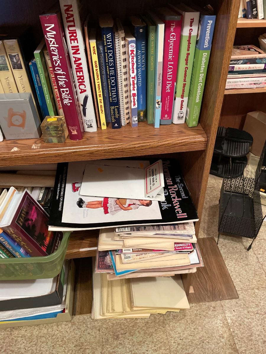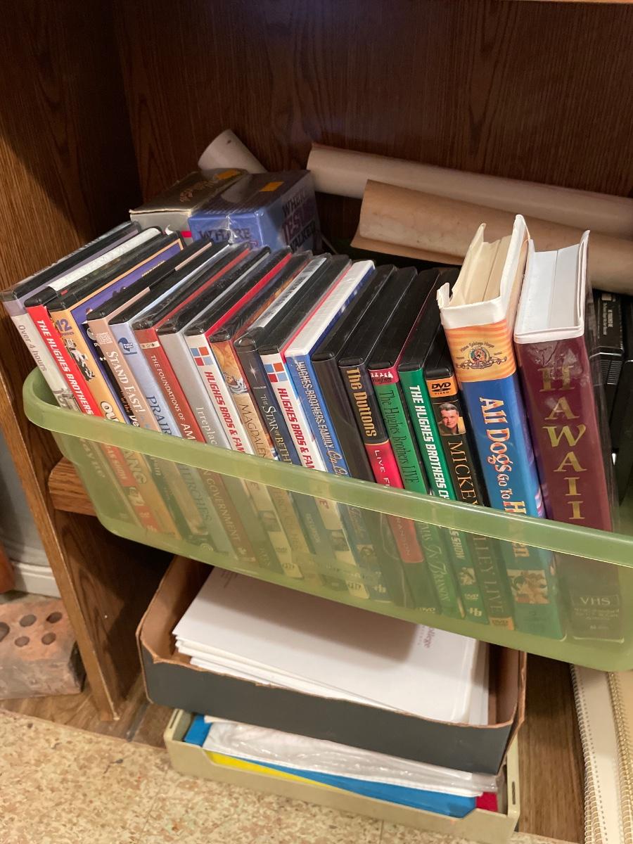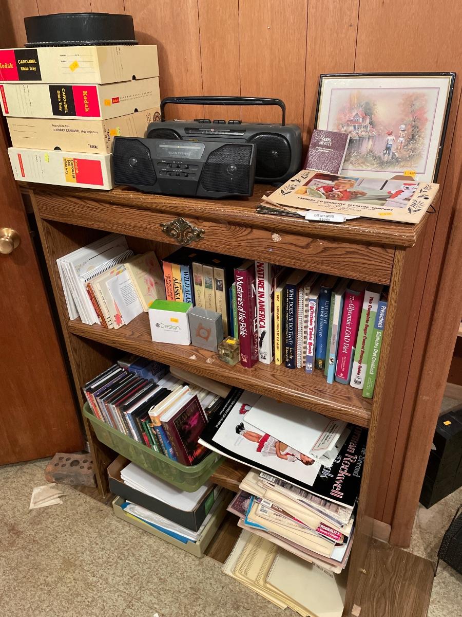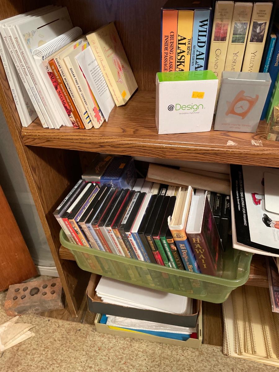 Shelving unit included. Lots of items! DVDs, 8 tracks, books, and more! Located in Basement.