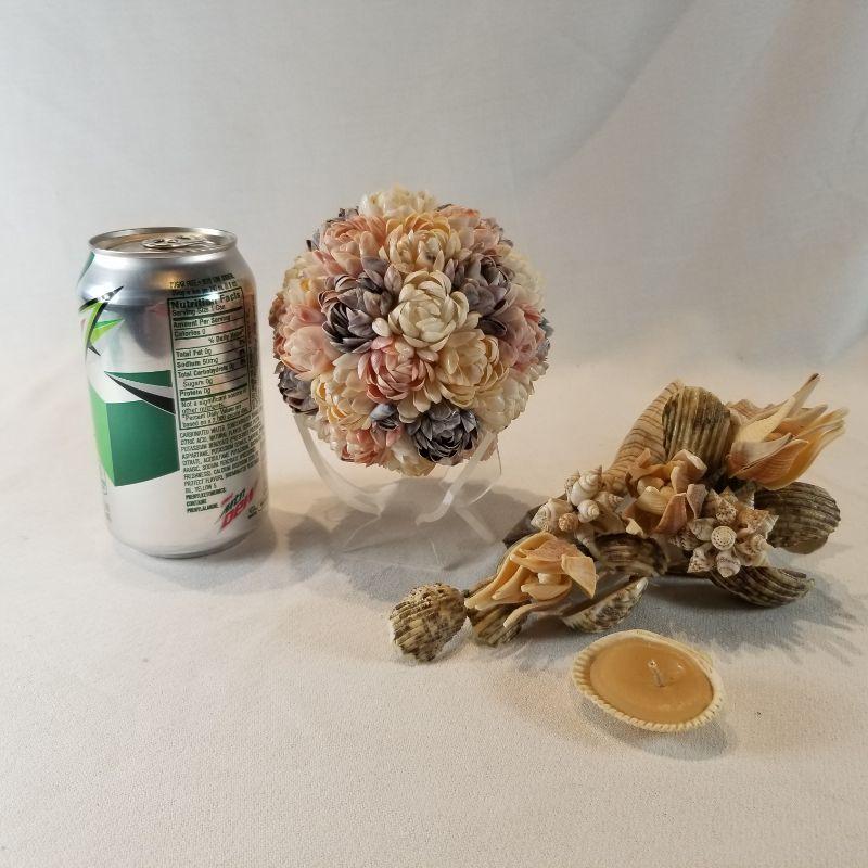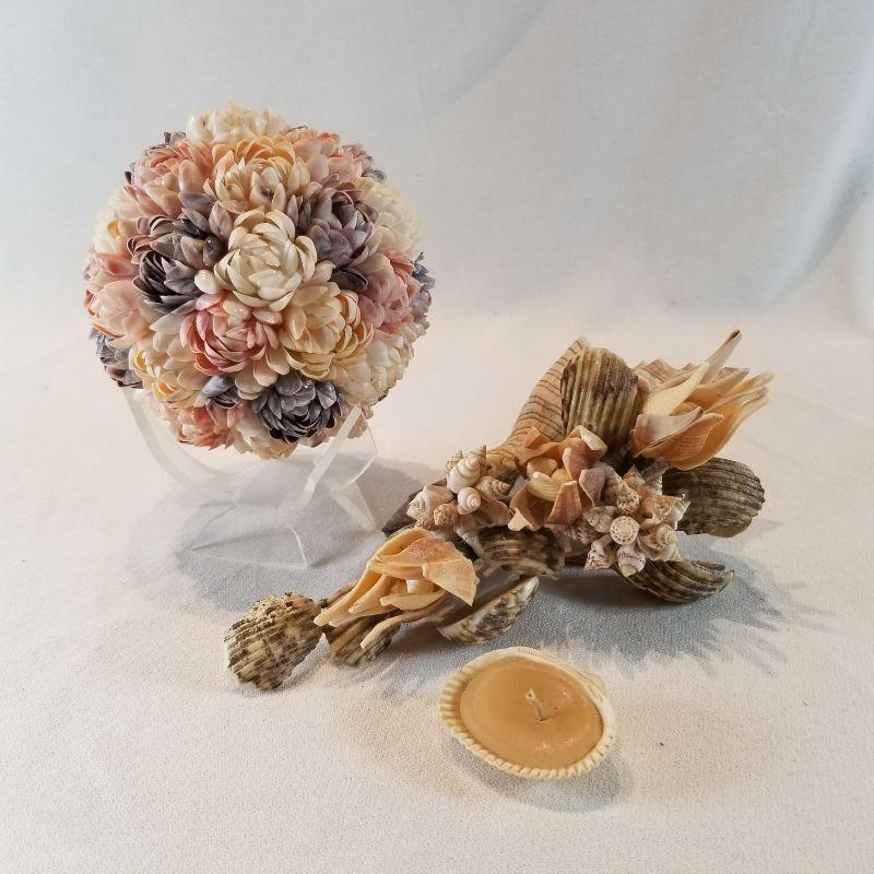 This offering is a small collection of fun items designed with shells. Sea Shell Ball comes with an acrylic stand for easier display, a really unique and fun shell art piece - showing a flower design and a small shell with a candle.