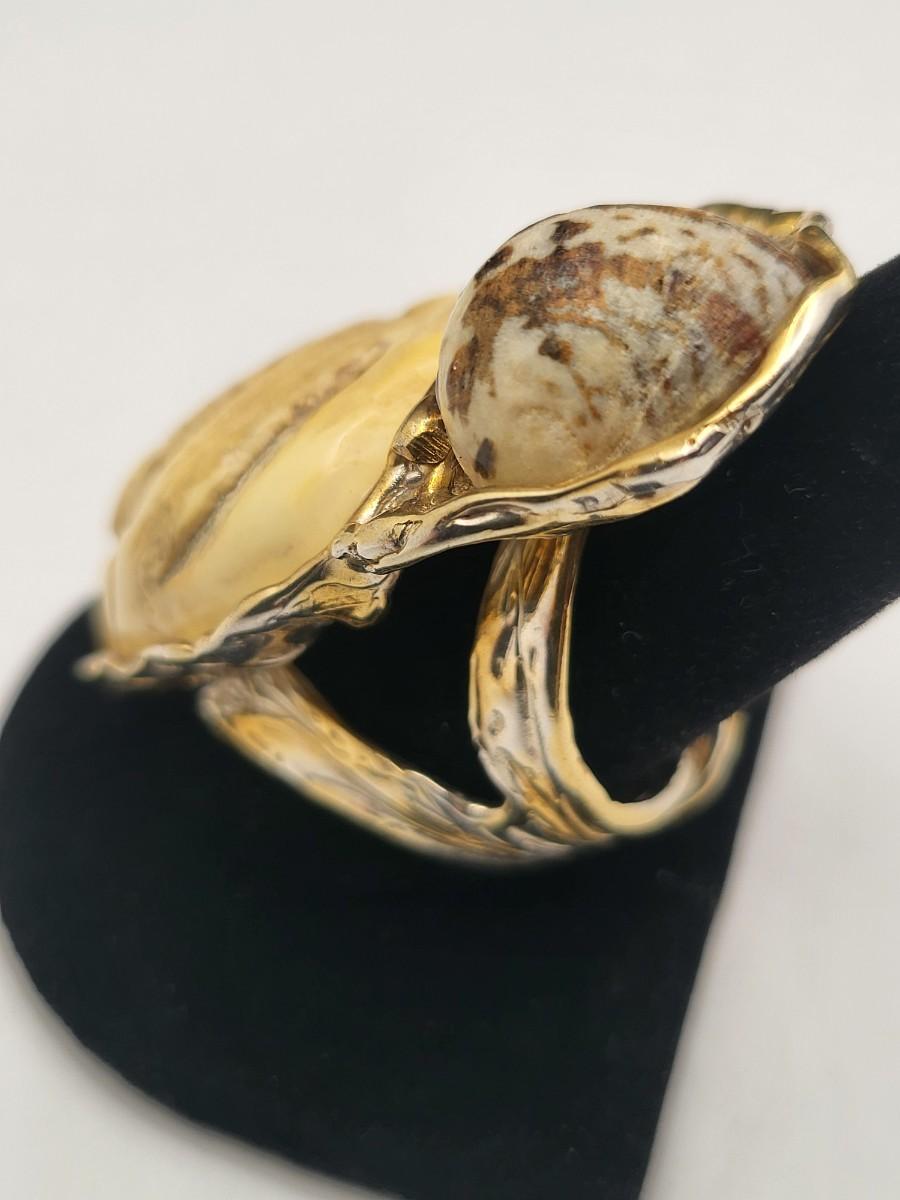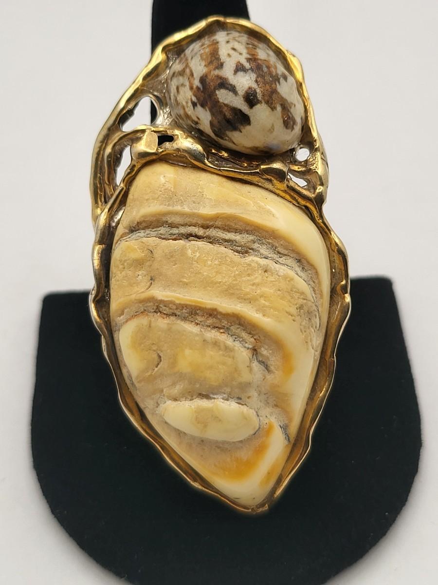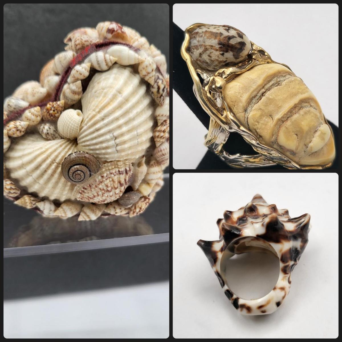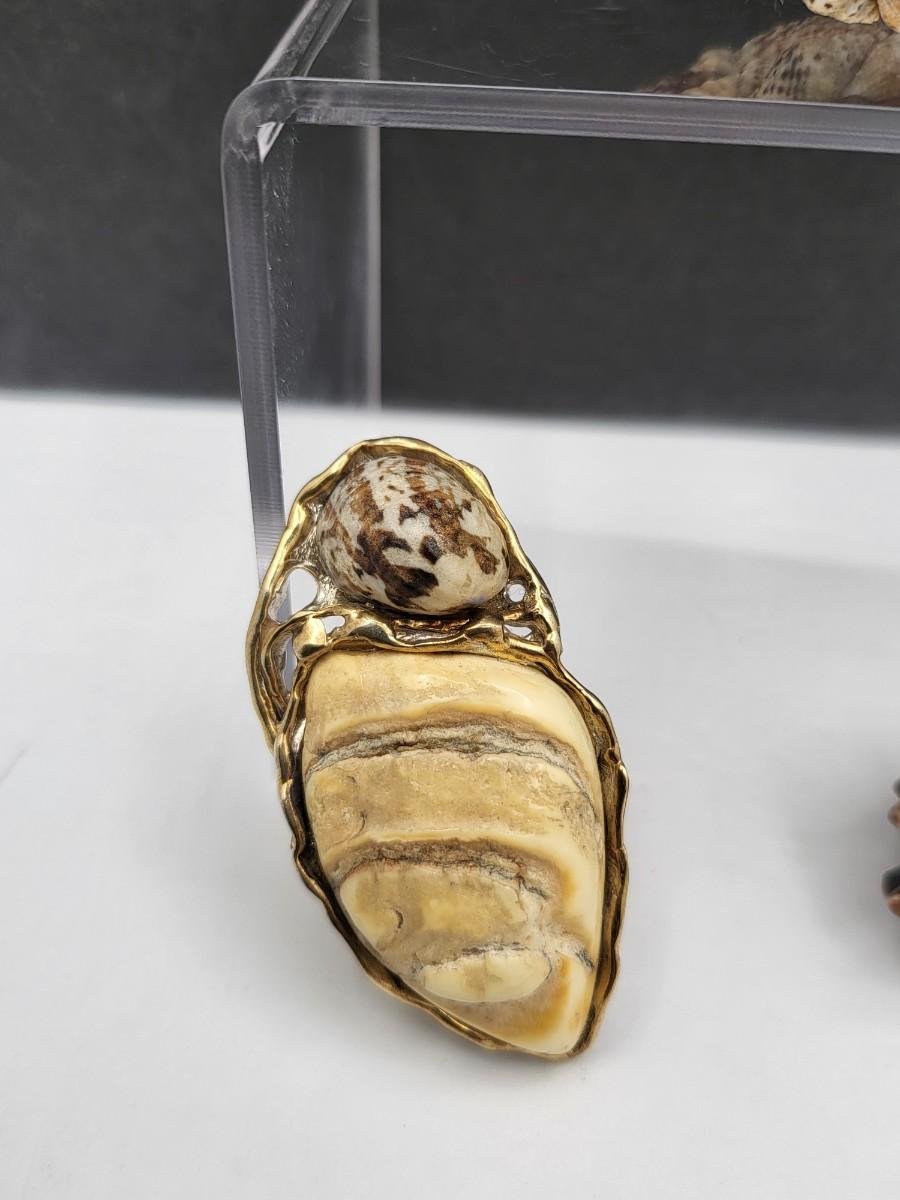 Large artisan/brutalist shell & bone(?) ring with gold and silver metal band. It's an unusual design and resembles a beetle. It is an unsigned, one of a kind piece. It is a size 11. The face of the ring is extra large, 2.5" long x 1.25" wide, with an open shank & somewhat adjusted band. Very solid piece. Seashell ring is a size 9 and is 1.5" x 1.5" x 1.75. Very comfortable on the finger. Felt lined seashell heart box is 3" wide x 2.5" tall x 2" deep.