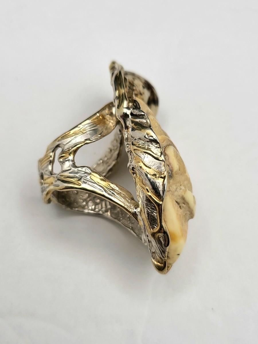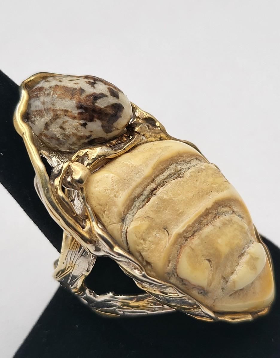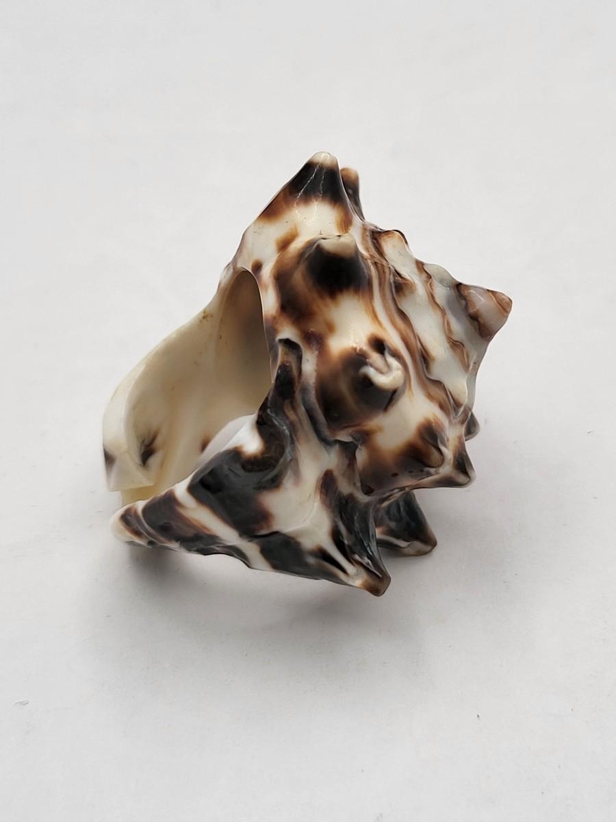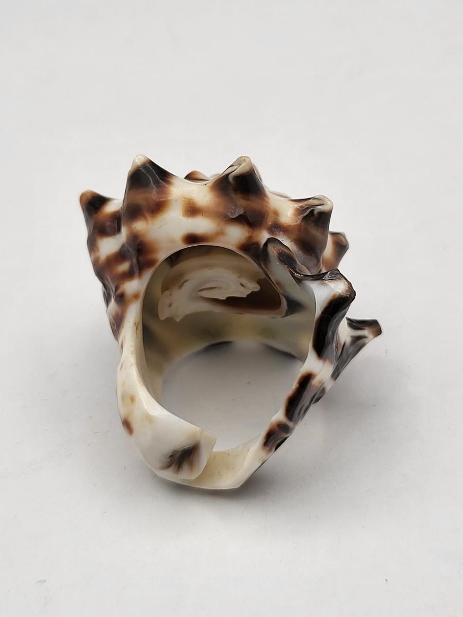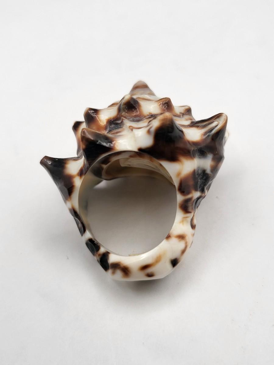 Large artisan/brutalist shell & bone(?) ring with gold and silver metal band. It's an unusual design and resembles a beetle. It is an unsigned, one of a kind piece. It is a size 11. The face of the ring is extra large, 2.5" long x 1.25" wide, with an open shank & somewhat adjusted band. Very solid piece. Seashell ring is a size 9 and is 1.5" x 1.5" x 1.75. Very comfortable on the finger. Felt lined seashell heart box is 3" wide x 2.5" tall x 2" deep.