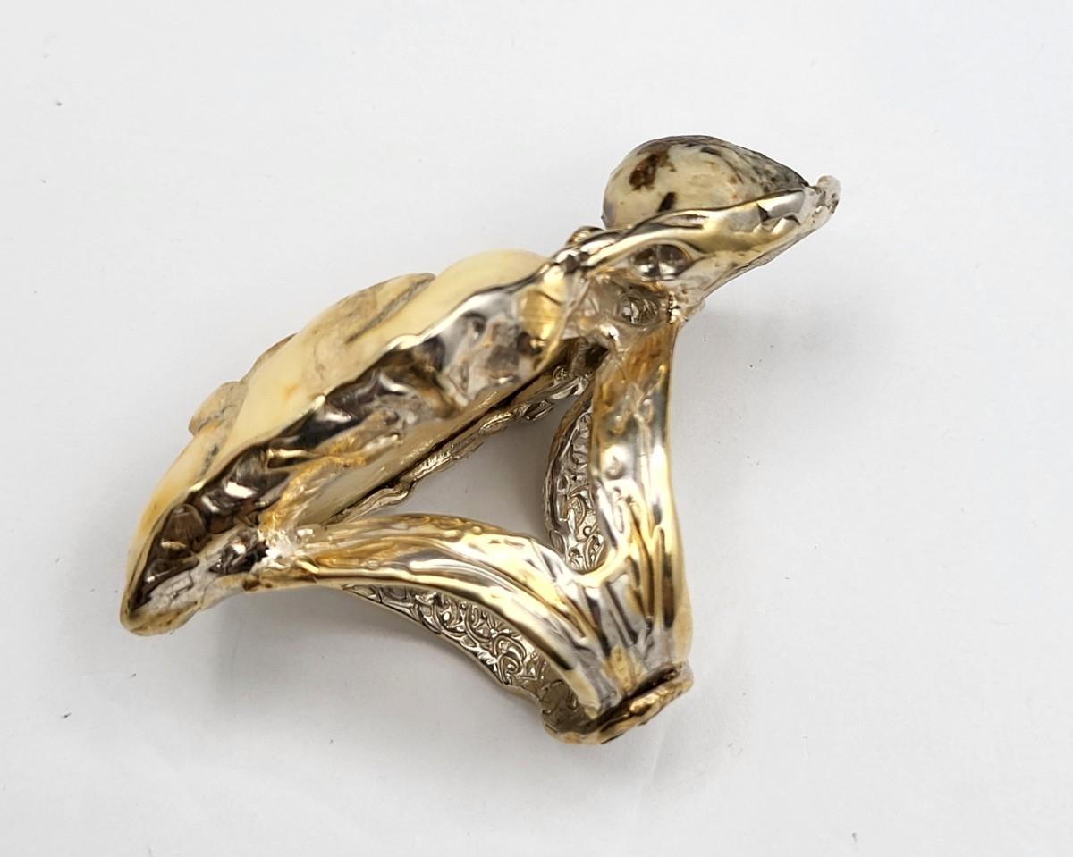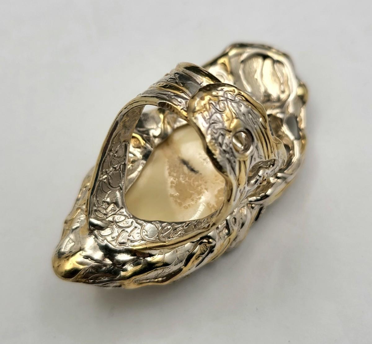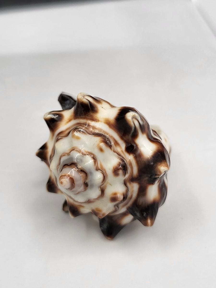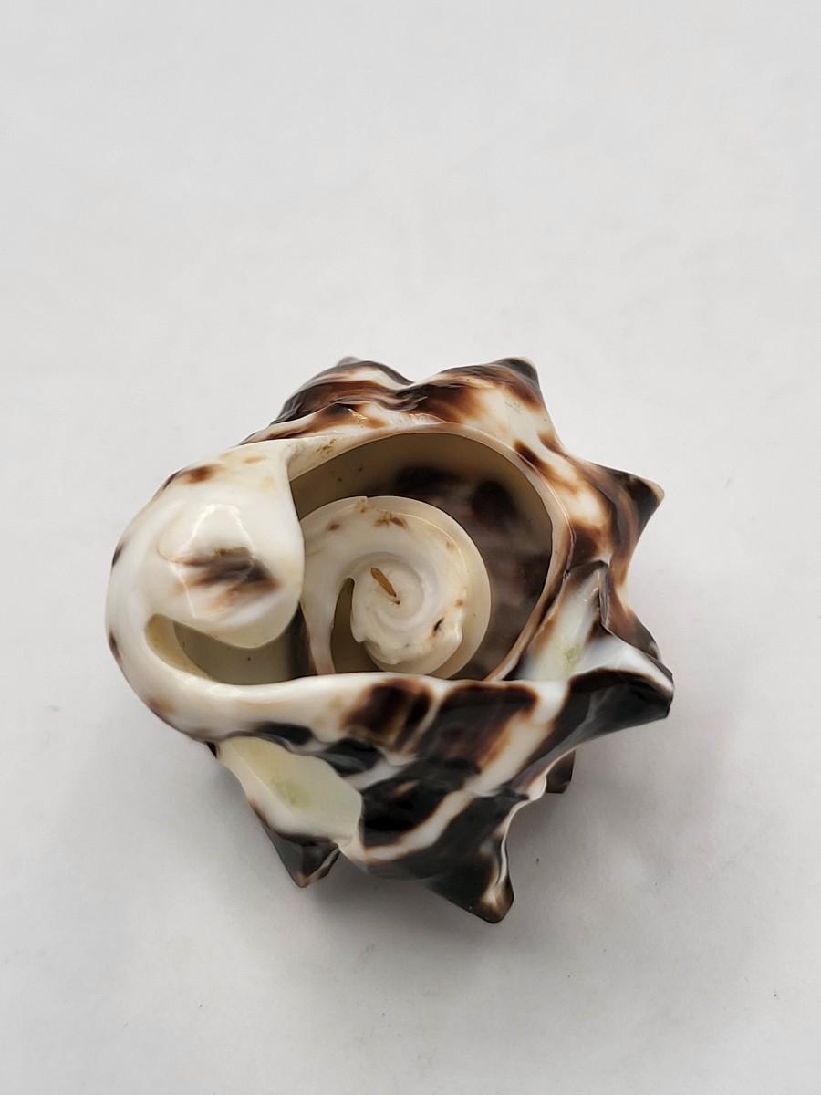 Large artisan/brutalist shell & bone(?) ring with gold and silver metal band. It's an unusual design and resembles a beetle. It is an unsigned, one of a kind piece. It is a size 11. The face of the ring is extra large, 2.5" long x 1.25" wide, with an open shank & somewhat adjusted band. Very solid piece. Seashell ring is a size 9 and is 1.5" x 1.5" x 1.75. Very comfortable on the finger. Felt lined seashell heart box is 3" wide x 2.5" tall x 2" deep.