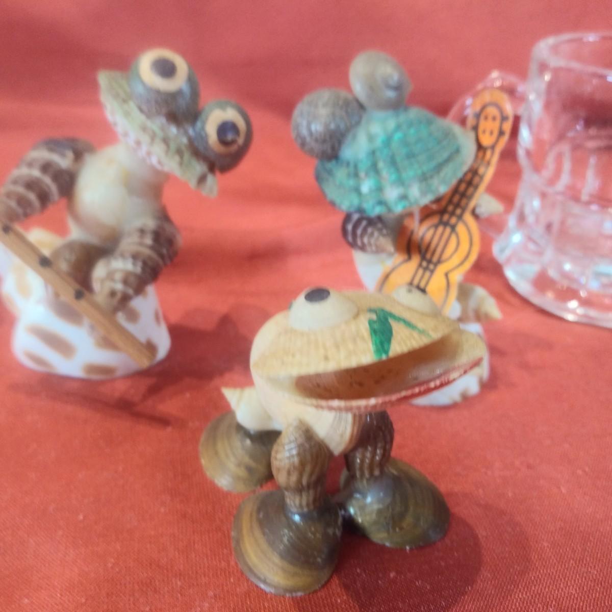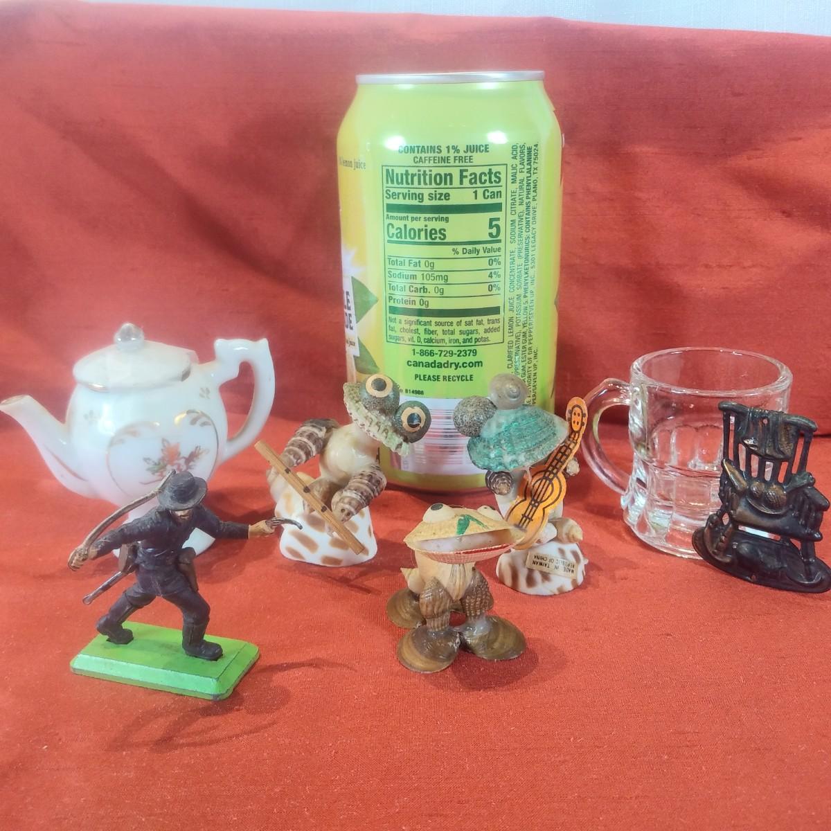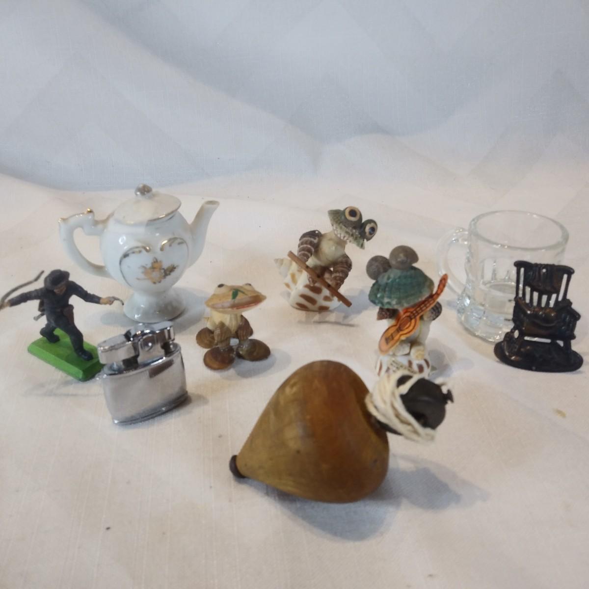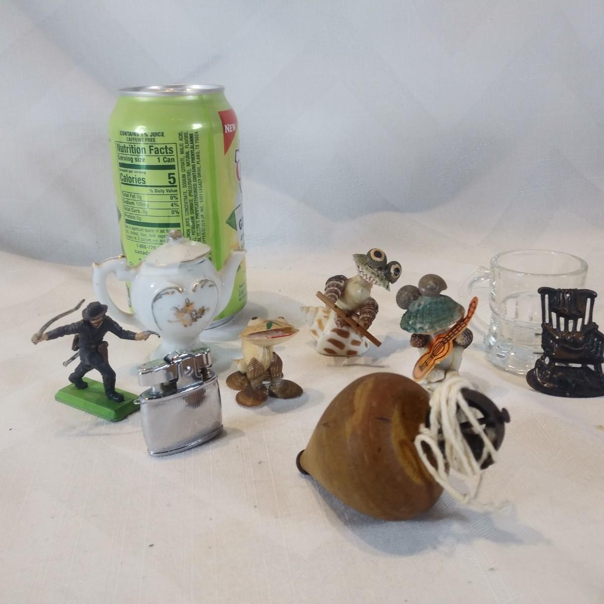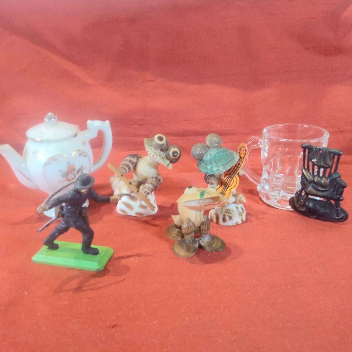 This auction lot is a grouping of a Shell Frog Band and More. It has a frog band made of shells, a miniature tea pot, a mini mug, a flat rocker plaque and a toy soldier made in England, a miniature working lighter and old wooden toy top. All are just for fun. What can you do with these nifty items?