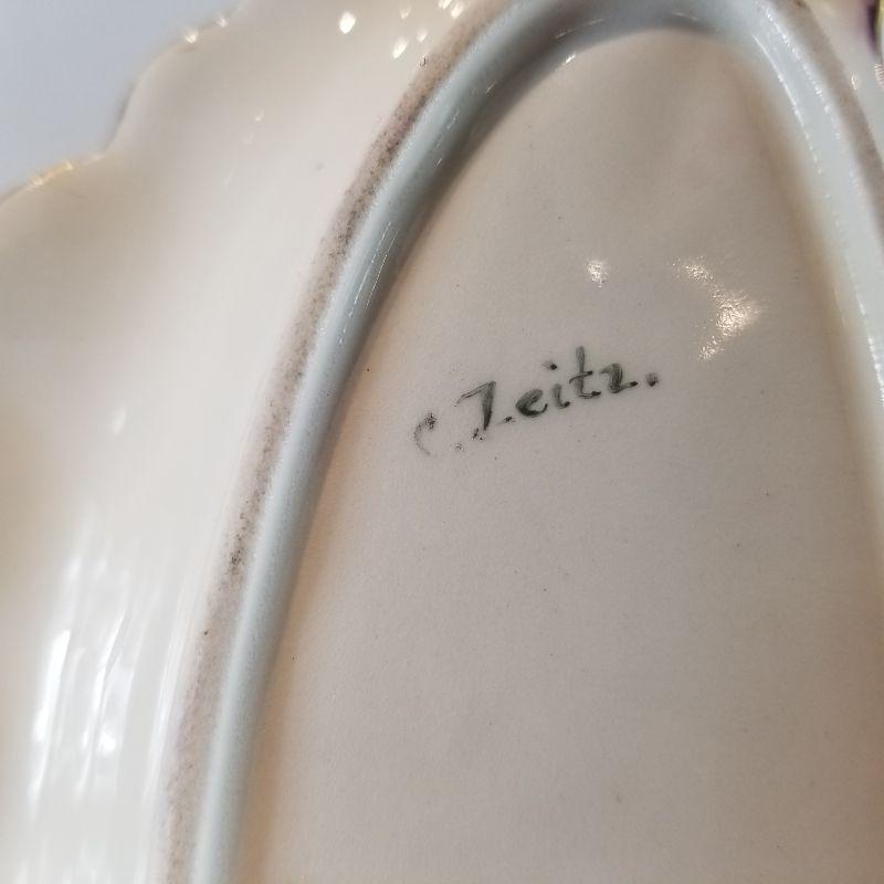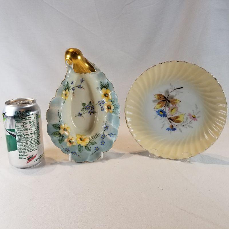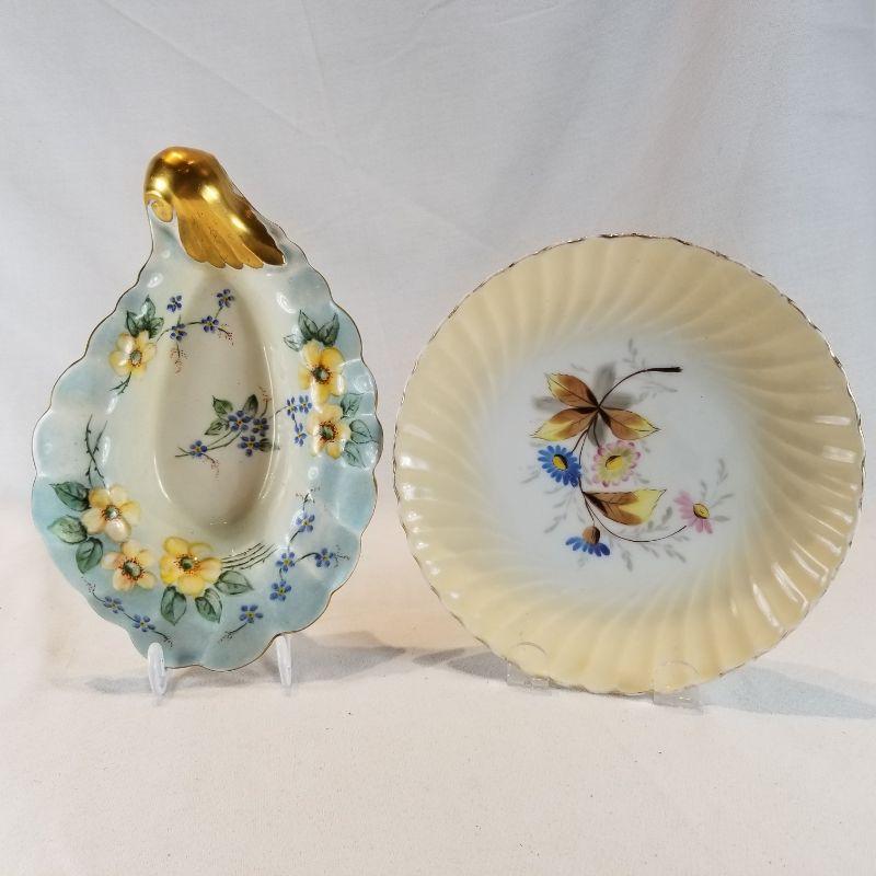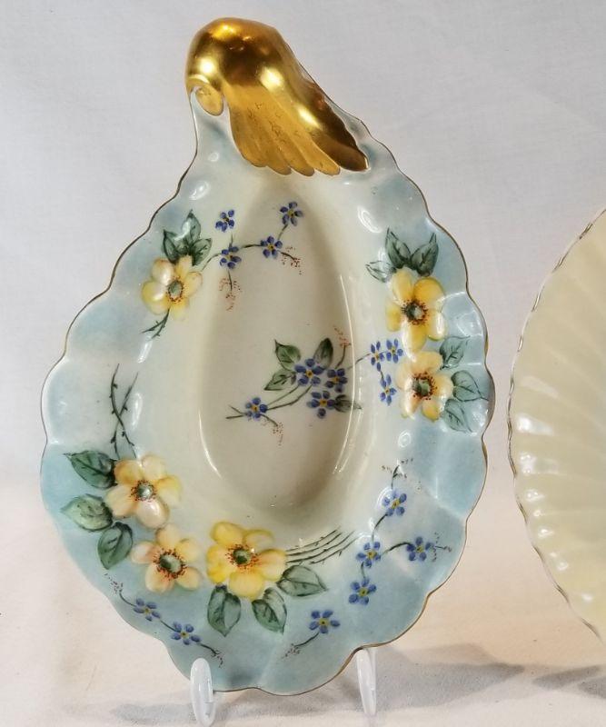 Two lovely shell-inspired, hand-painted pieces of china. Either would be great for loading down with Christmas candy or homemade cookies. Gold edging in very good shape. One is signed Fleitz. Both are in very good condition.