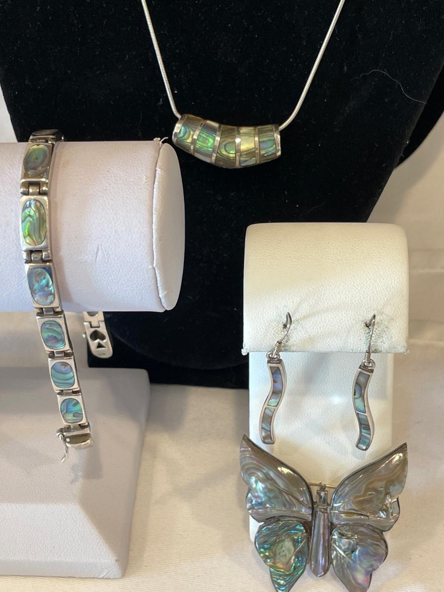 Includes earrings, pin, bracelet & necklace