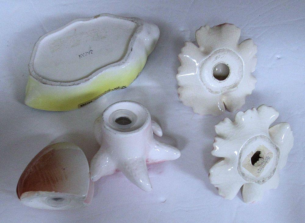 Good shape. Shells are from Seaside, Oregon and flowers are from Sylvan Pottery of Pasadena, Cal. Shipping is available at shipping cost plus $5.00 handling fee on one box, $10.00 handling fee on two boxes, $15.00 handling fee on 3 boxes. Helps cover shipping materials and labor cost.