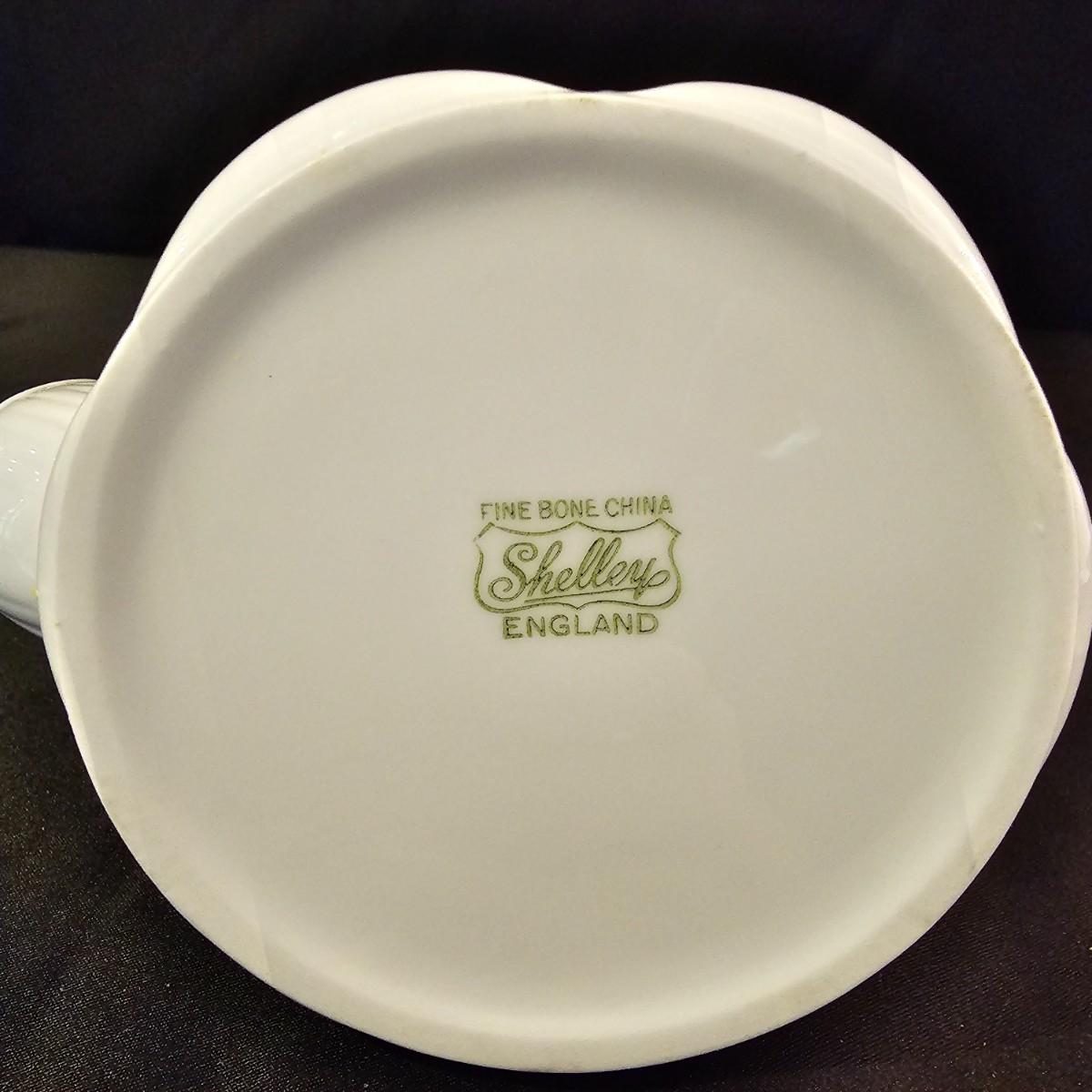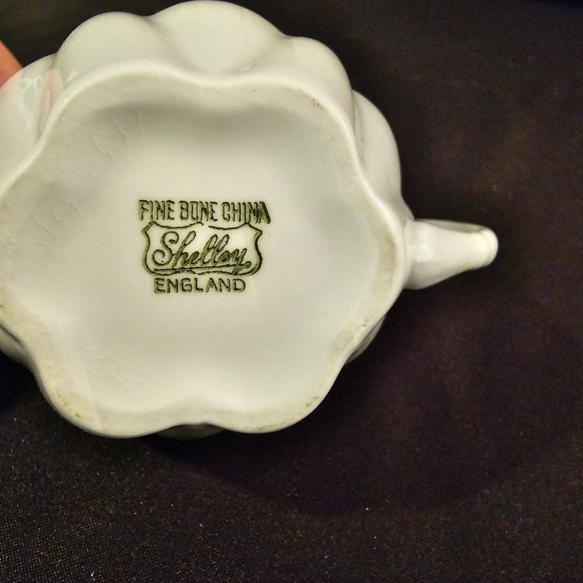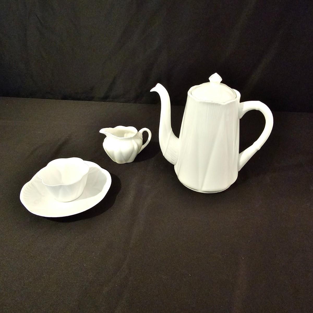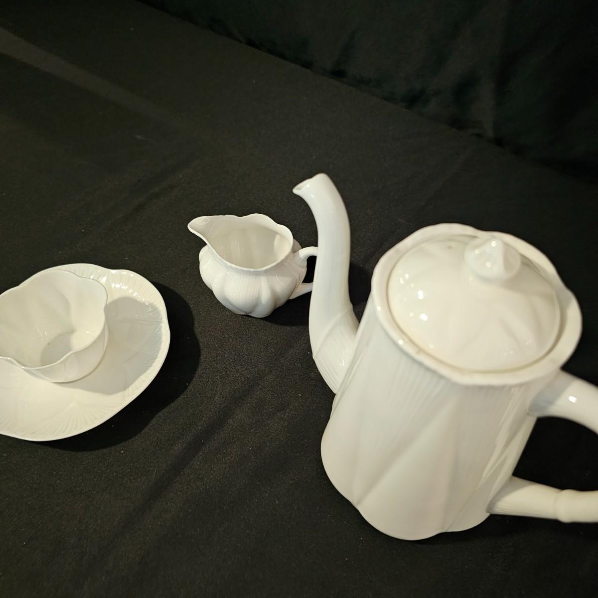 Delicate white bone china set by Shelley of England. Tea pot, cup & saucer and small pitcher in off white color. Teapot is 7" x 8"H, saucer is 5"D. See photos for details. Shipping available