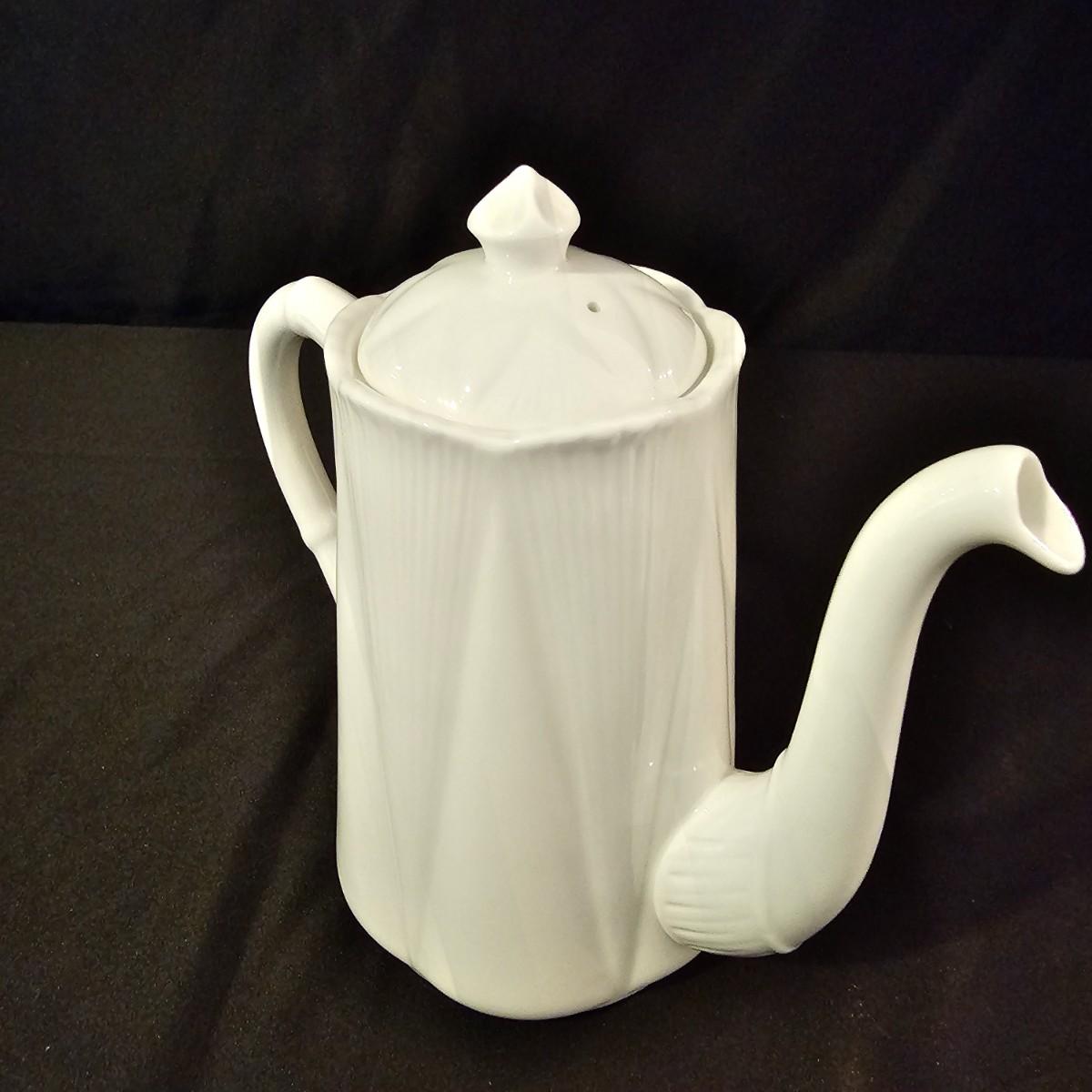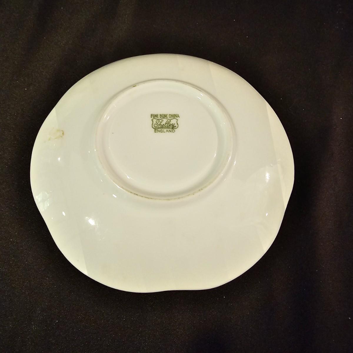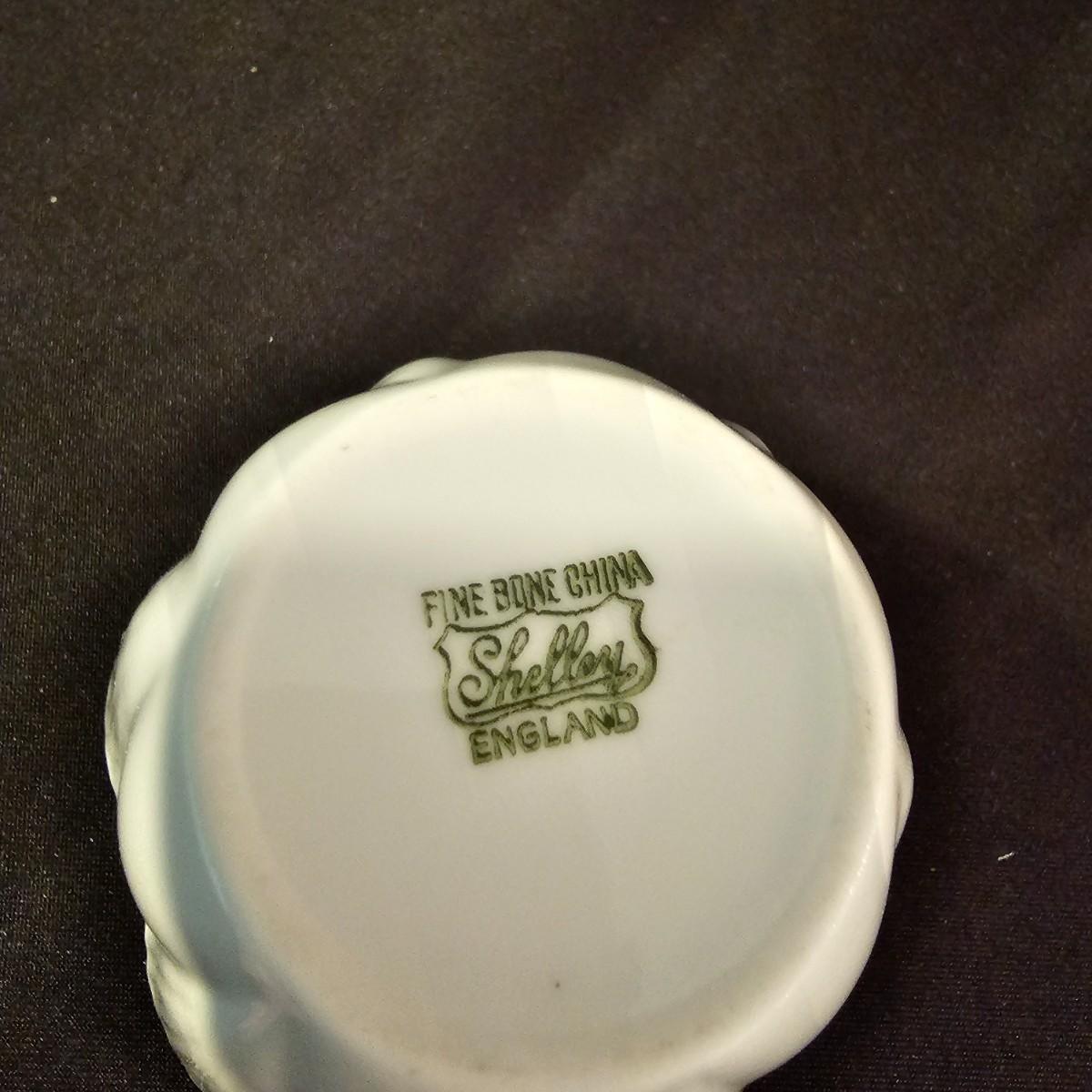 Delicate white bone china set by Shelley of England. Tea pot, cup & saucer and small pitcher in off white color. Teapot is 7" x 8"H, saucer is 5"D. See photos for details. Shipping available