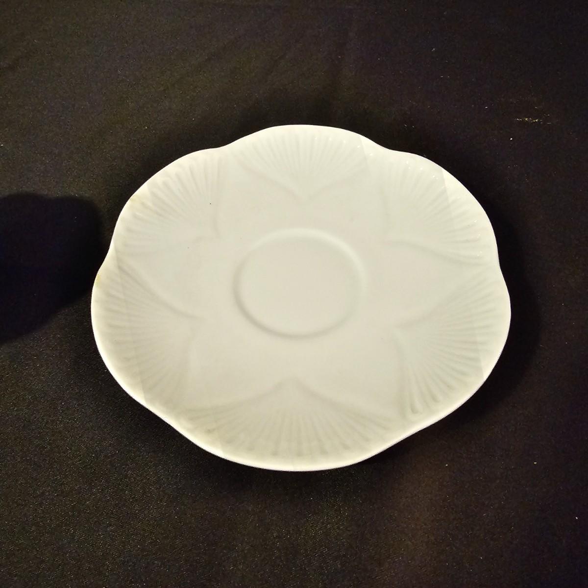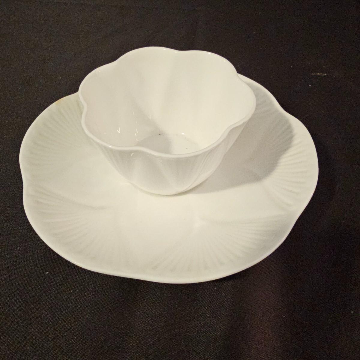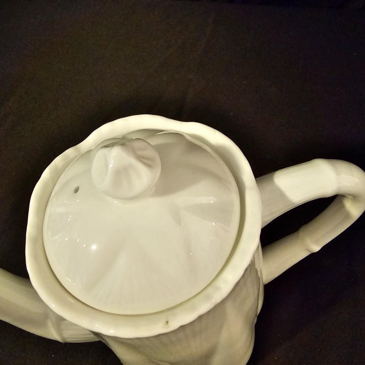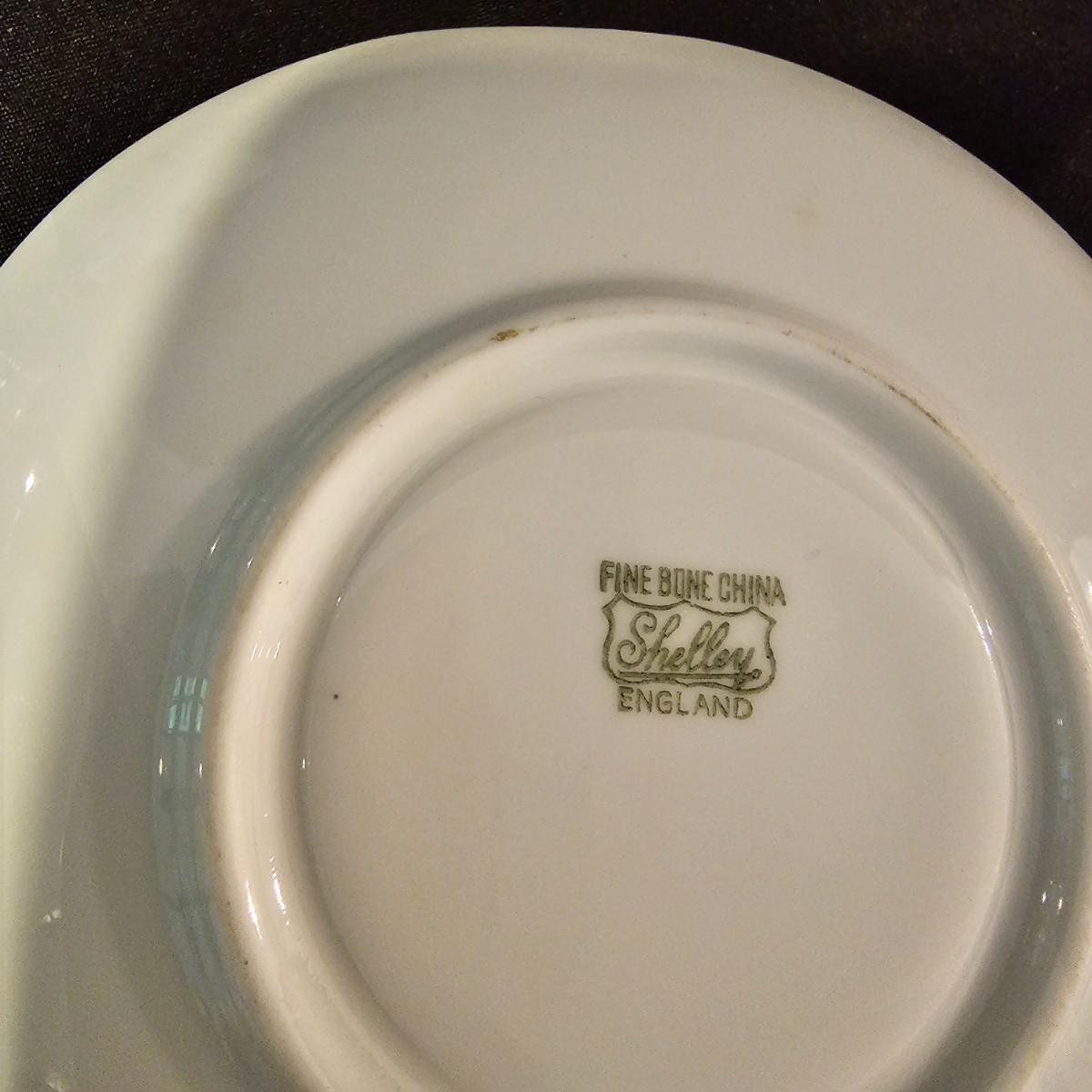 Delicate white bone china set by Shelley of England. Tea pot, cup & saucer and small pitcher in off white color. Teapot is 7" x 8"H, saucer is 5"D. See photos for details. Shipping available