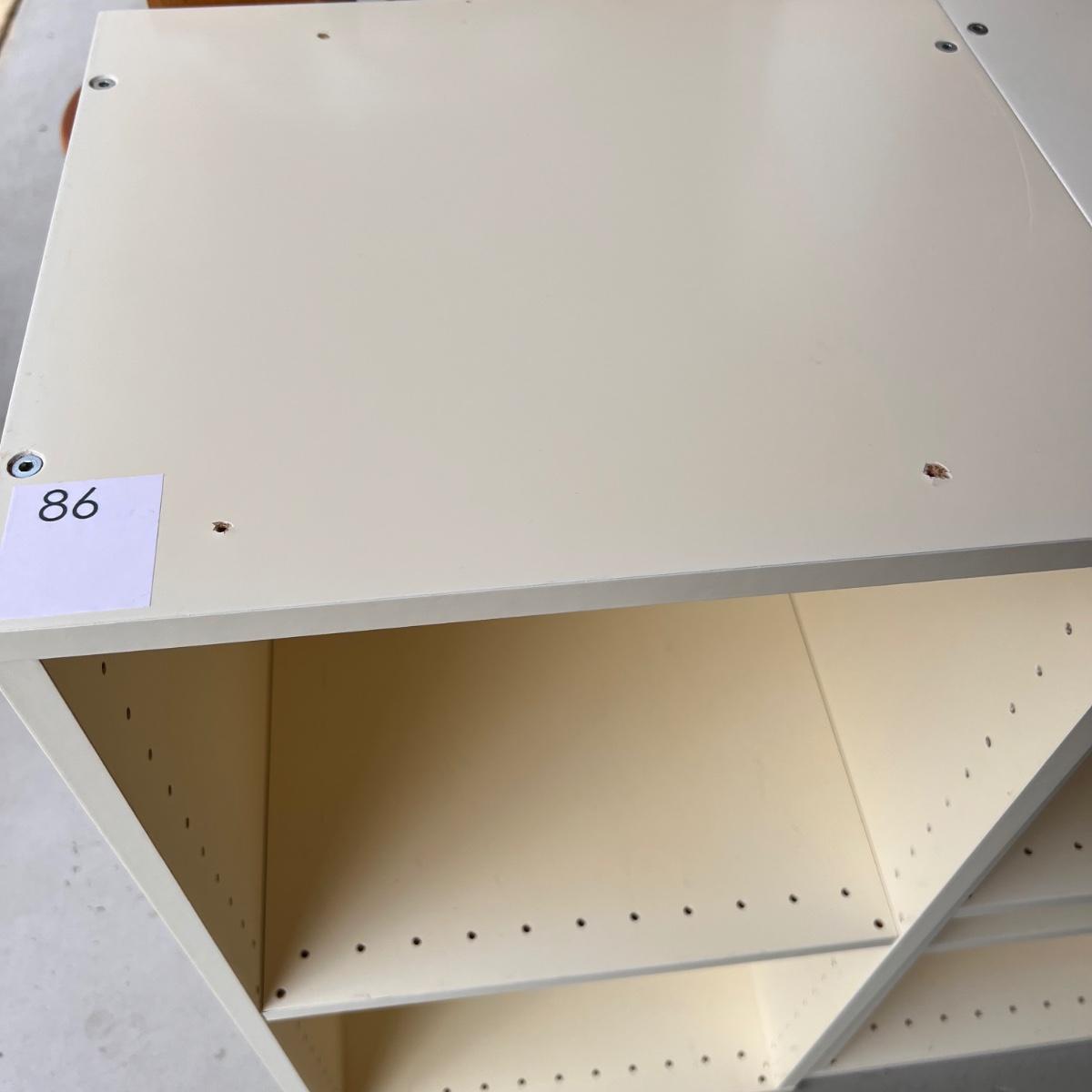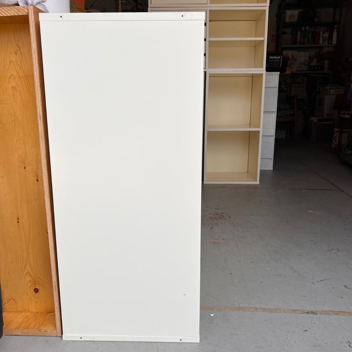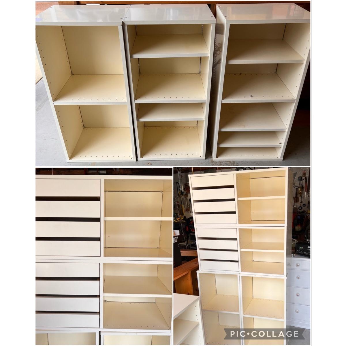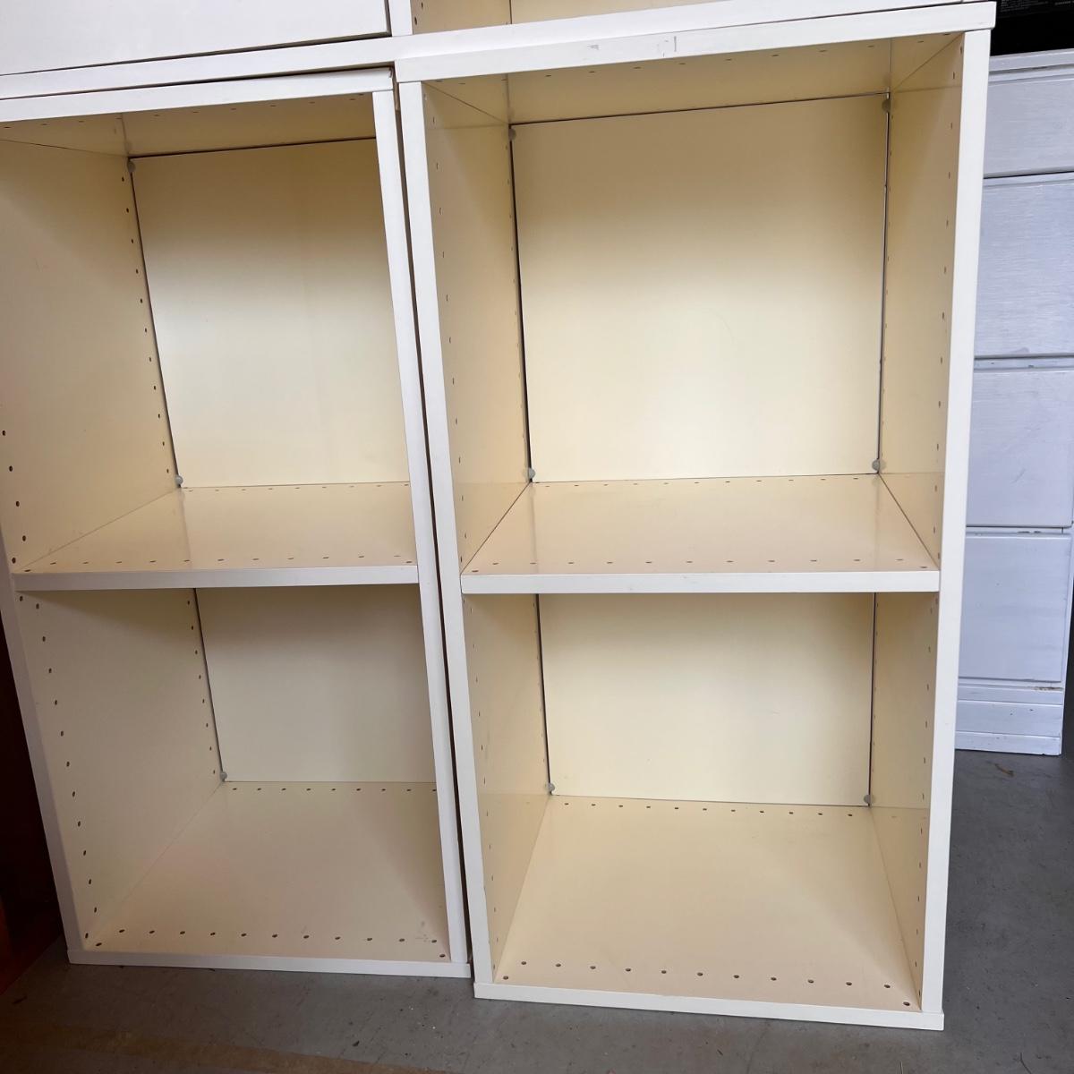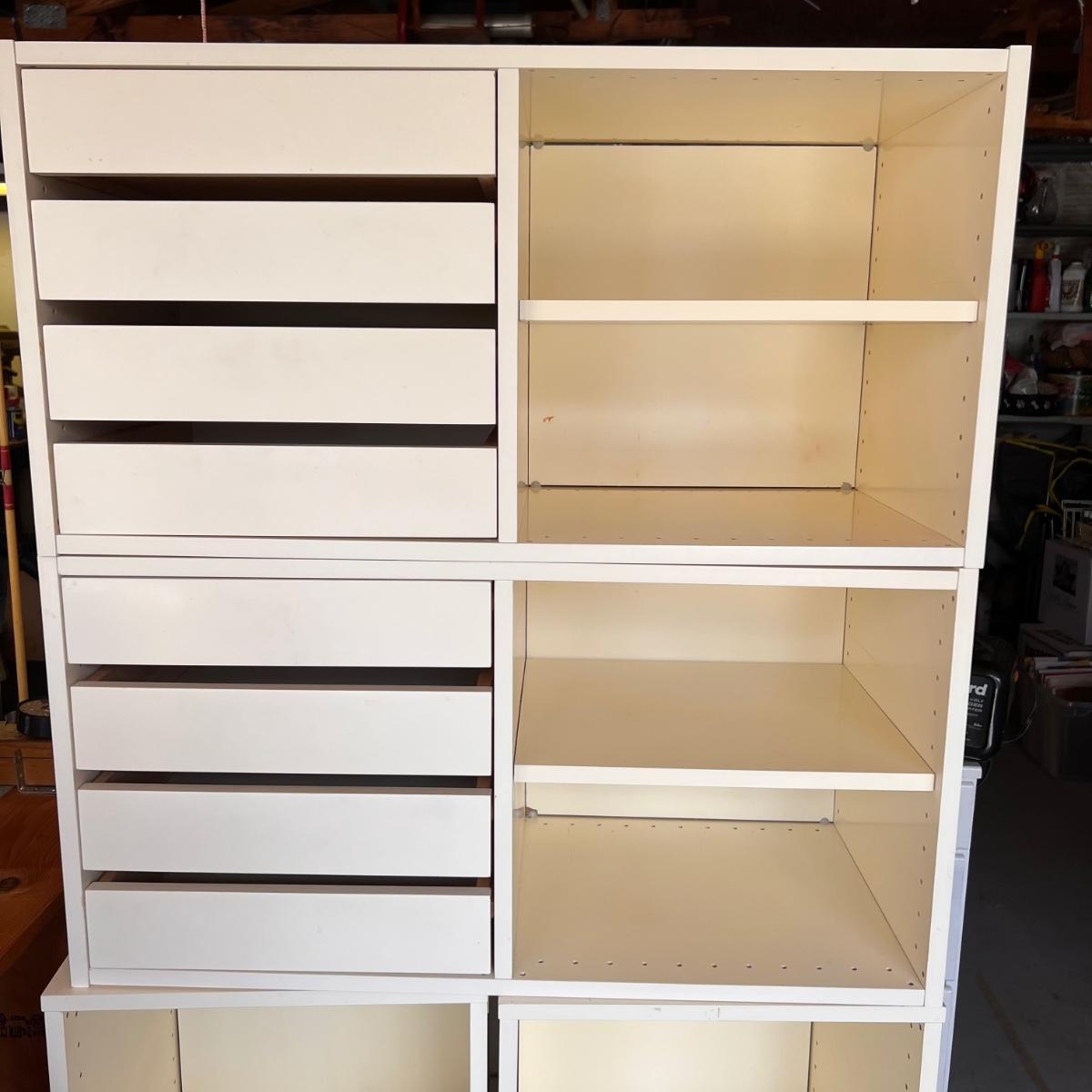 Shelves are removable, you can change the height of them. 5 have shelves, 2 have 4 drawers each. They're in good used condition, some small marks, scuffs. Some have holes in the tops where the owners had screwed them together to stack them as shown in the last picture. Perfect for kids play room, craft room, office, etc.