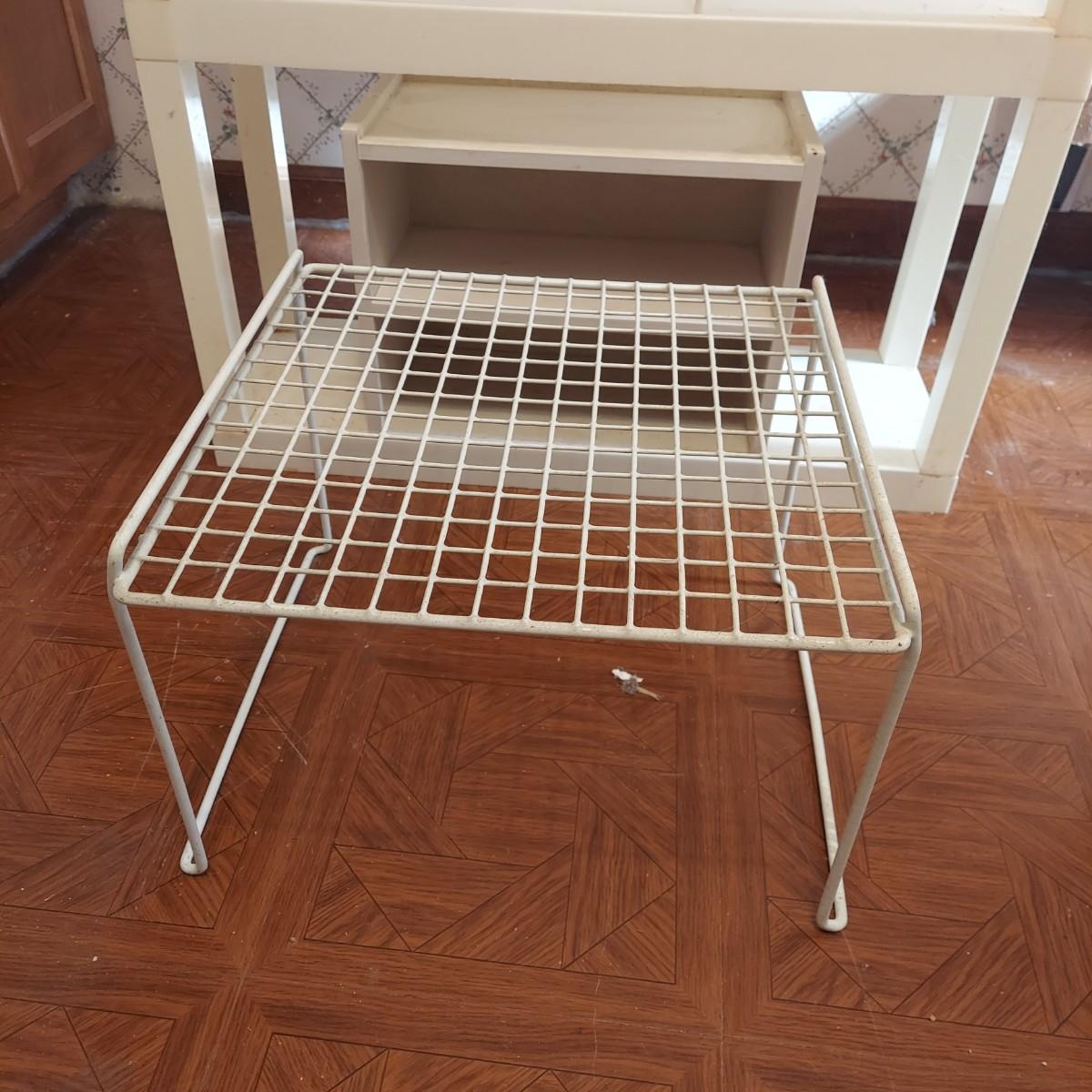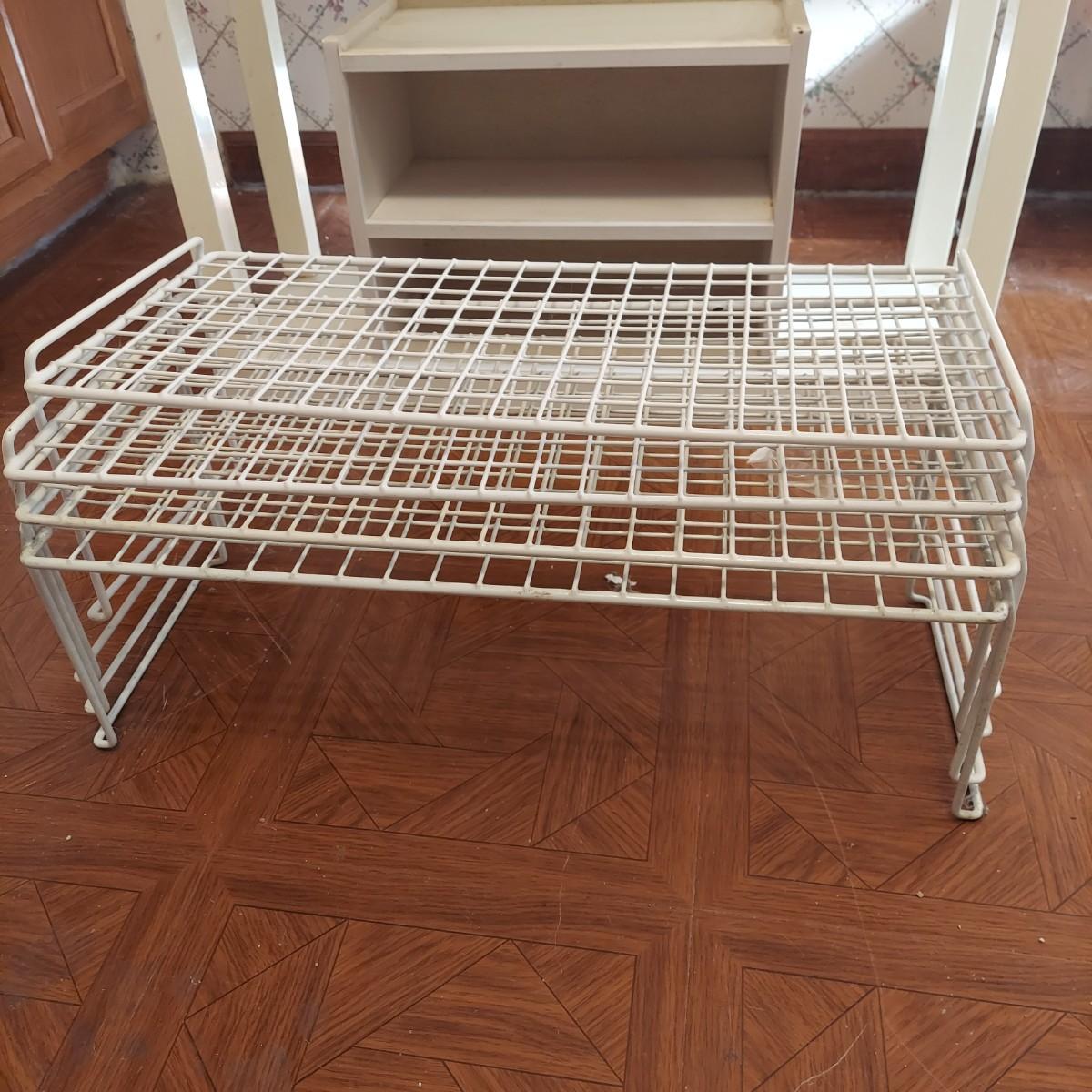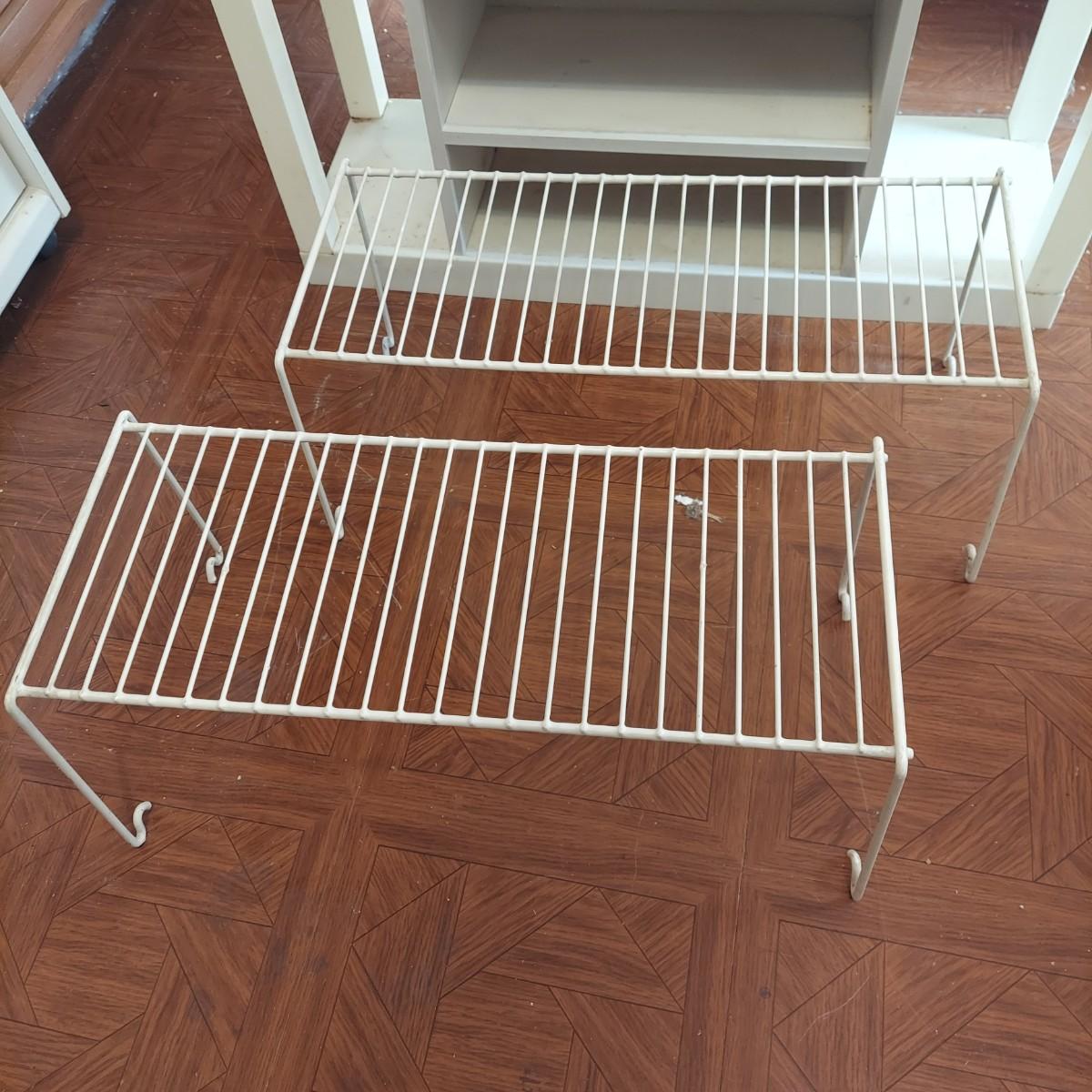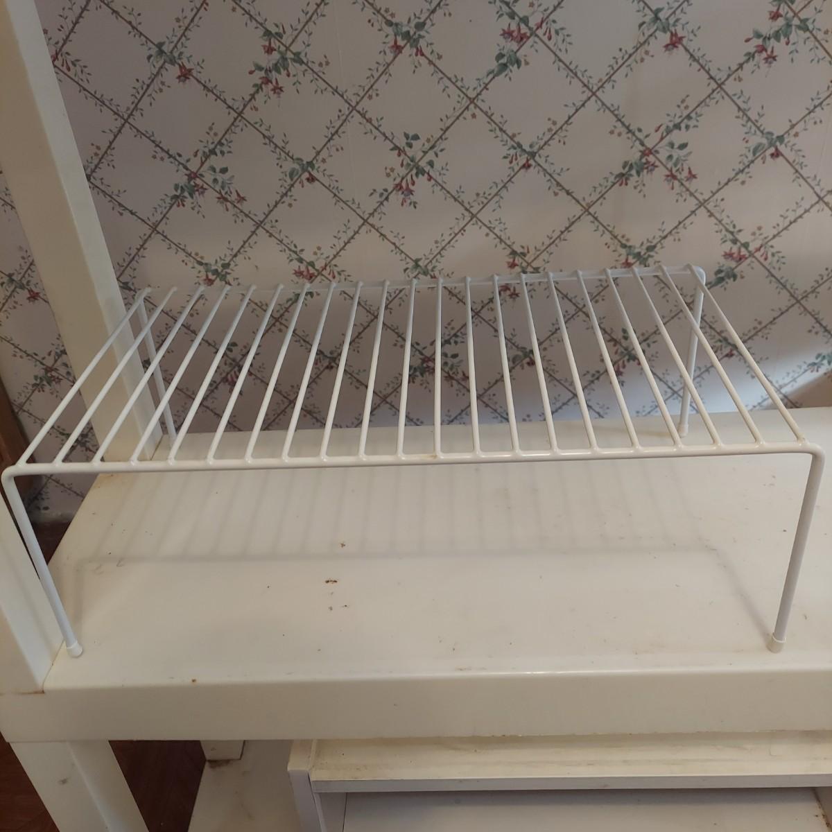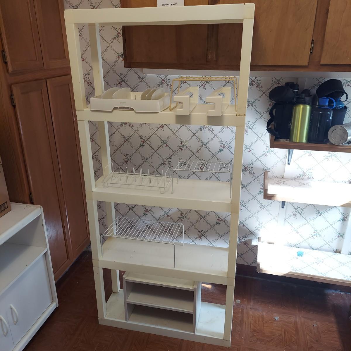 One set of plastic, pop together shelving. Plus several coated wire shelves for cabinet organization. The large shelf measures 30” x 10” x 66"H. Some surface debris. Items will need cleaned. Local Pickup Only
