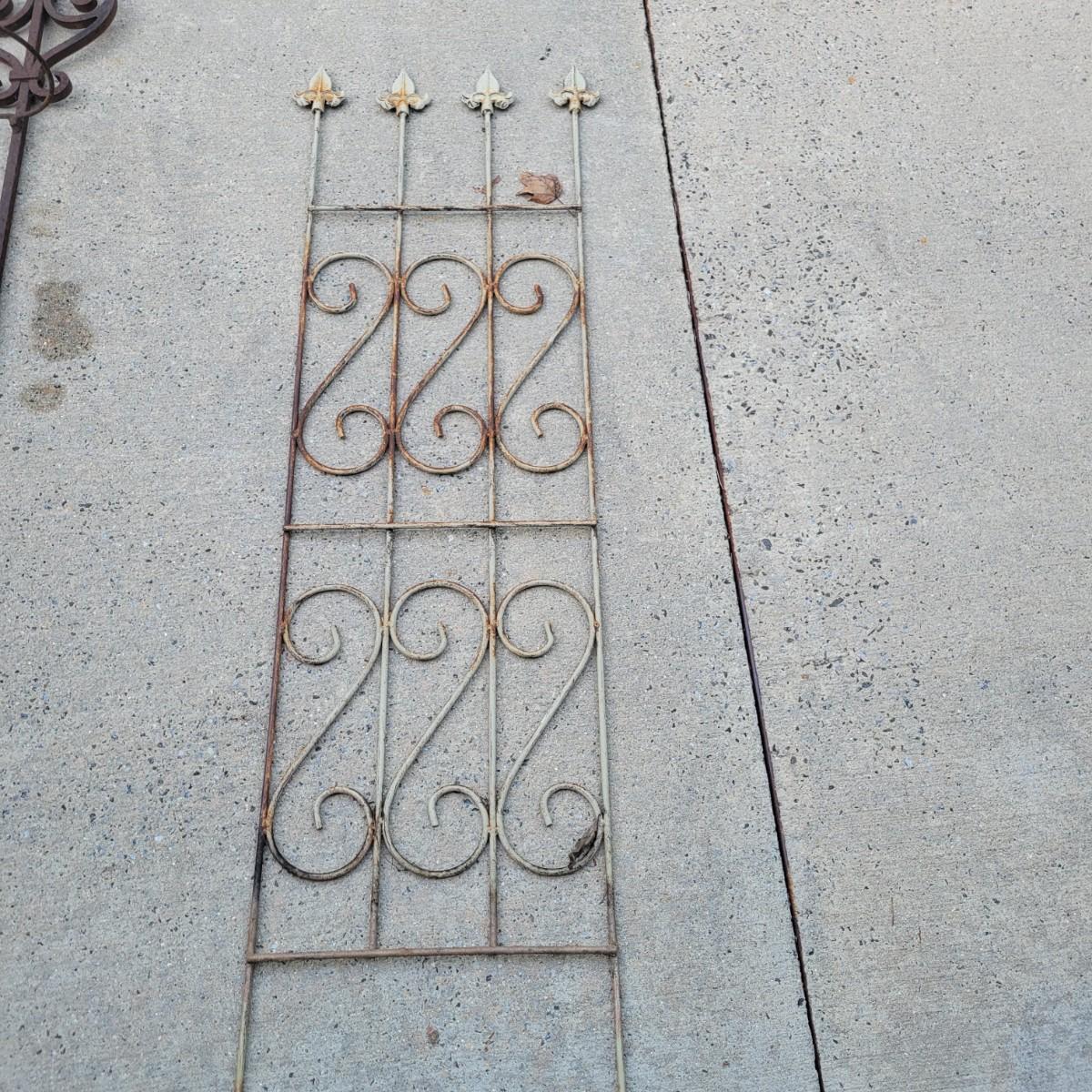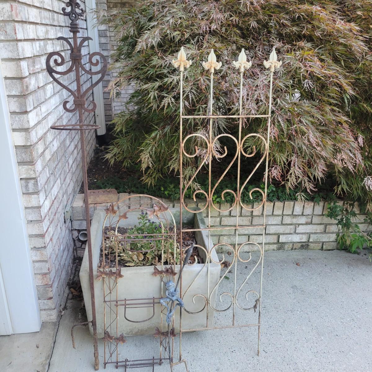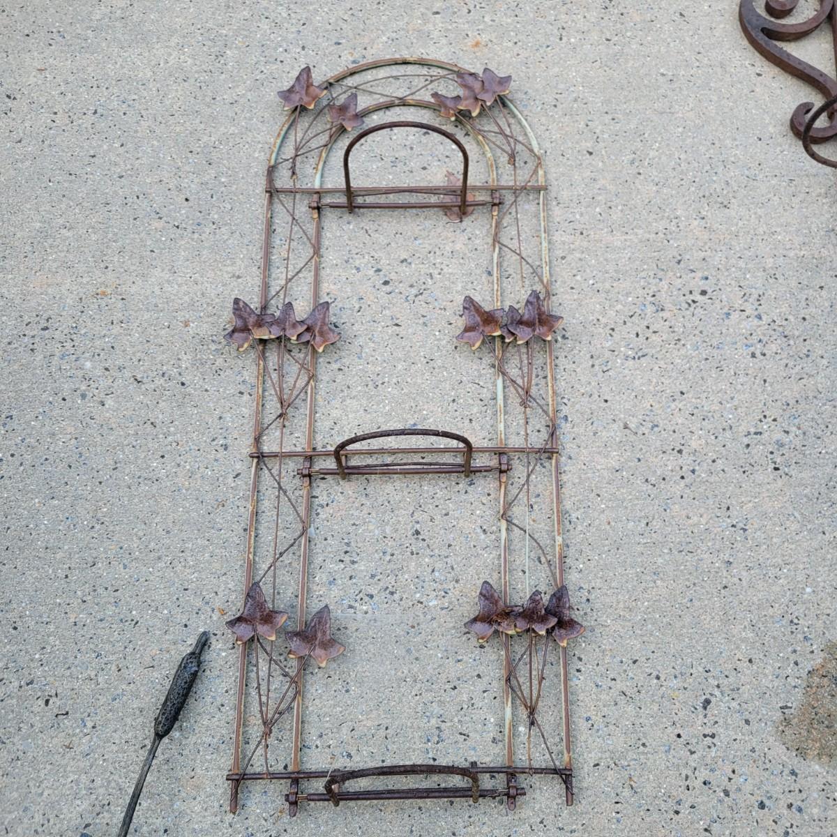 An assortment of metal and wrought iron yard art. Included is two shepards hooks, the largest measuring approximately 64"H. A metal, wall mounted plant stand with ivy accents, a frog on a cattail and more. Local pickup only