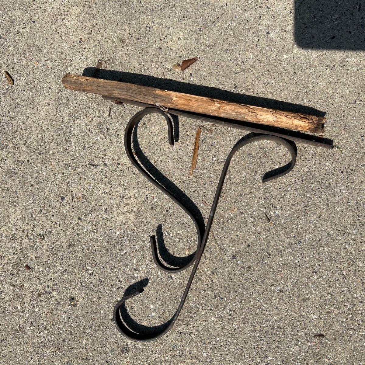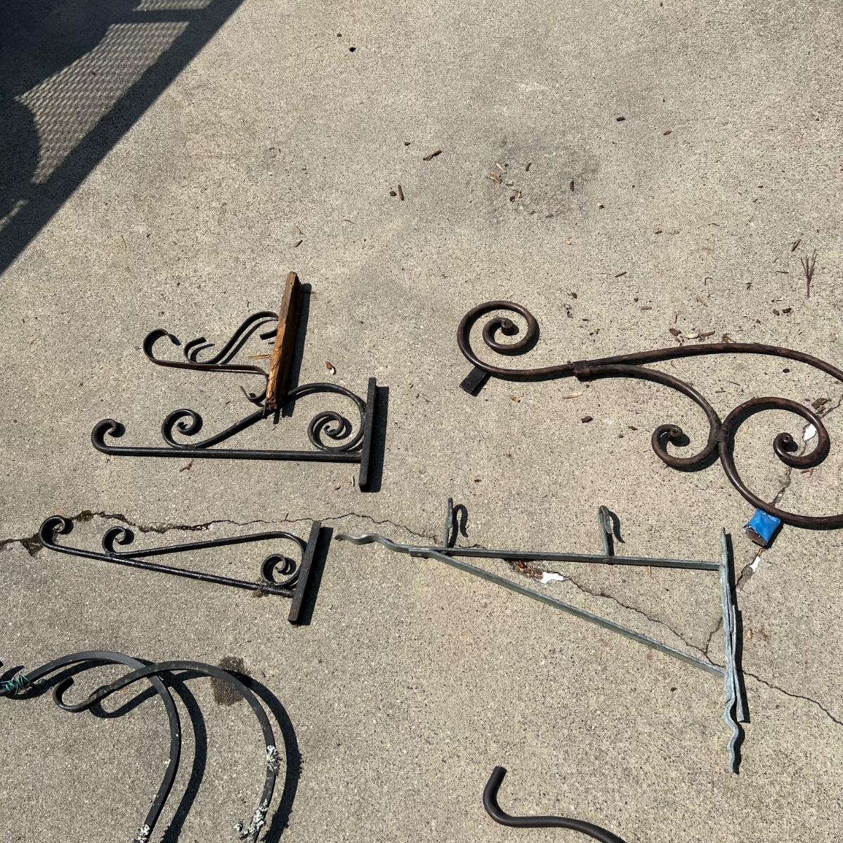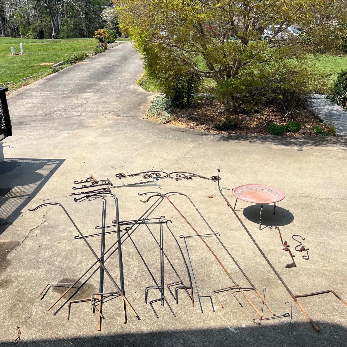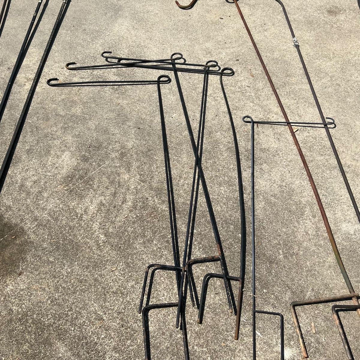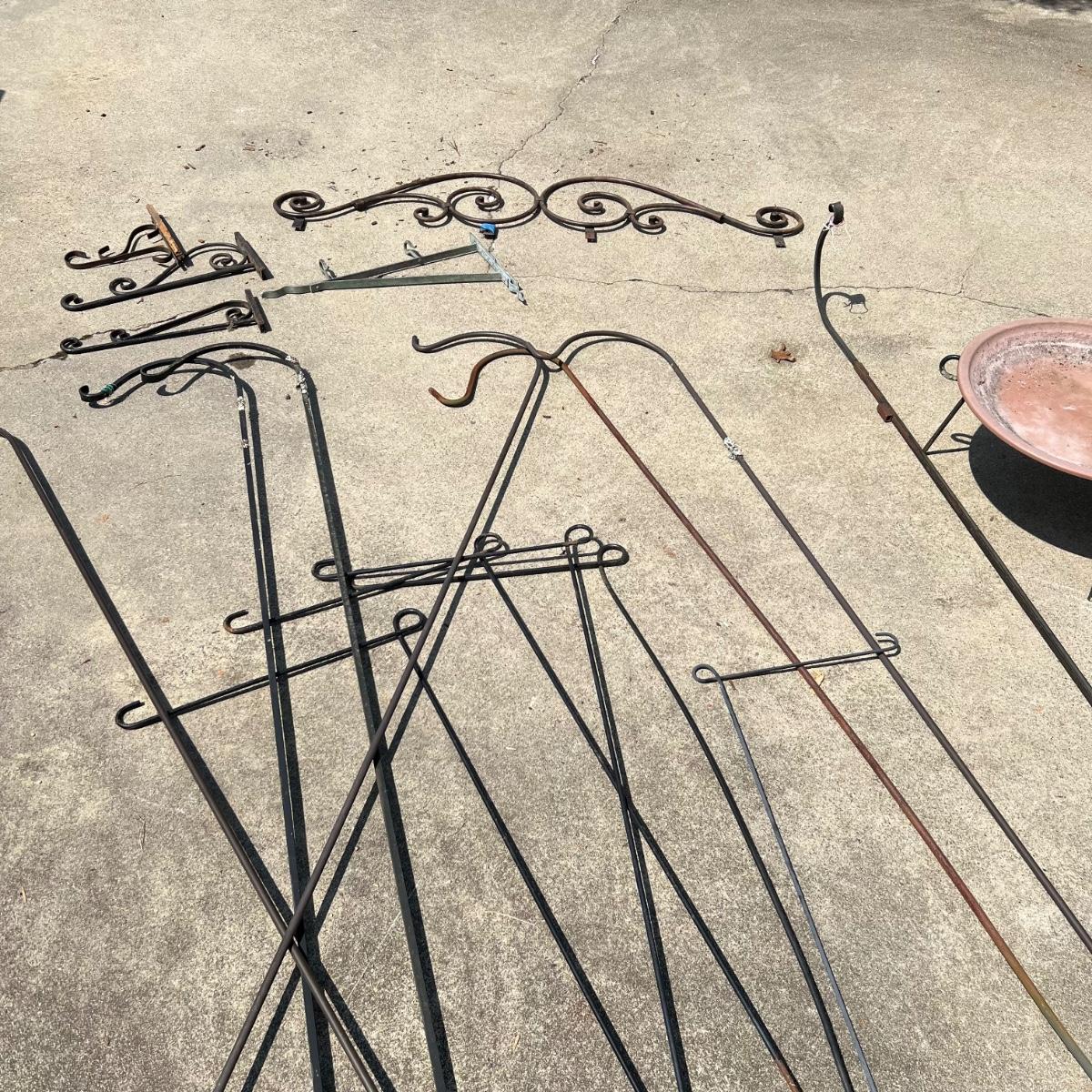 This metal lot includes seven shepherds hooks and five smaller stakes for hanging flags etc. lot also includes a few bracket hooks for the wall and a vintage metal long bracket that has a swirled scroll design which measures 58” wide x 18” H; screws are included. The pot stand has a plastic dish which is 21”D with 11” H metal stand.