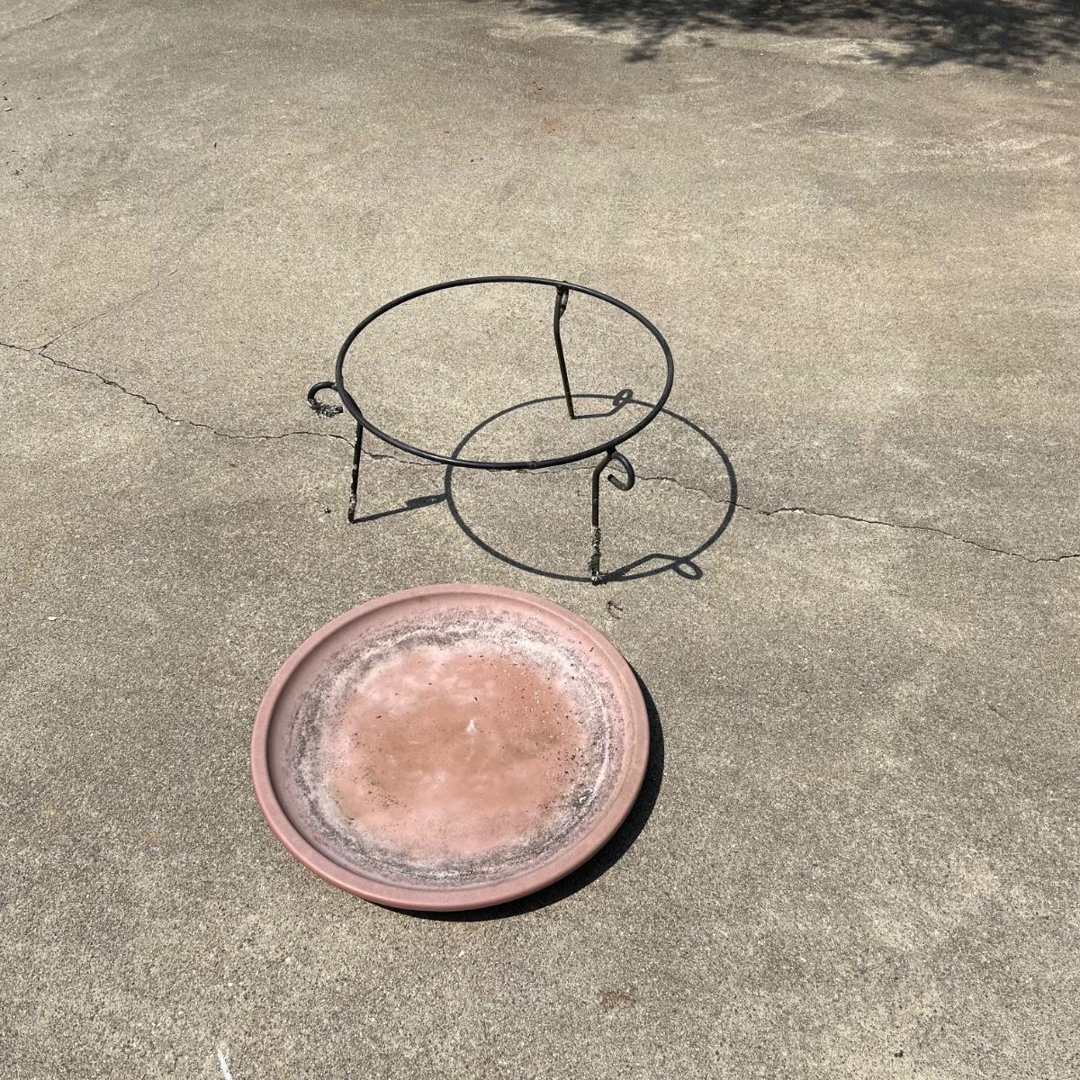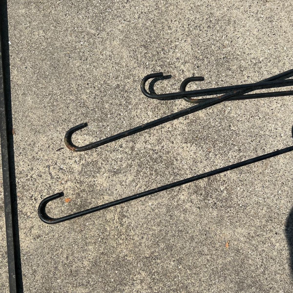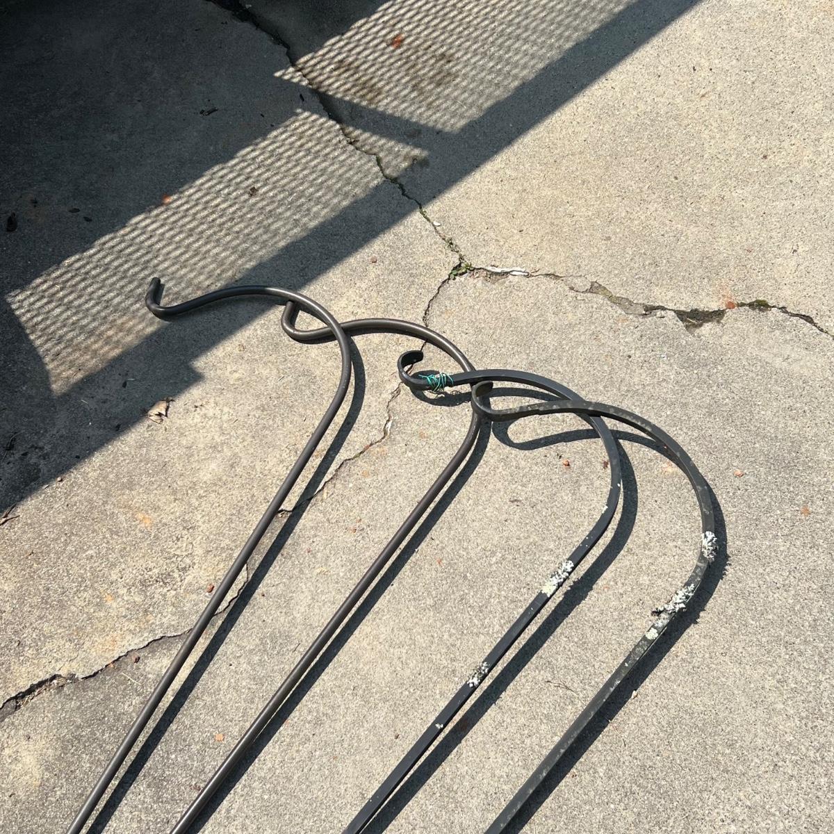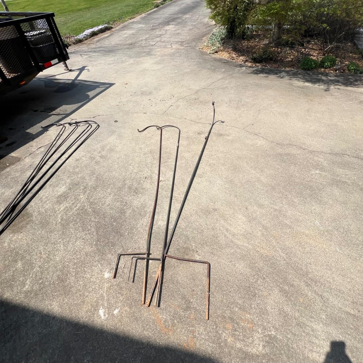 This metal lot includes seven shepherds hooks and five smaller stakes for hanging flags etc. lot also includes a few bracket hooks for the wall and a vintage metal long bracket that has a swirled scroll design which measures 58” wide x 18” H; screws are included. The pot stand has a plastic dish which is 21”D with 11” H metal stand.
